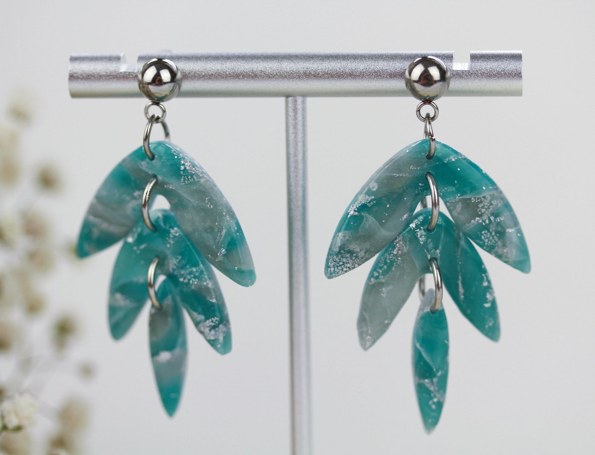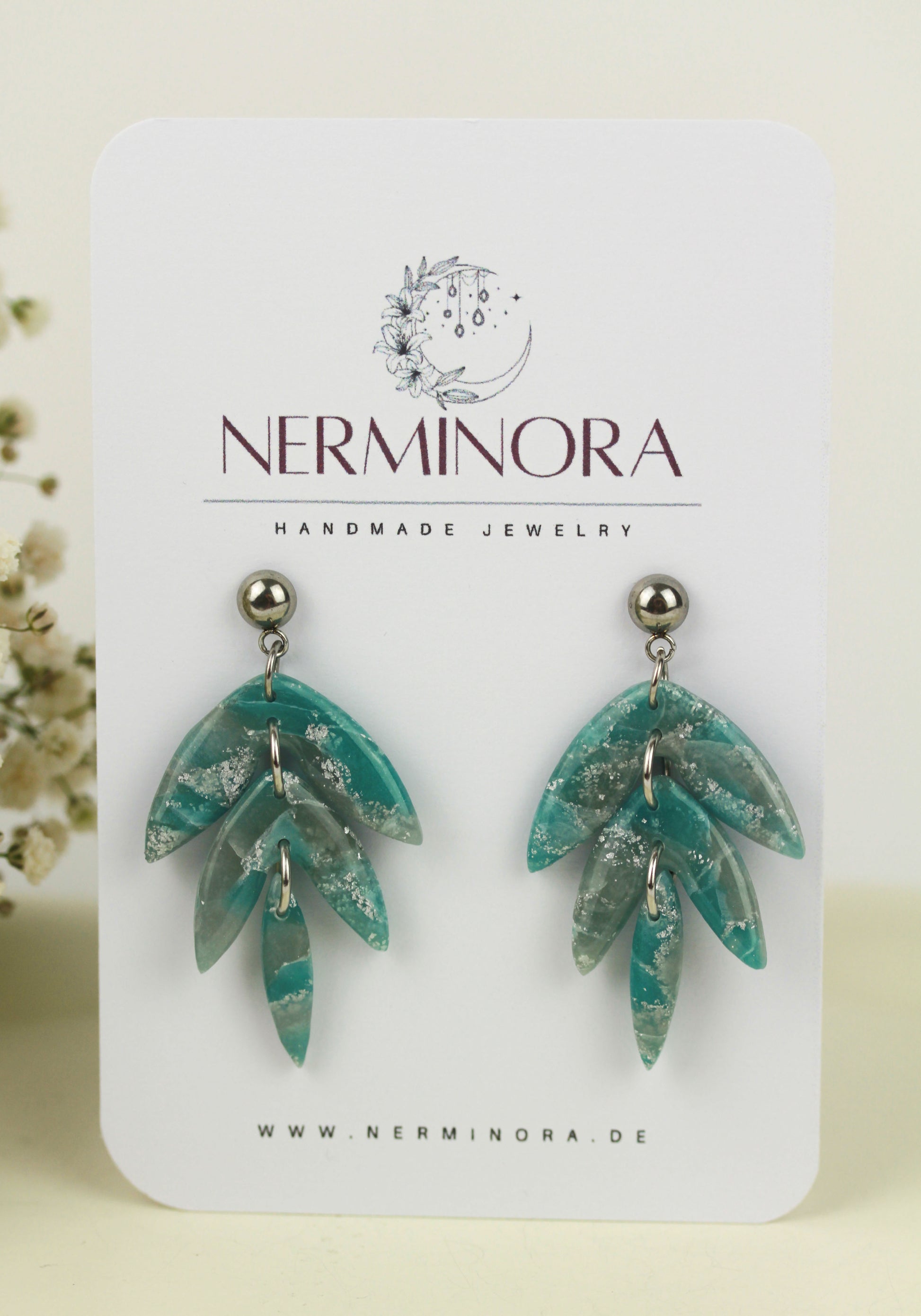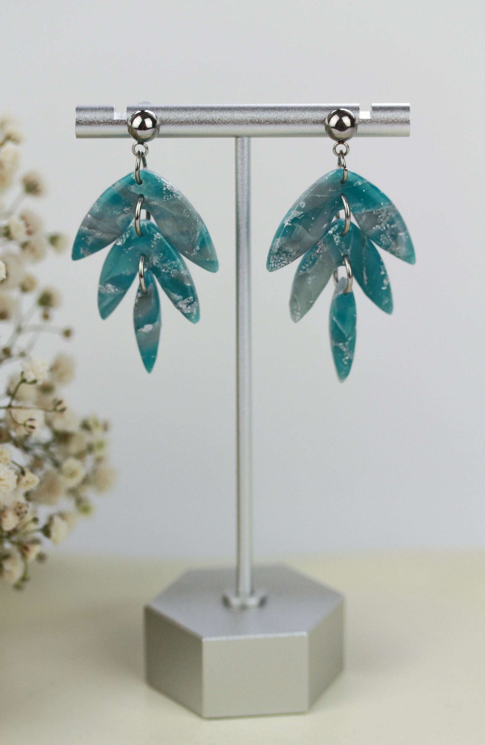 Aus handgemischten Farben formen sich zarte Einzelteile, die nach dem Härten behutsam geschliffen werden. Eine leichte Versiegelung sorgt – je nach Modell – für seidige Glätte und angenehmen Tragekomfort. Jedes Element wird mit Sorgfalt zusammengesetzt und zu einem einzigartigen Ohrring vollendet.