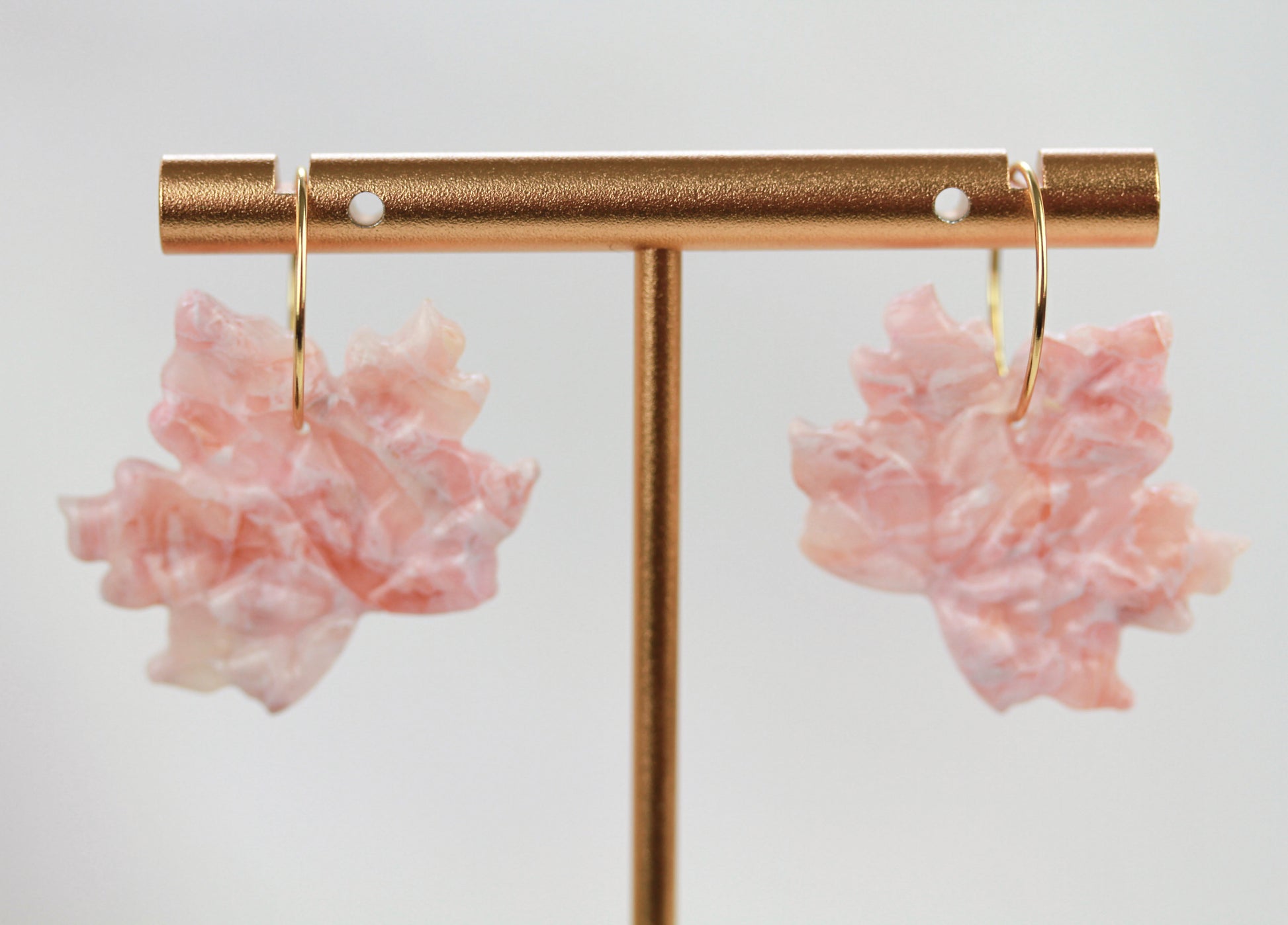 Aus handgemischten Farben formen sich zarte Einzelteile, die nach dem Härten behutsam geschliffen werden. Eine leichte Versiegelung sorgt – je nach Modell – für seidige Glätte und angenehmen Tragekomfort. Jedes Element wird mit Sorgfalt zusammengesetzt und zu einem einzigartigen Ohrring vollendet.