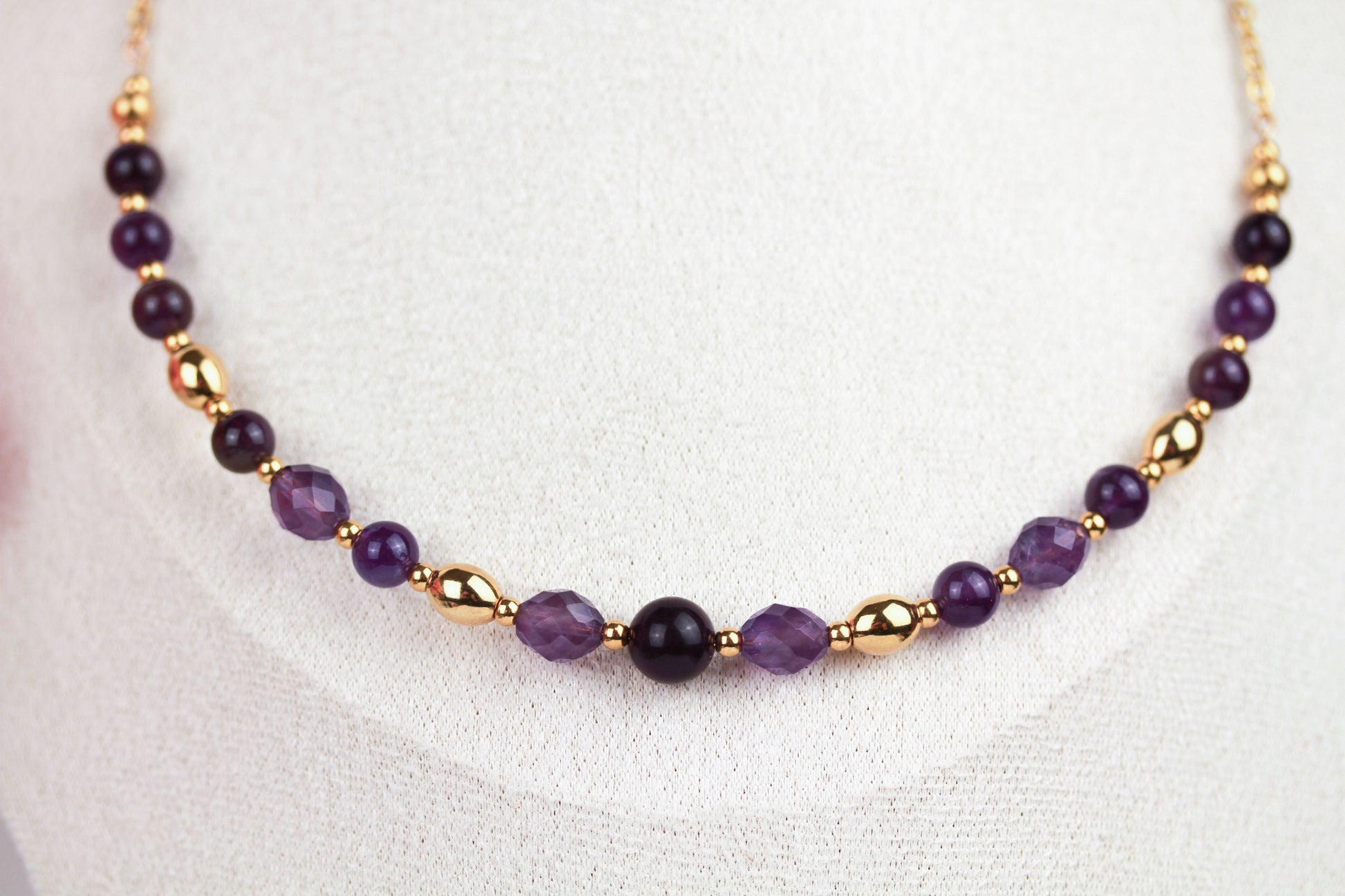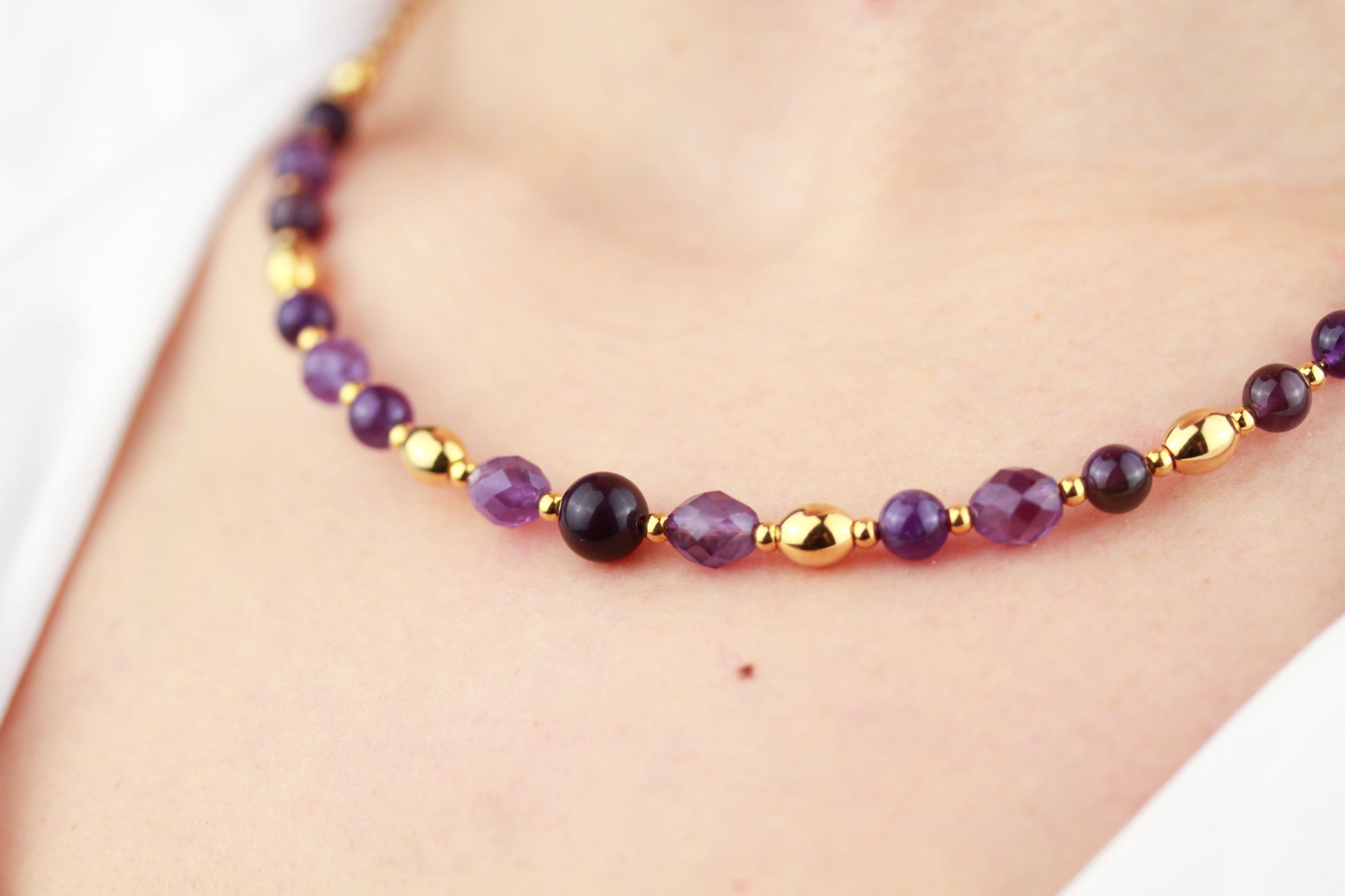 Diese zeitlose Halskette vereint facettierte und runde Amethyst-Perlen mit goldfarbenen Edelstahlperlen zu einem ausdrucksstarken Schmuckstück.