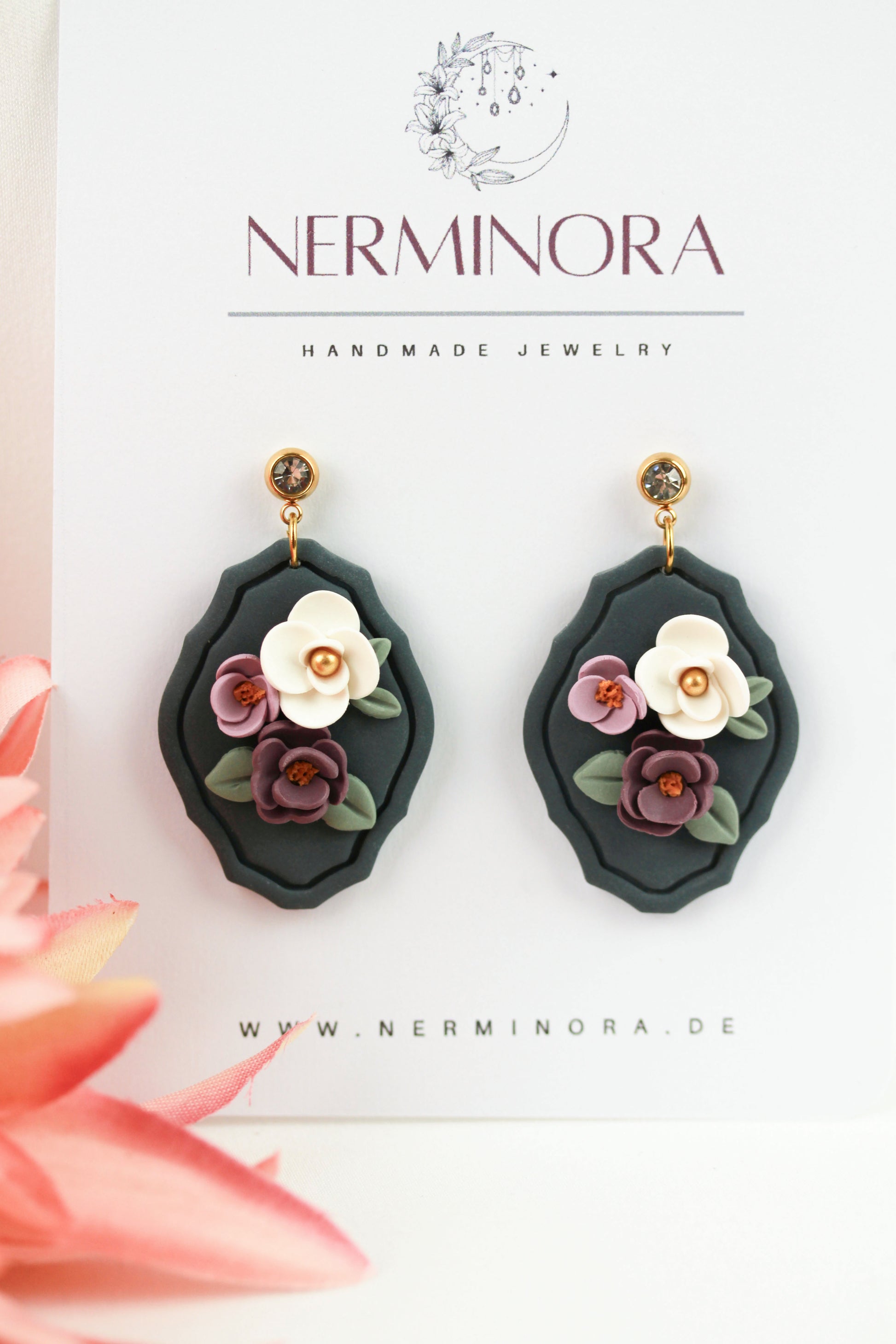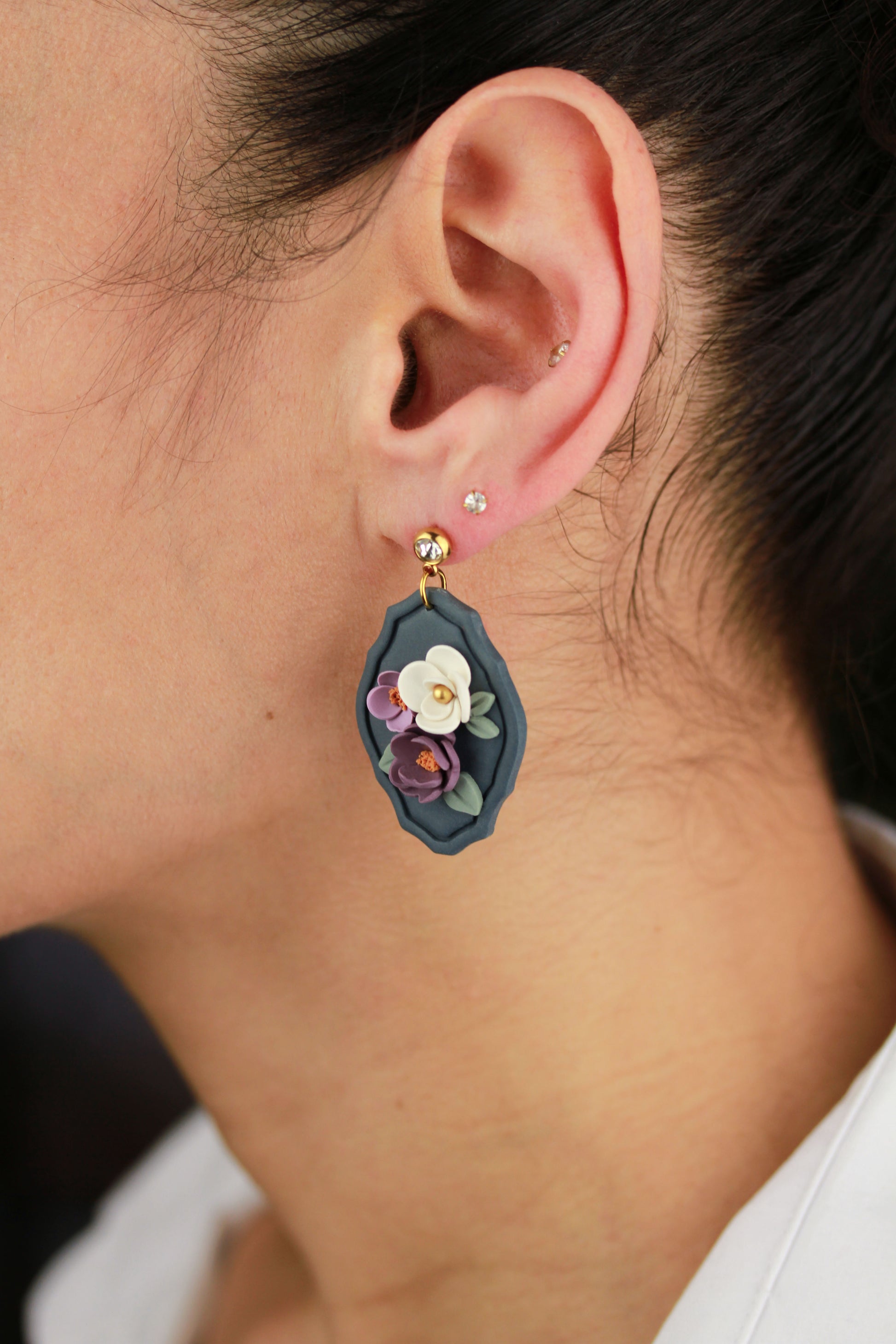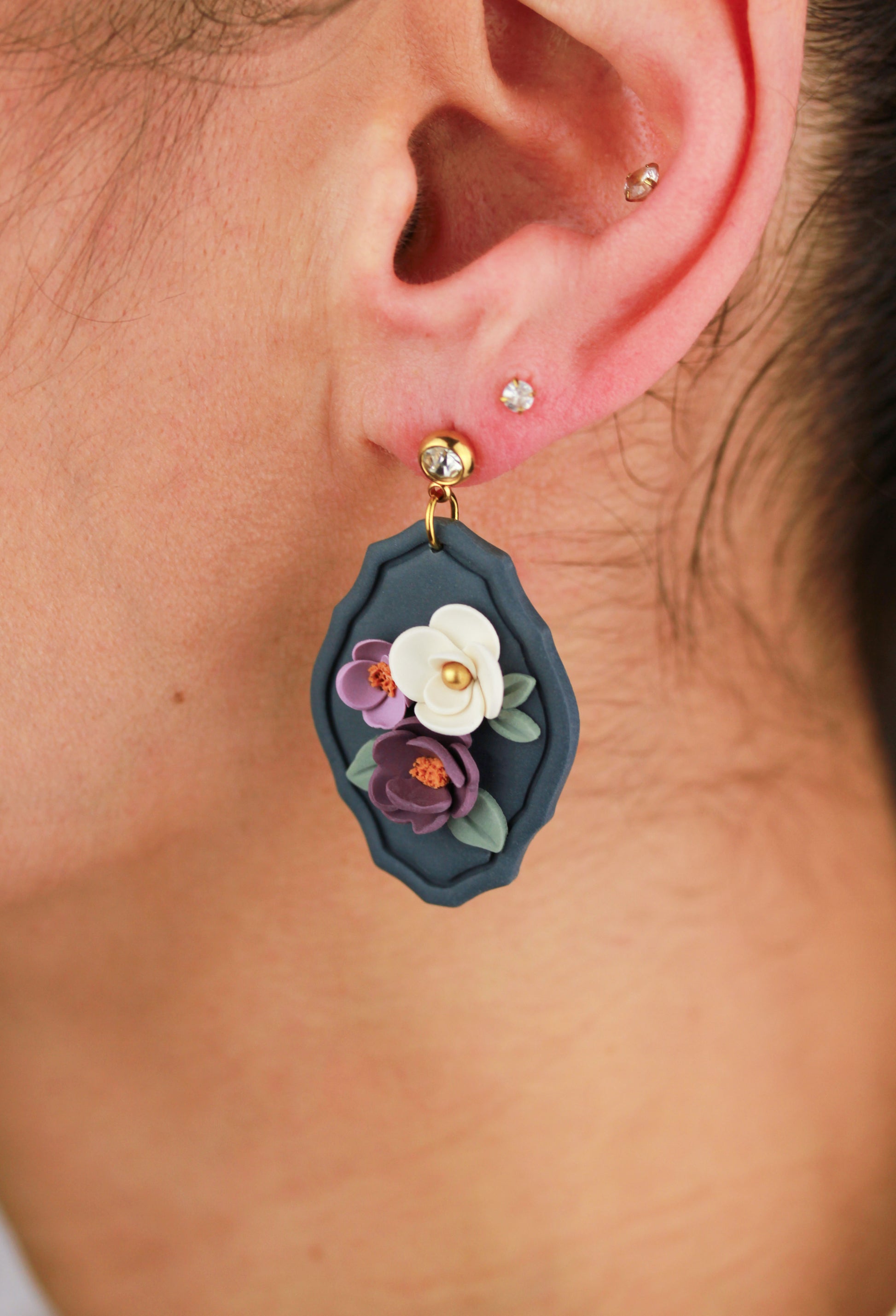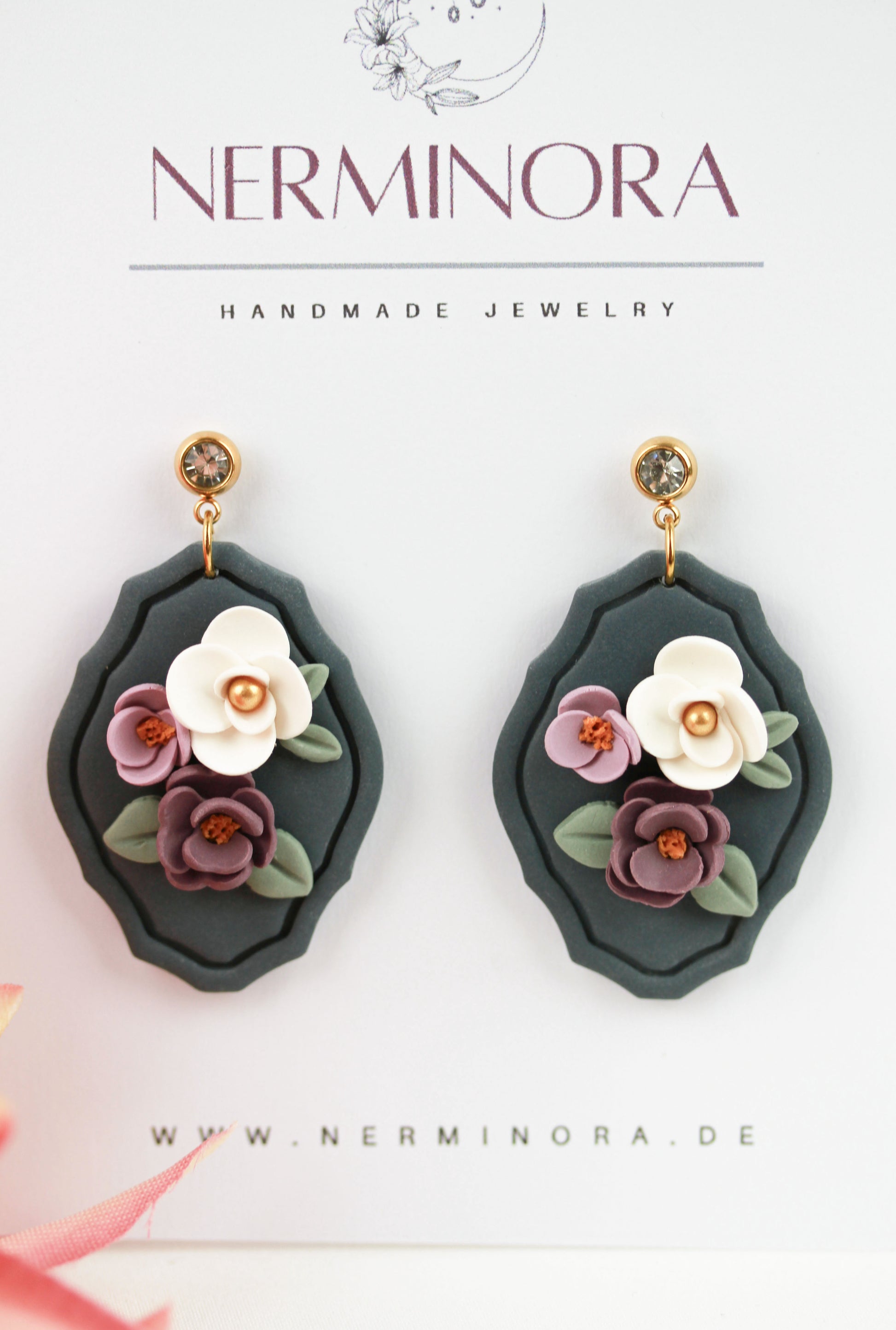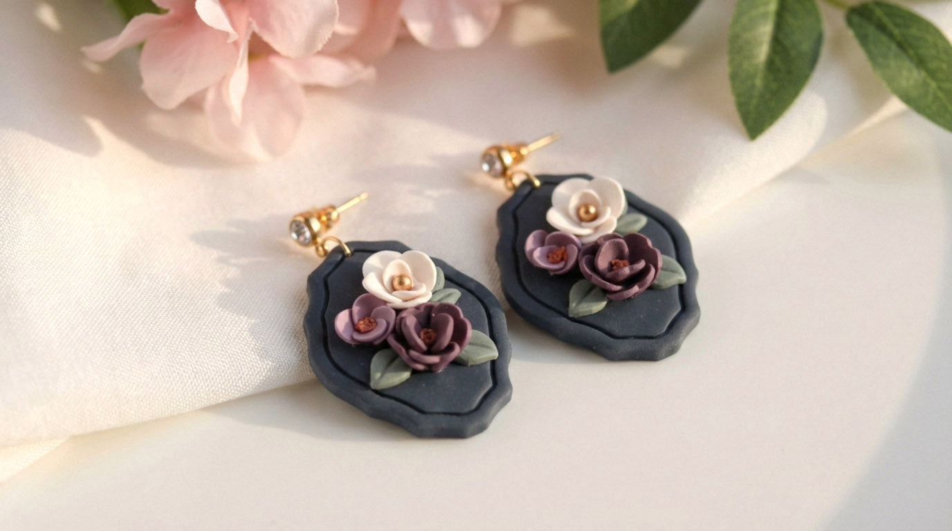 Aus handgemischten Farben formen sich zarte Einzelteile, die nach dem Härten behutsam geschliffen werden. Eine leichte Versiegelung sorgt – je nach Modell – für seidige Glätte und angenehmen Tragekomfort. Jedes Element wird mit Sorgfalt zusammengesetzt und zu einem einzigartigen Ohrring vollendet.