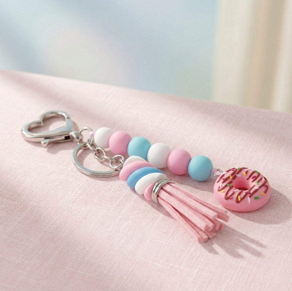Dieser verspielte Schlüsselanhänger kombiniert süße Marshmallow- und Donut-Charmes und Perlen mit einer farblich abgestimmten Quaste. Ein fröhliches Accessoire, das jedem Schlüsselbund einen lebendigen und einzigartigen Look verleiht – perfekt, um gute Laune unterwegs dabei zu haben!