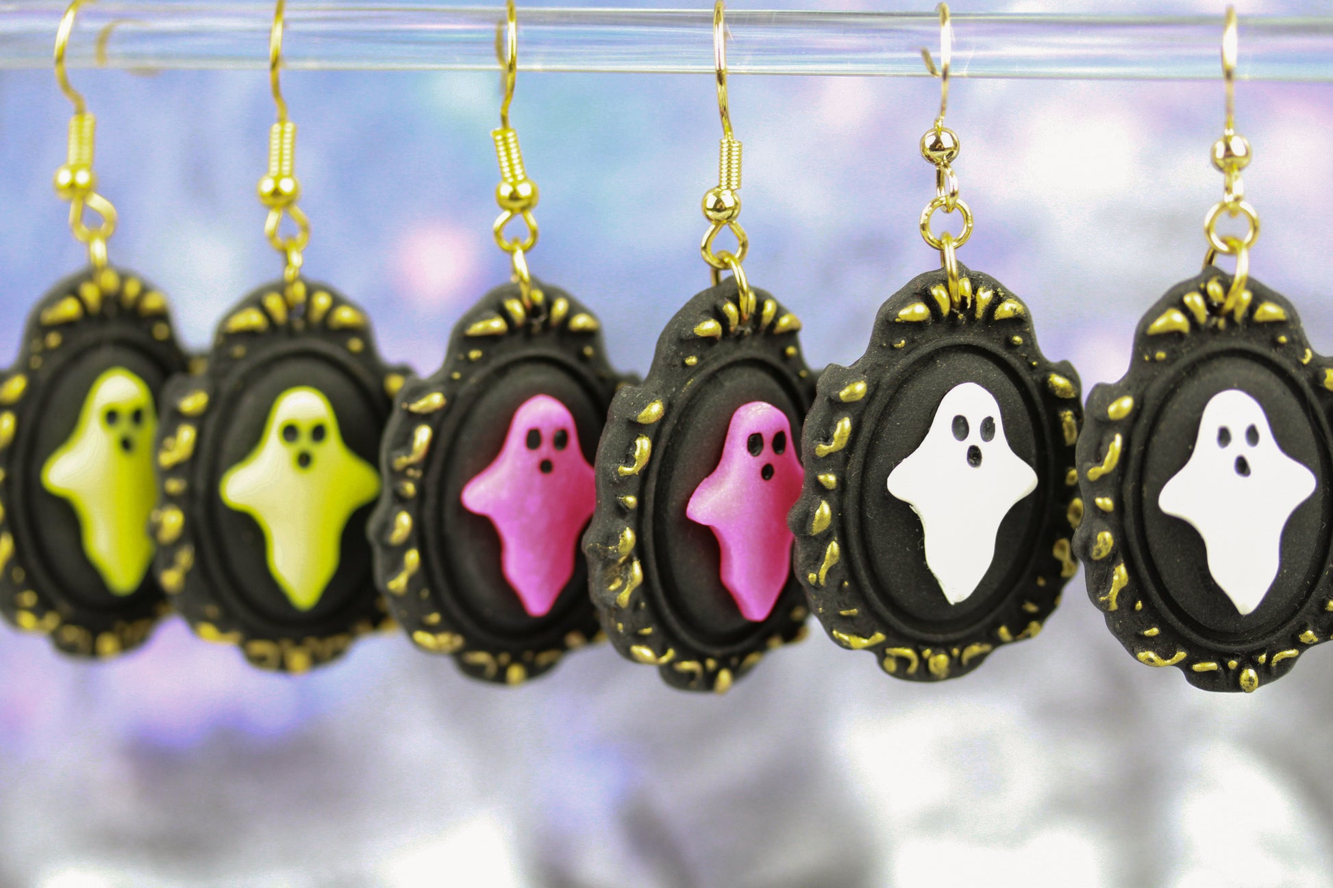 Diese Geister Bilderrahmen Ohrringe aus Polymer Clay sind in drei verschiedenen Farben erhältlich und bringen mit ihren gelb- und pinkfarbenen Glow-in-the-Dark-Details Spaß in jede Halloween-Party. Sie leuchten im Dunkeln und schenken deinem Look eine verspielte und außergewöhnliche Note, die garantiert für Aufsehen sorgt!