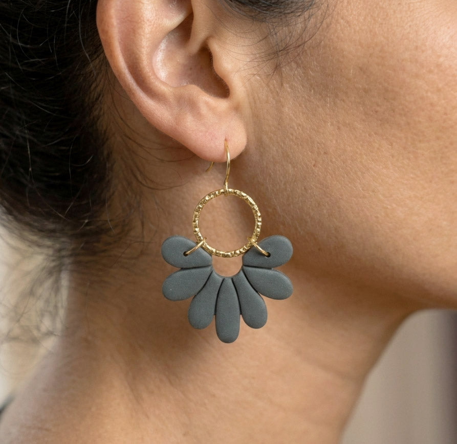 Aus handgemischten Farben formen sich zarte Einzelteile, die nach dem Härten behutsam geschliffen werden. Eine leichte Versiegelung sorgt – je nach Modell – für seidige Glätte und angenehmen Tragekomfort. Jedes Element wird mit Sorgfalt zusammengesetzt und zu einem einzigartigen Ohrring vollendet.