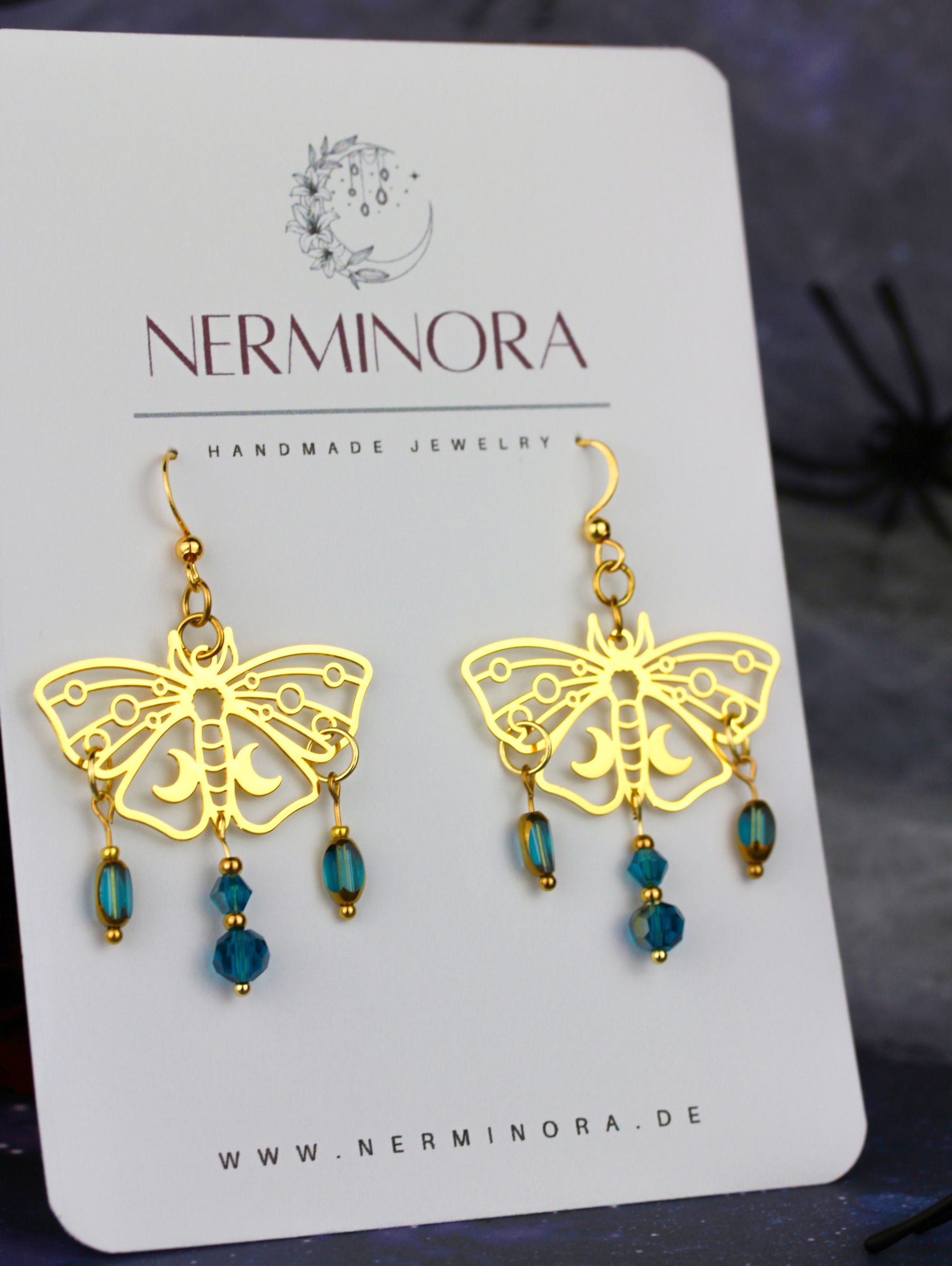 Inspiriert von der geheimnisvollen Schönheit der Nacht vereinen diese Ornament-Motten Ohrringe filigrane Formen mit dem schimmernden Zusammenspiel von Blau und Gold.