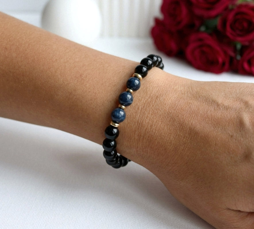 Schwarzer Achat & Saphir-Jade Armband – Handgefertigtes Natursteinarmband