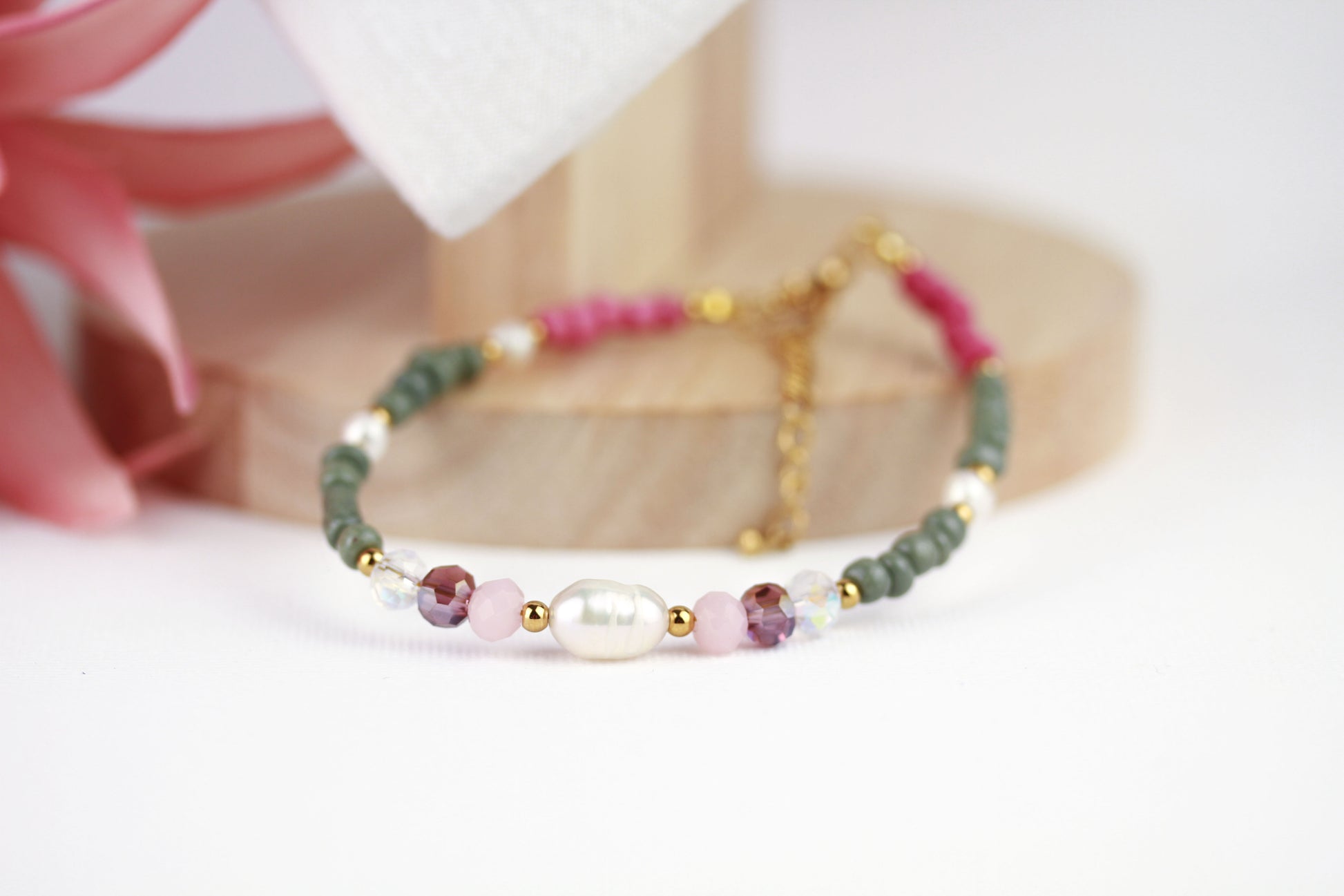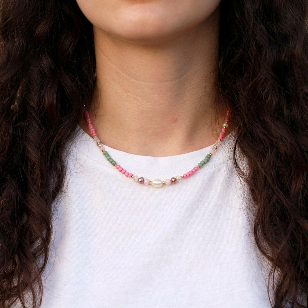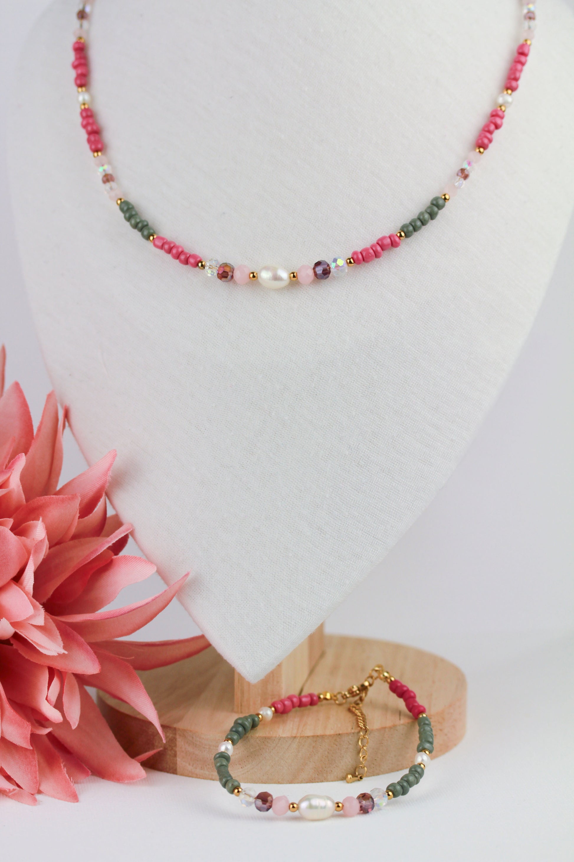 Dieses elegante Schmuckset vereint harmonisch grüne und altrosa Perlen mit hochwertigen Süßwasser- und Glasperlen. Ergänzt durch langlebige Edelstahlkomponenten, bietet es eine ausgewogene Kombination aus Farbvielfalt und Beständigkeit.