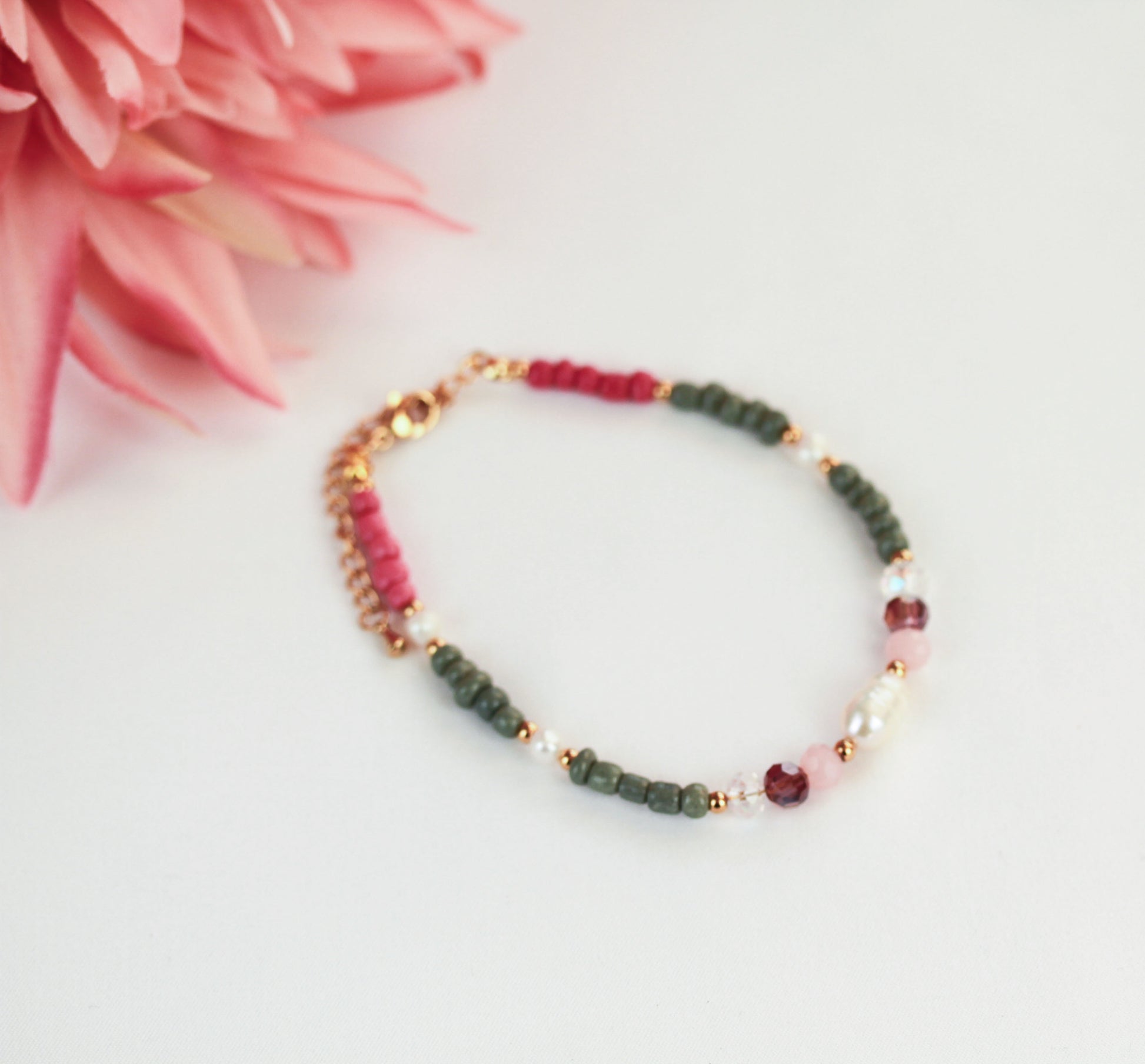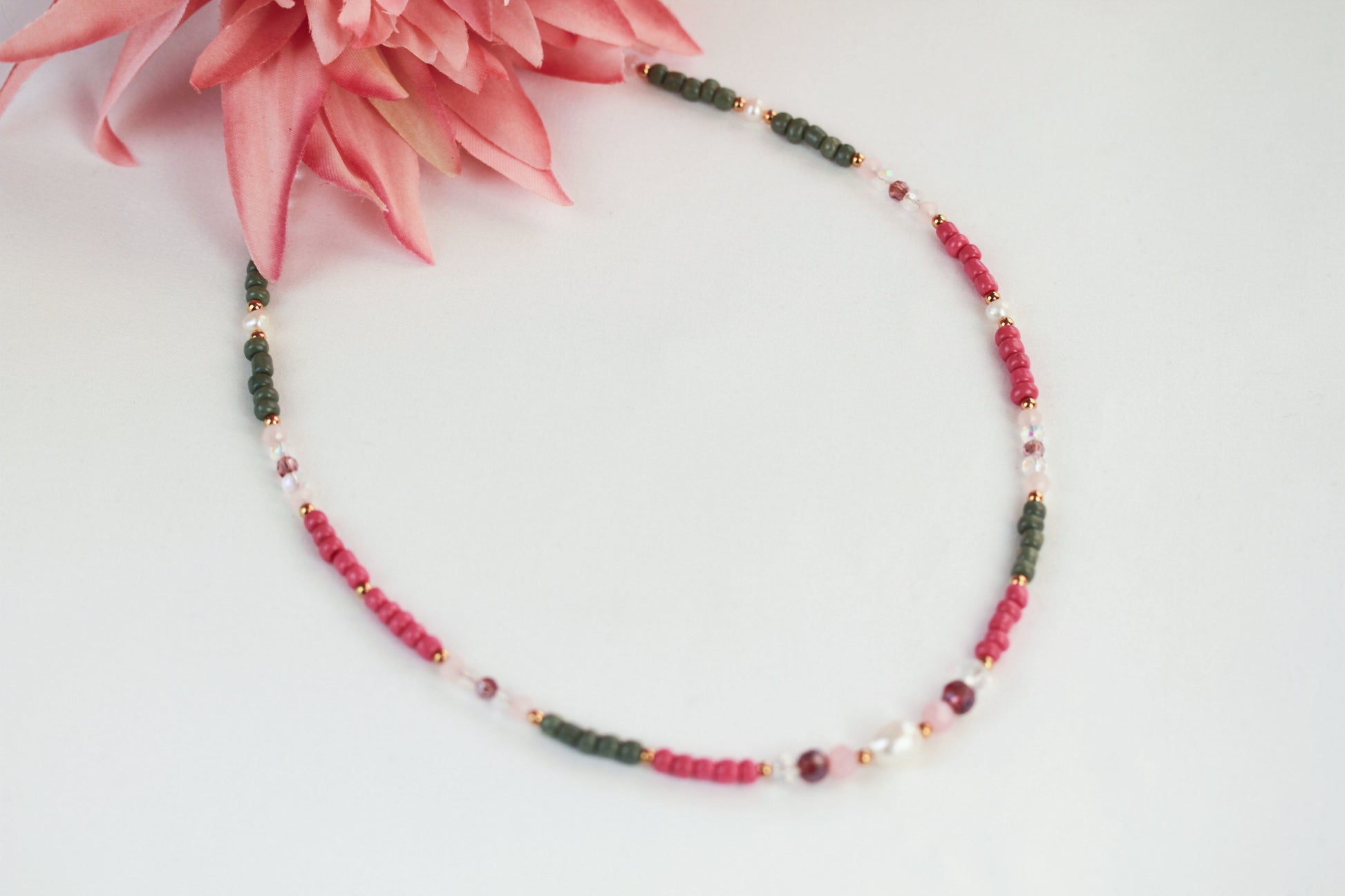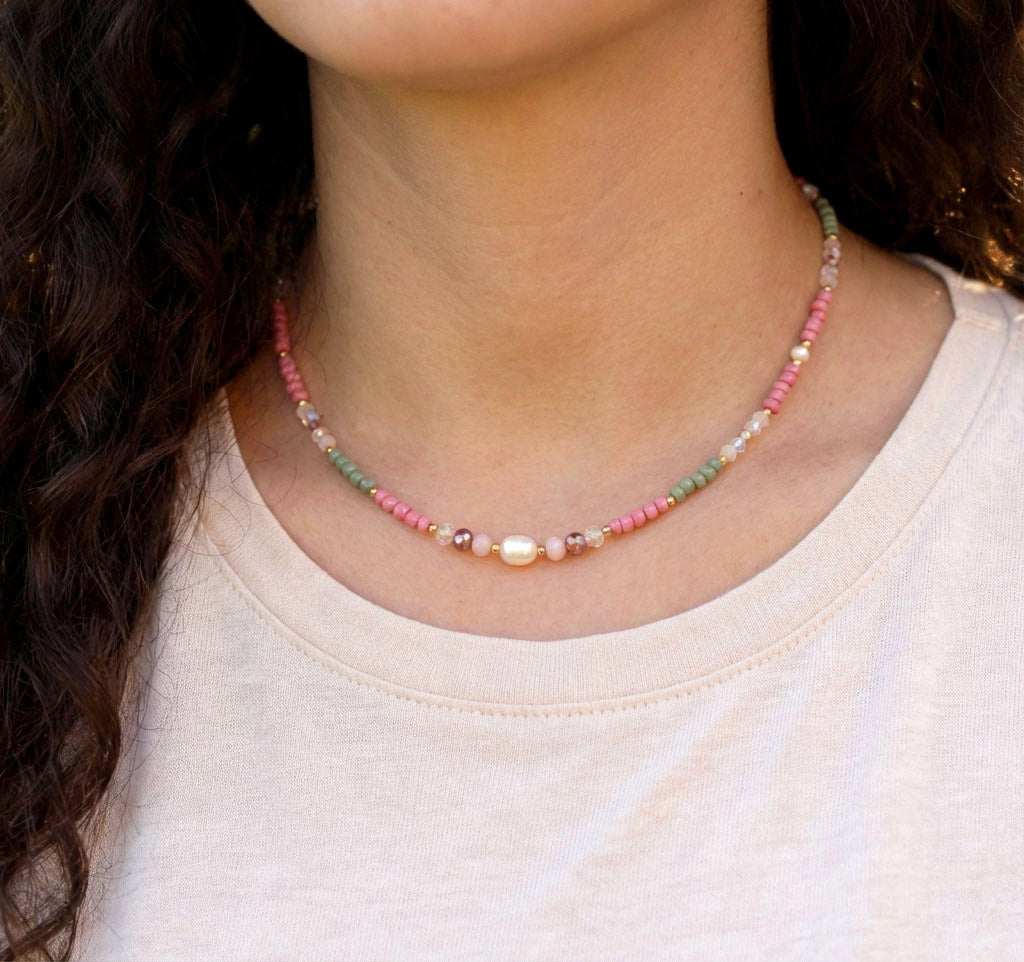 Dieses elegante Schmuckset vereint harmonisch grüne und altrosa Perlen mit hochwertigen Süßwasser- und Glasperlen. Ergänzt durch langlebige Edelstahlkomponenten, bietet es eine ausgewogene Kombination aus Farbvielfalt und Beständigkeit.