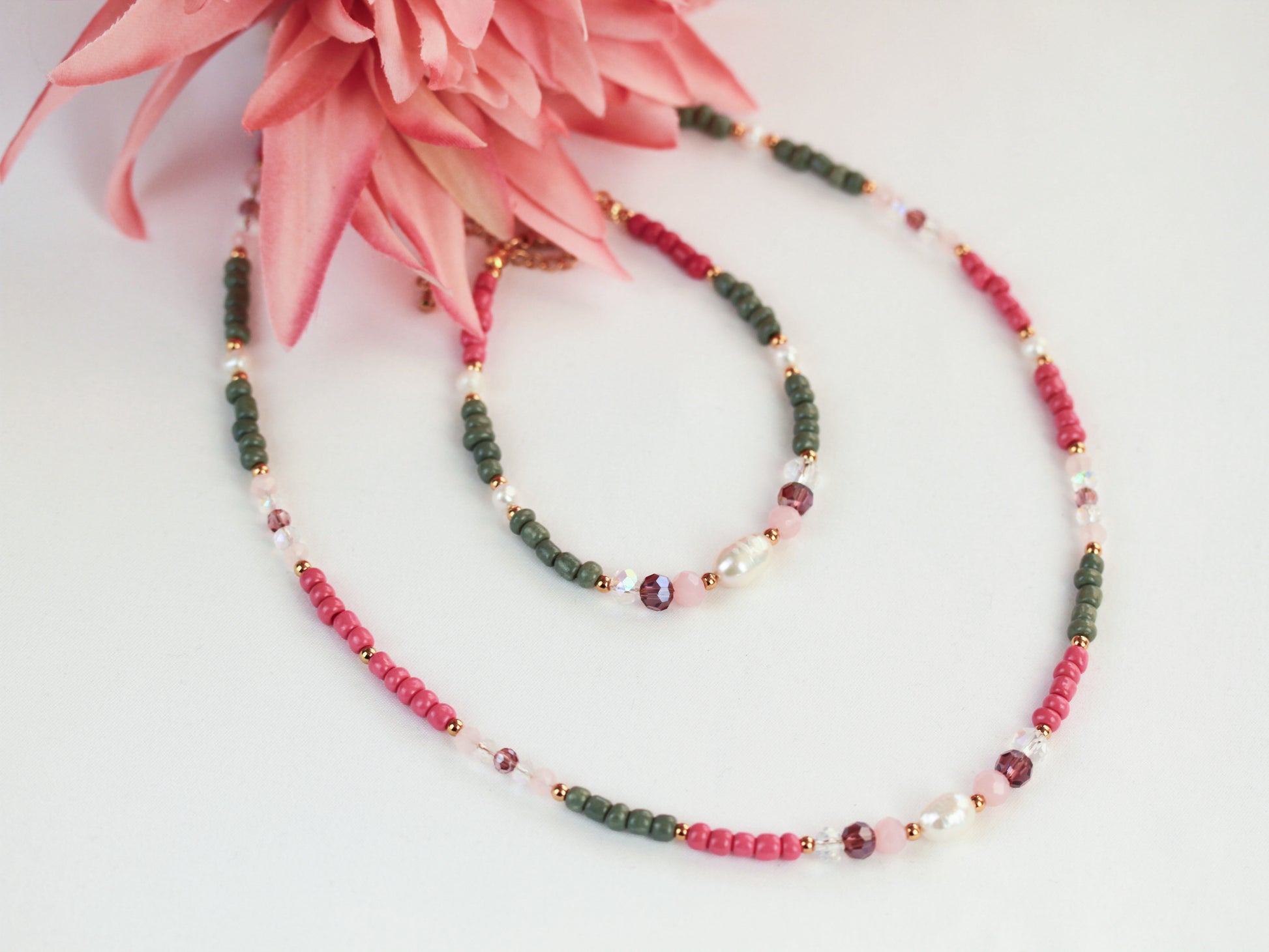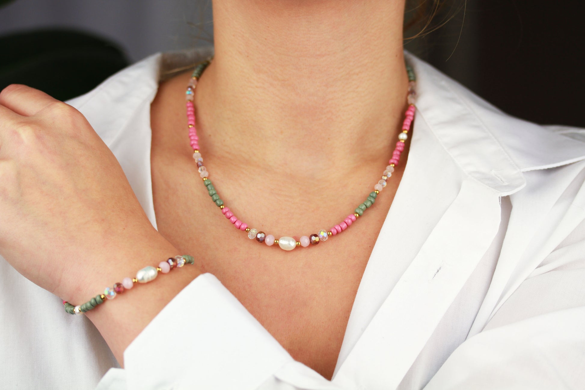 Grün-Altrosa Perlenkette & Armband – Mit Süßwasserperlen | Set