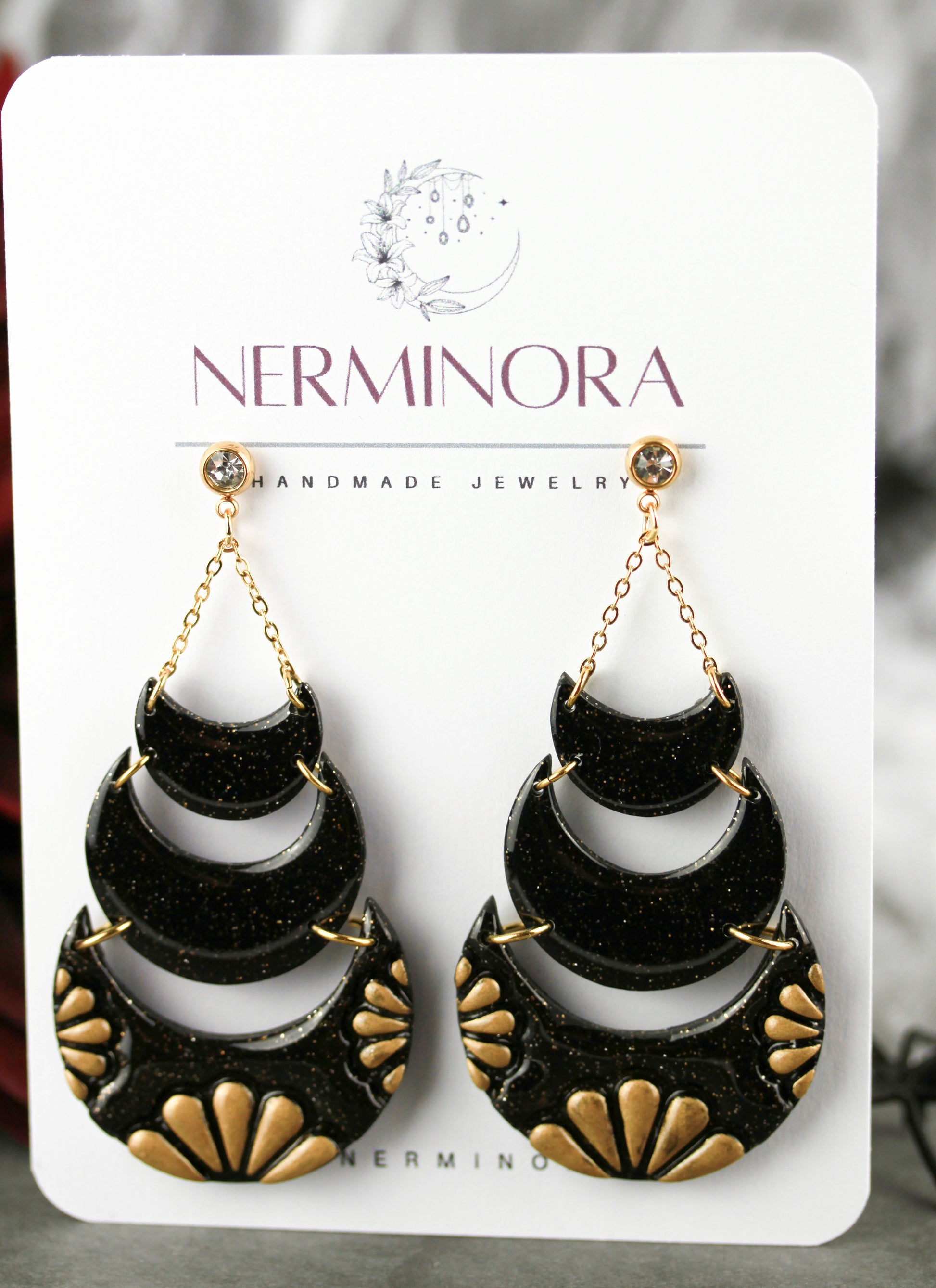 Schwarze Mond-Langohrringe – Handgefertigte Polymer Clay Statement Ohrringe