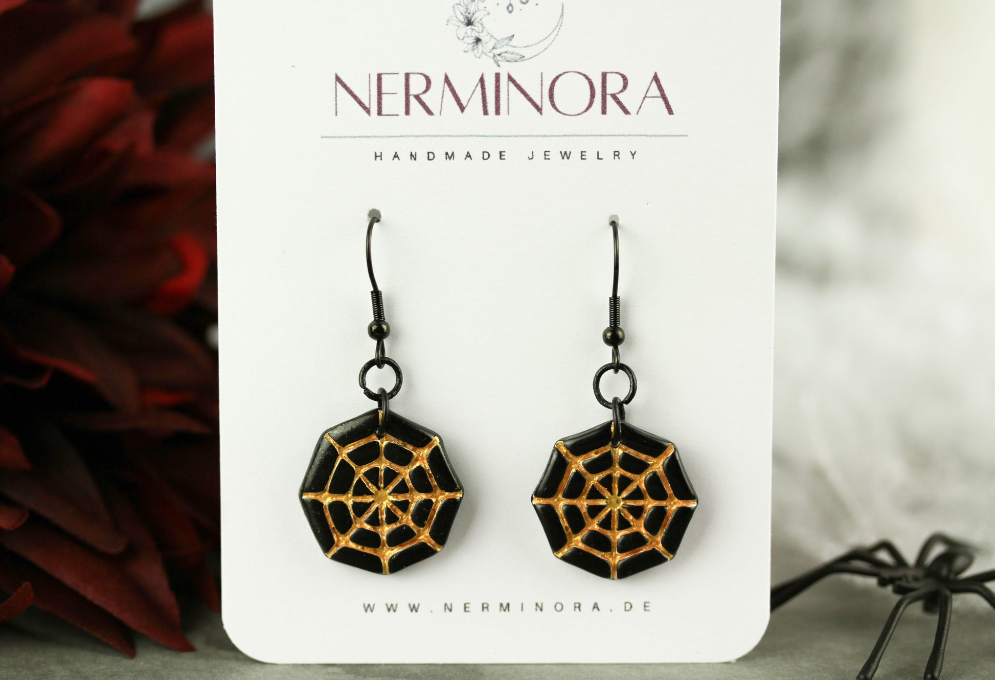 Gold-Schwarze Spinnennetz Ohrringe – Polymer Clay Statement | Halloween Edition