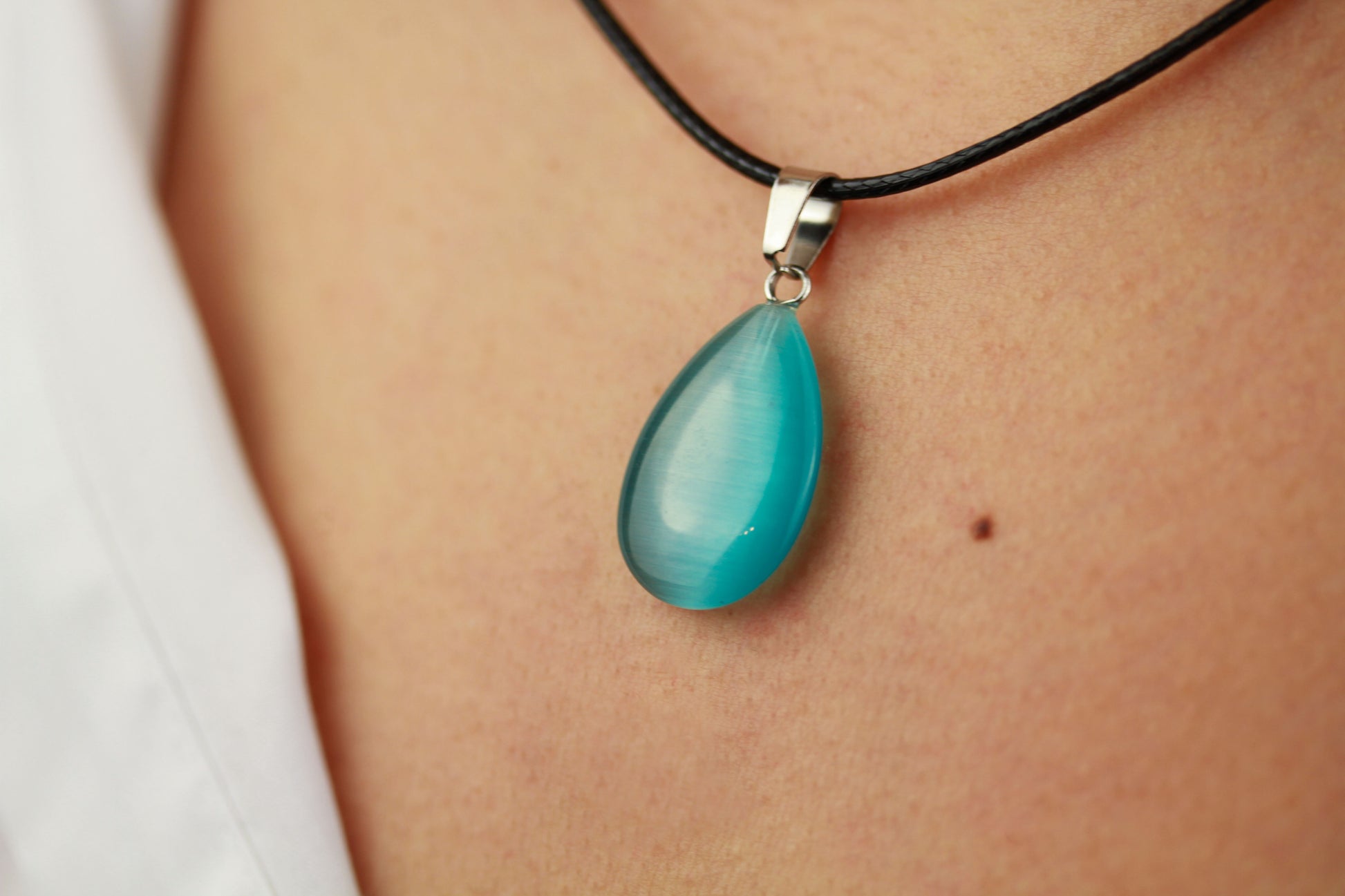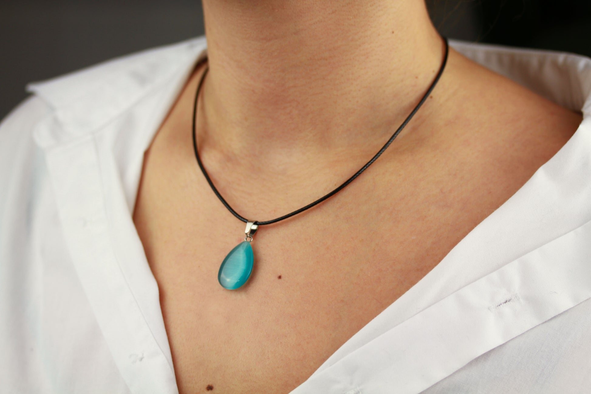 Diese elegante Halskette besticht durch ihren faszinierenden türkisfarbenen Anhänger mit schimmerndem Glanz auf klassischem schwarzem Halsband. Die Kombination aus edlem Design und zeitlosem Stil macht sie zum perfekten Accessoire für jeden Anlass.