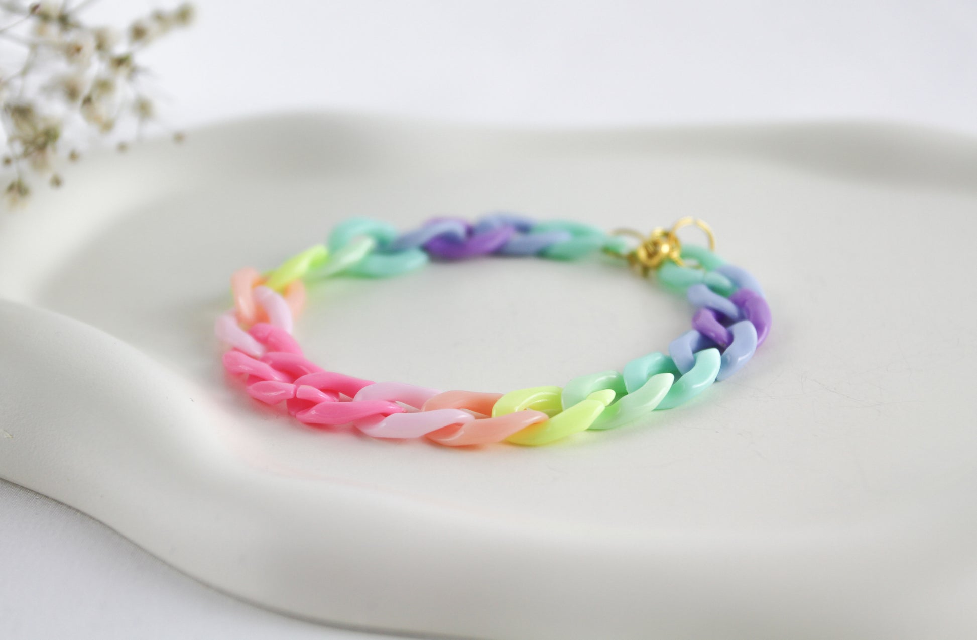 Diese Regenbogenfarbigen Acryl Gliederketten sind ein vielseitiges Schmuckstück, das deinem Look eine bunte Note verleiht.