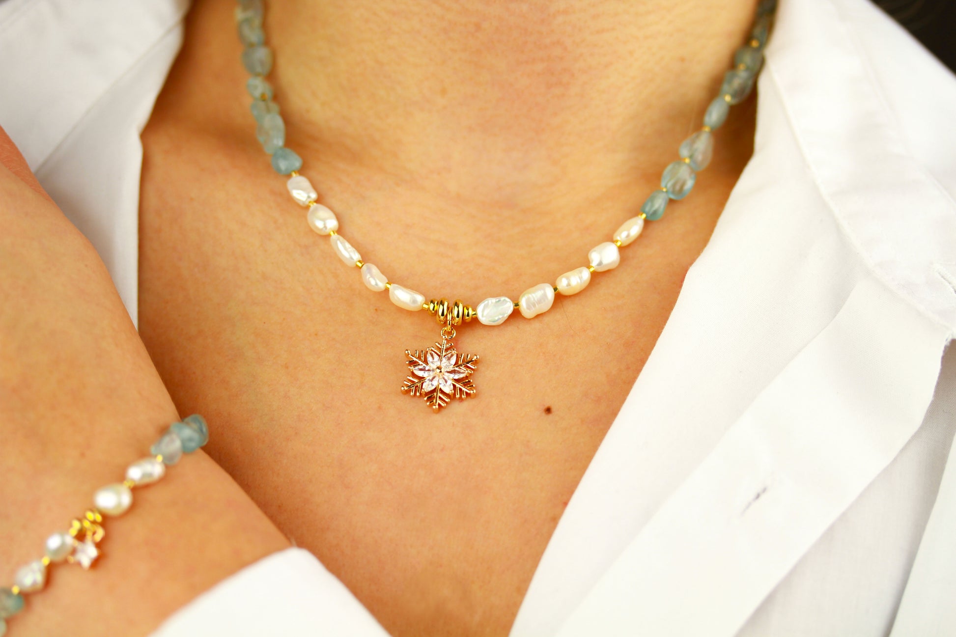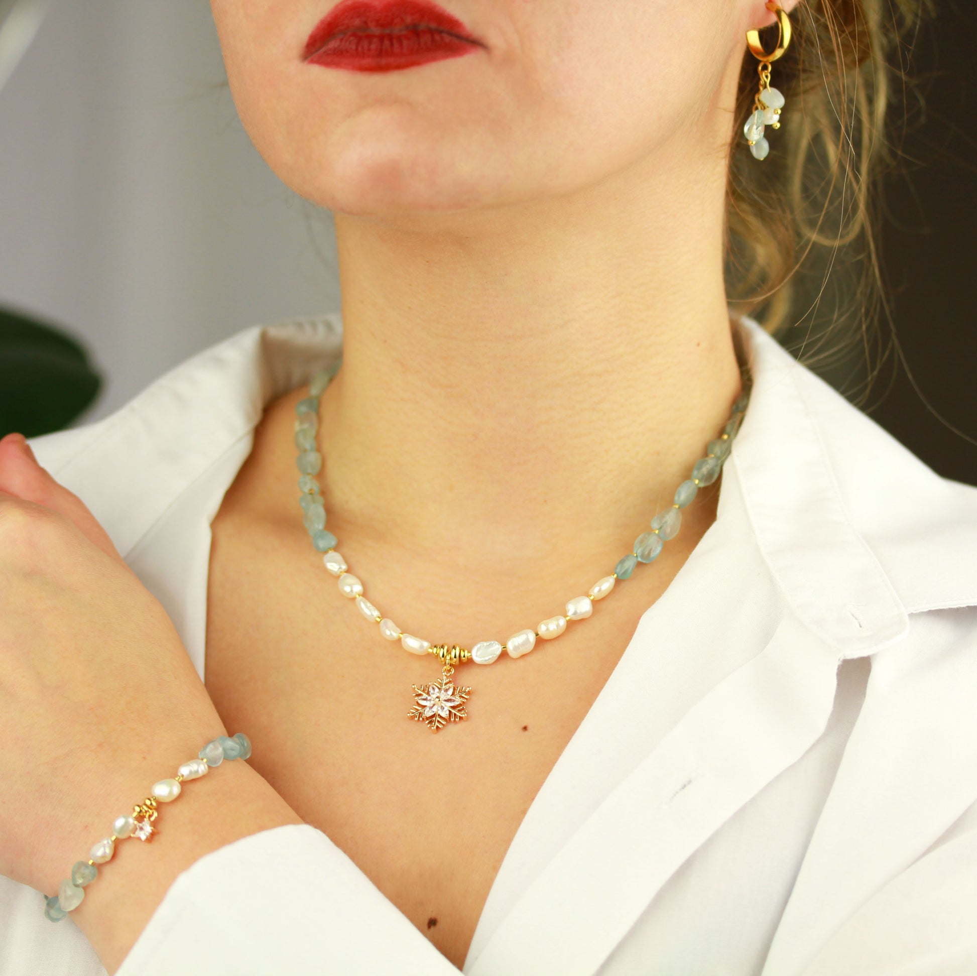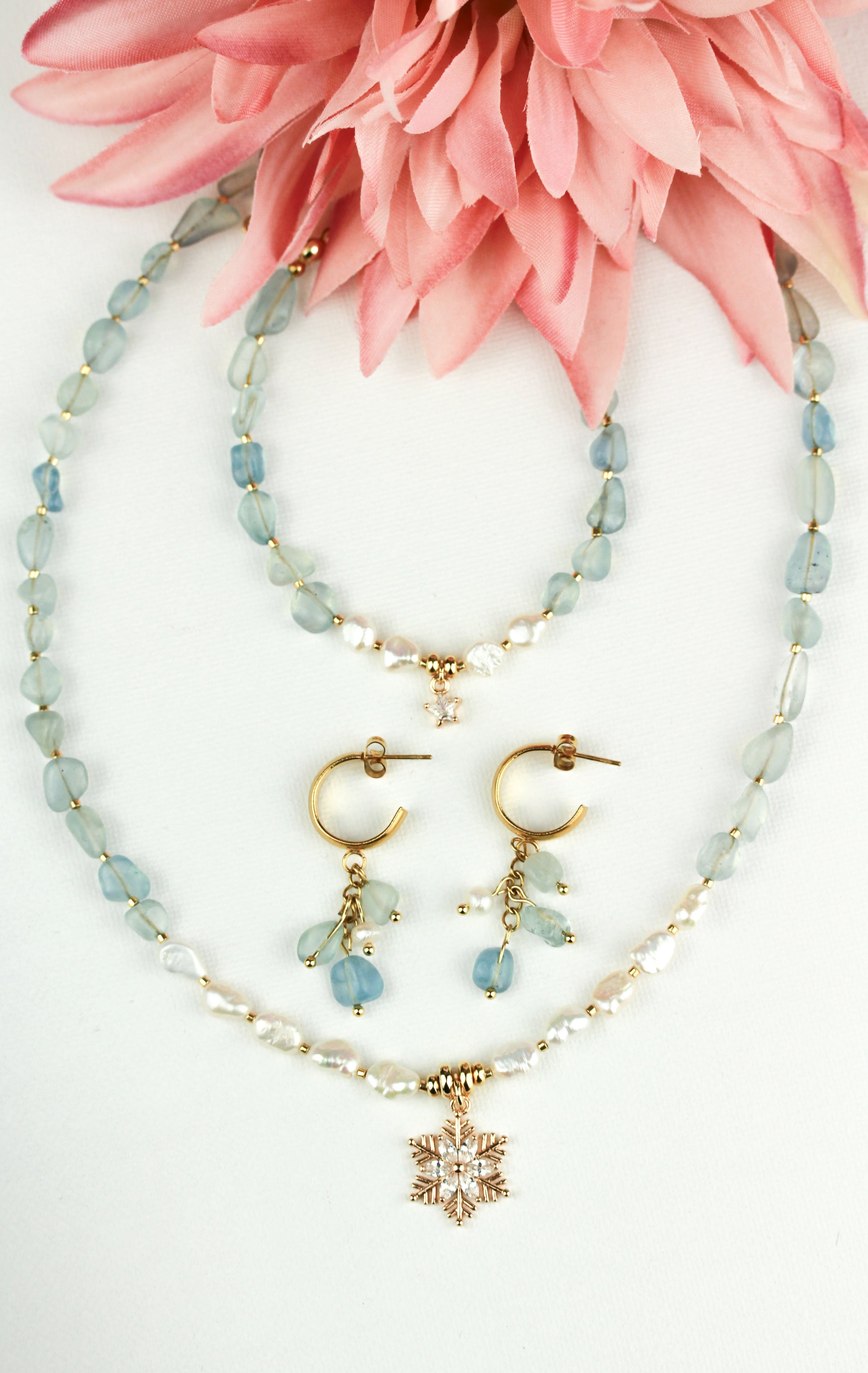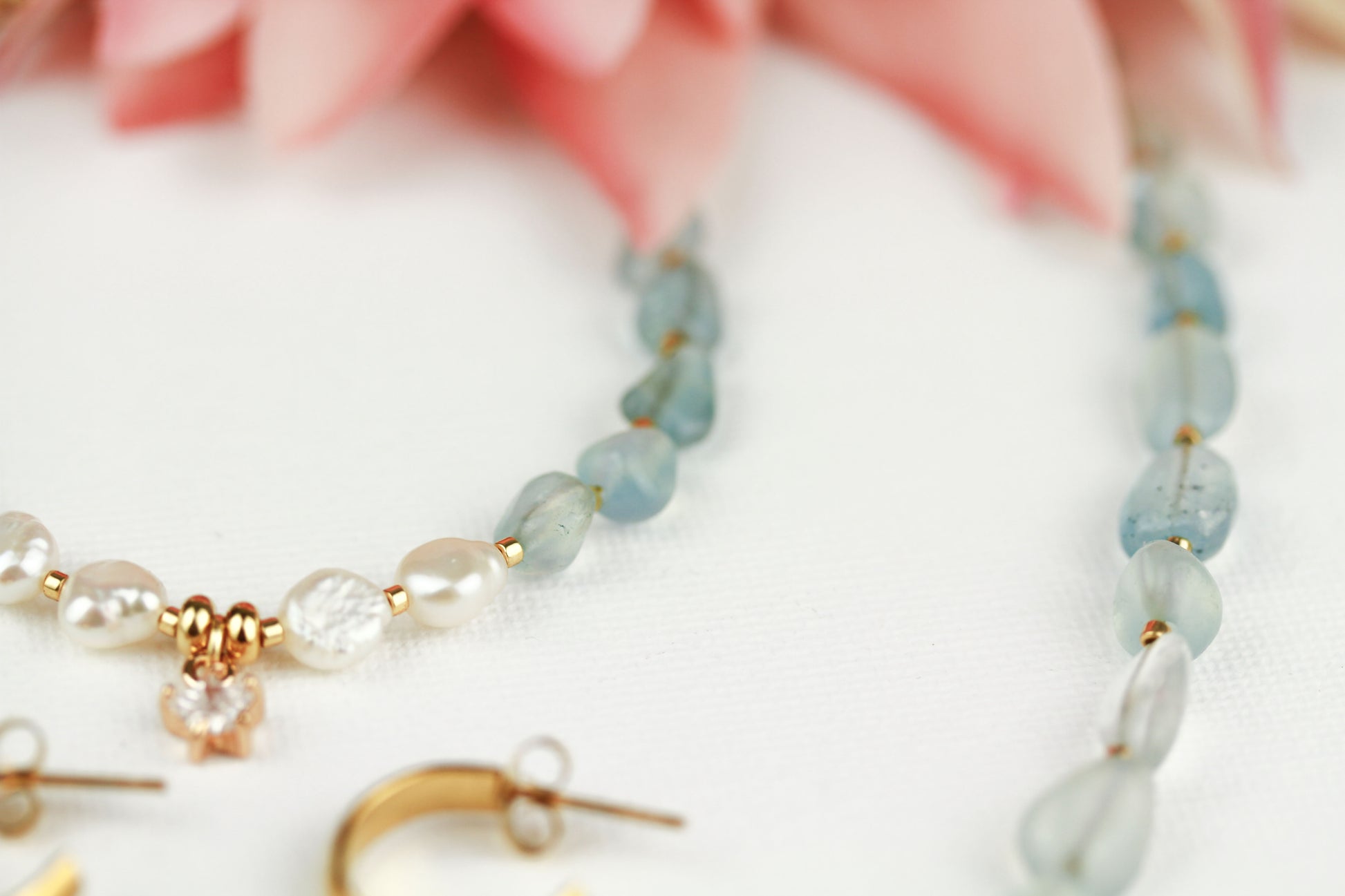 Aquamarin & Süßwasserperlen Schmuckset mit Zirkonia – Handgefertigt