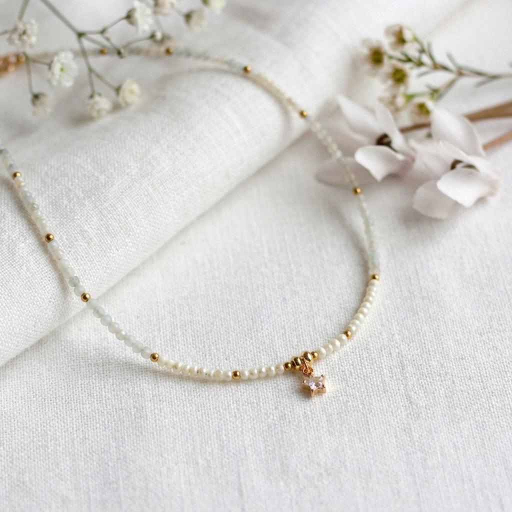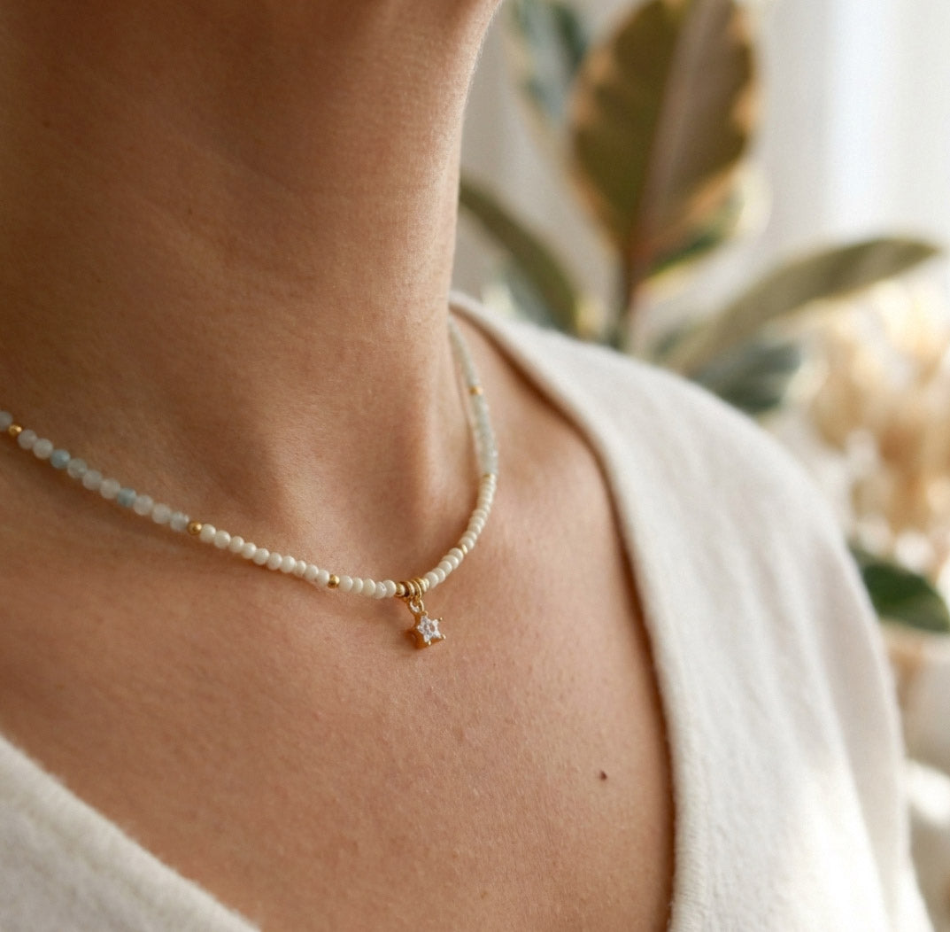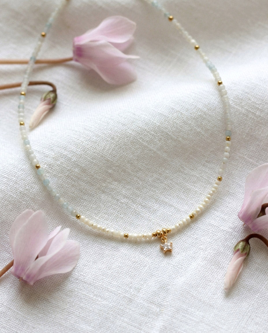 Zarte Aquamarin Perlenhalskette mit Zirkonia Anhänger – Handgefertigt
