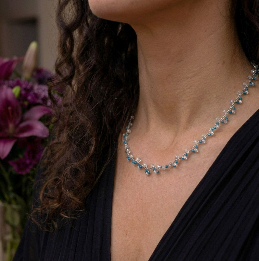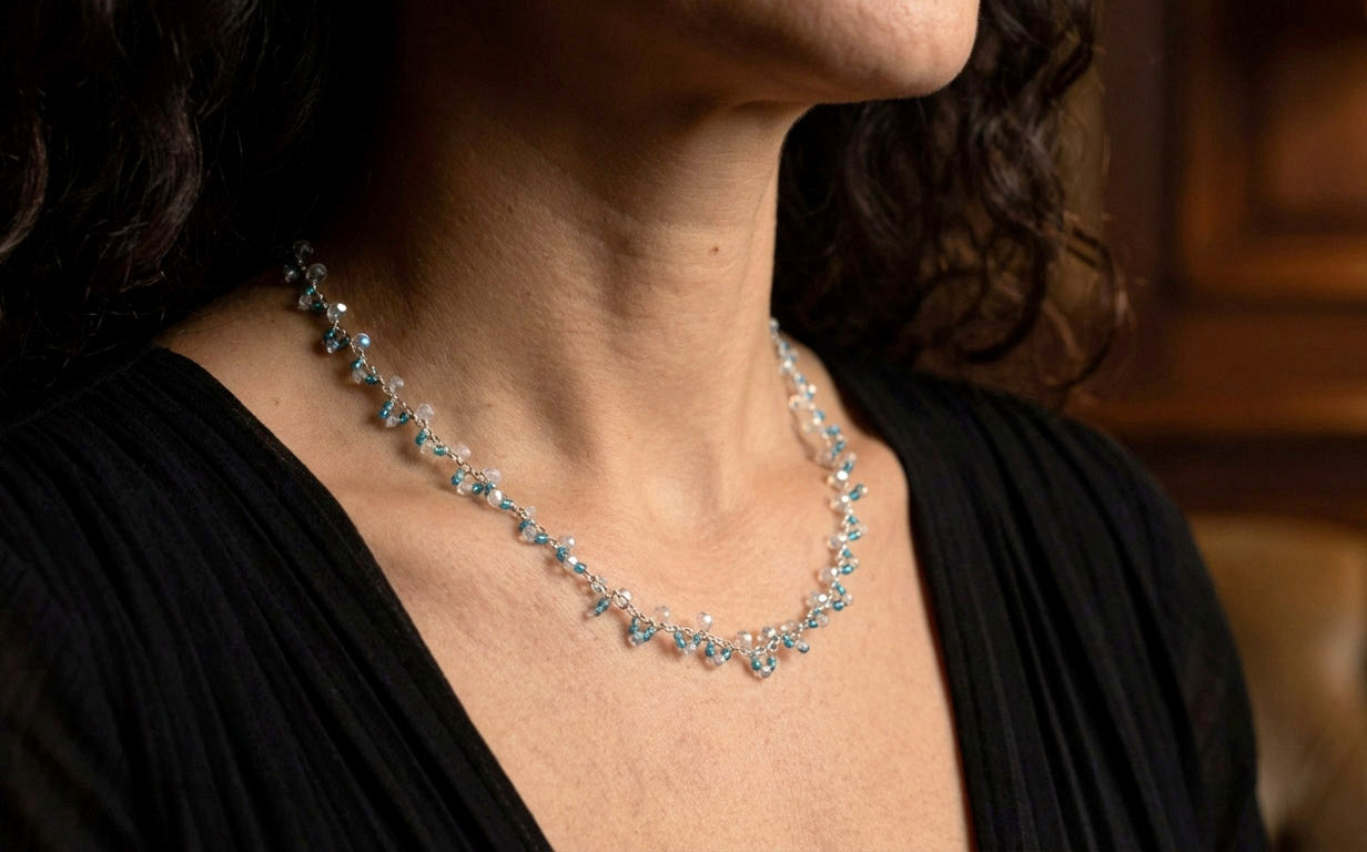 Diese elegante Halskette fasziniert mit strahlend blauen Perlen, die Ruhe und innere Klarheit ausstrahlen. Das locker anliegende Design setzt einen raffinierten Akzent und verleiht dem Hals eine zarte, feminine Präsenz.