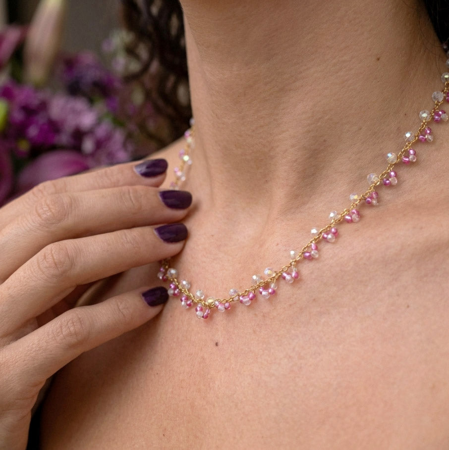 Diese raffinierte Halskette besticht durch zarte rosa Perlen, die Weiblichkeit und Eleganz ausstrahlen. Das locker anliegende Design setzt einen raffinierten Akzent und verleiht dem Hals eine zarte, feminine Präsenz.