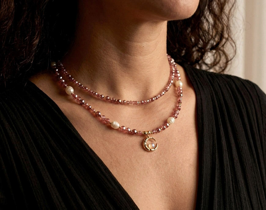 Layering Schmuckset – Kristall & Süßwasserperlen Halskette mit Mondanhänger | Handgefertigt
