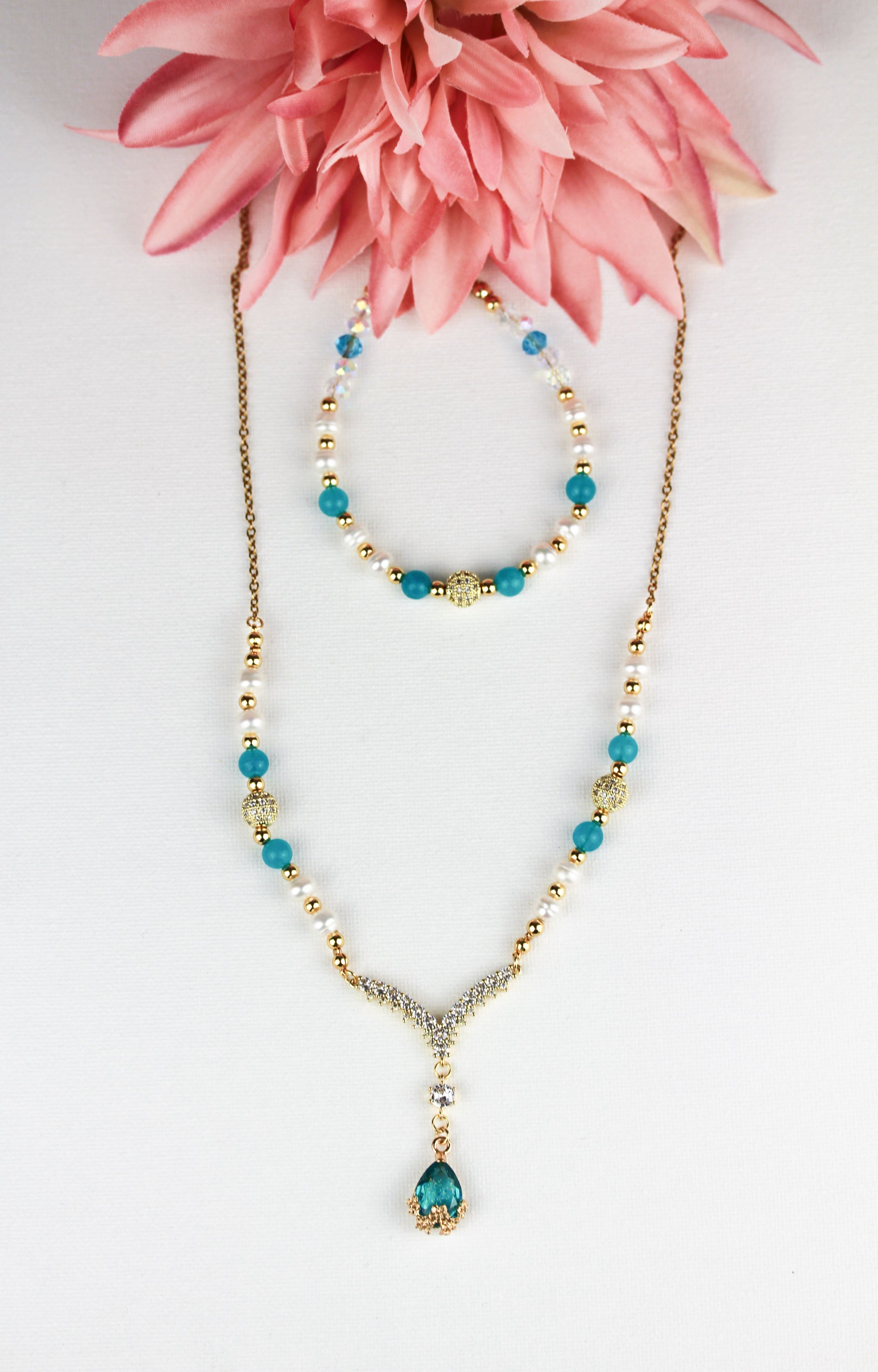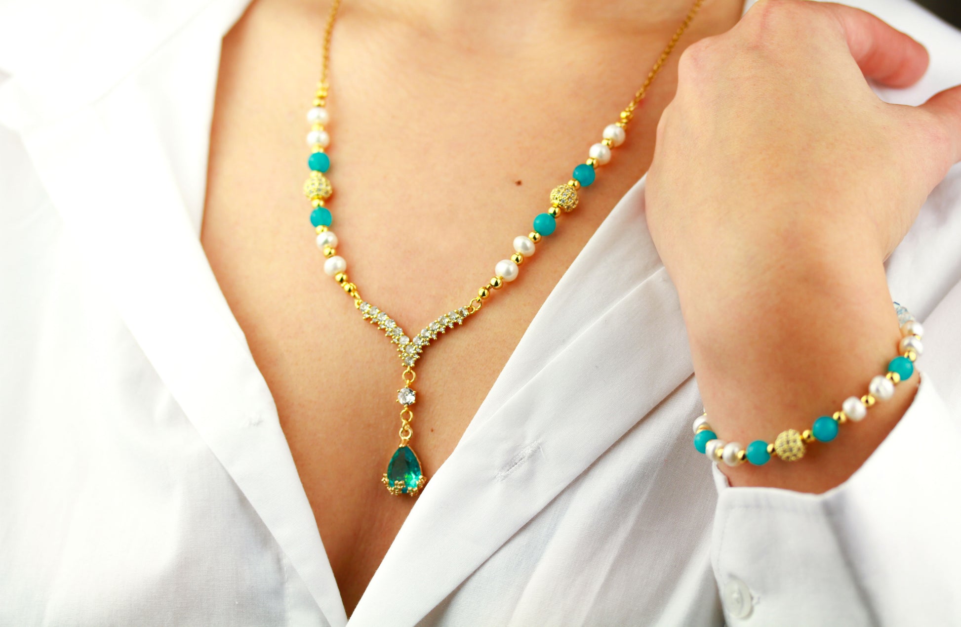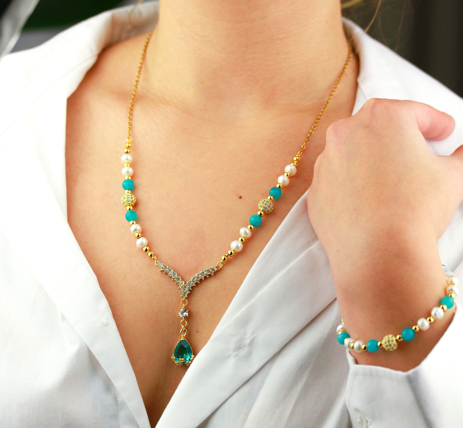 Amazonit und Süßwasserperlen Schmuckset – Perlenkette & Armband | Handgefertigt