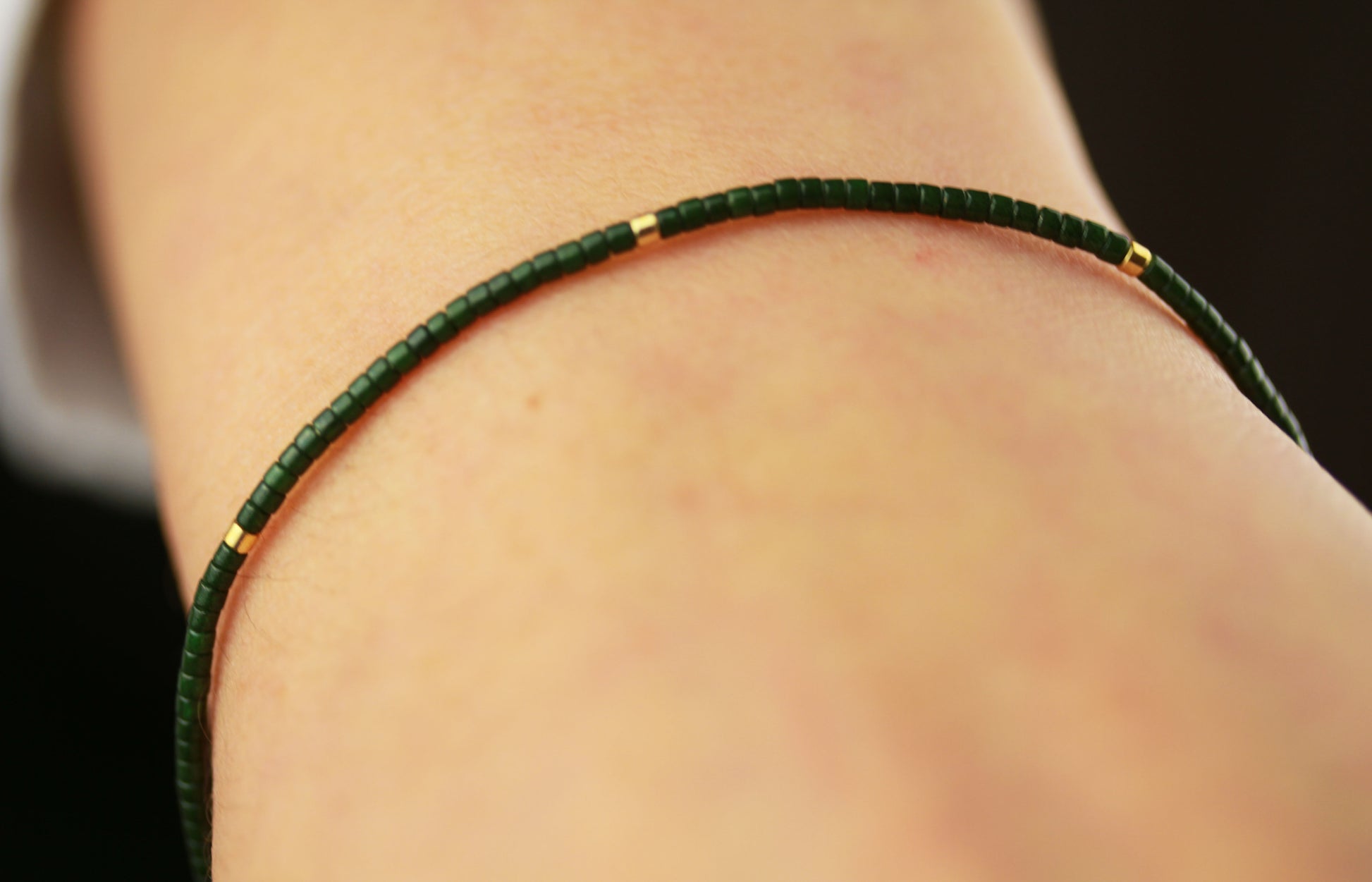 Grün-Goldenes Miyuki Perlenarmband – Filigranes Armband auf Seidenfaden | Handgemacht