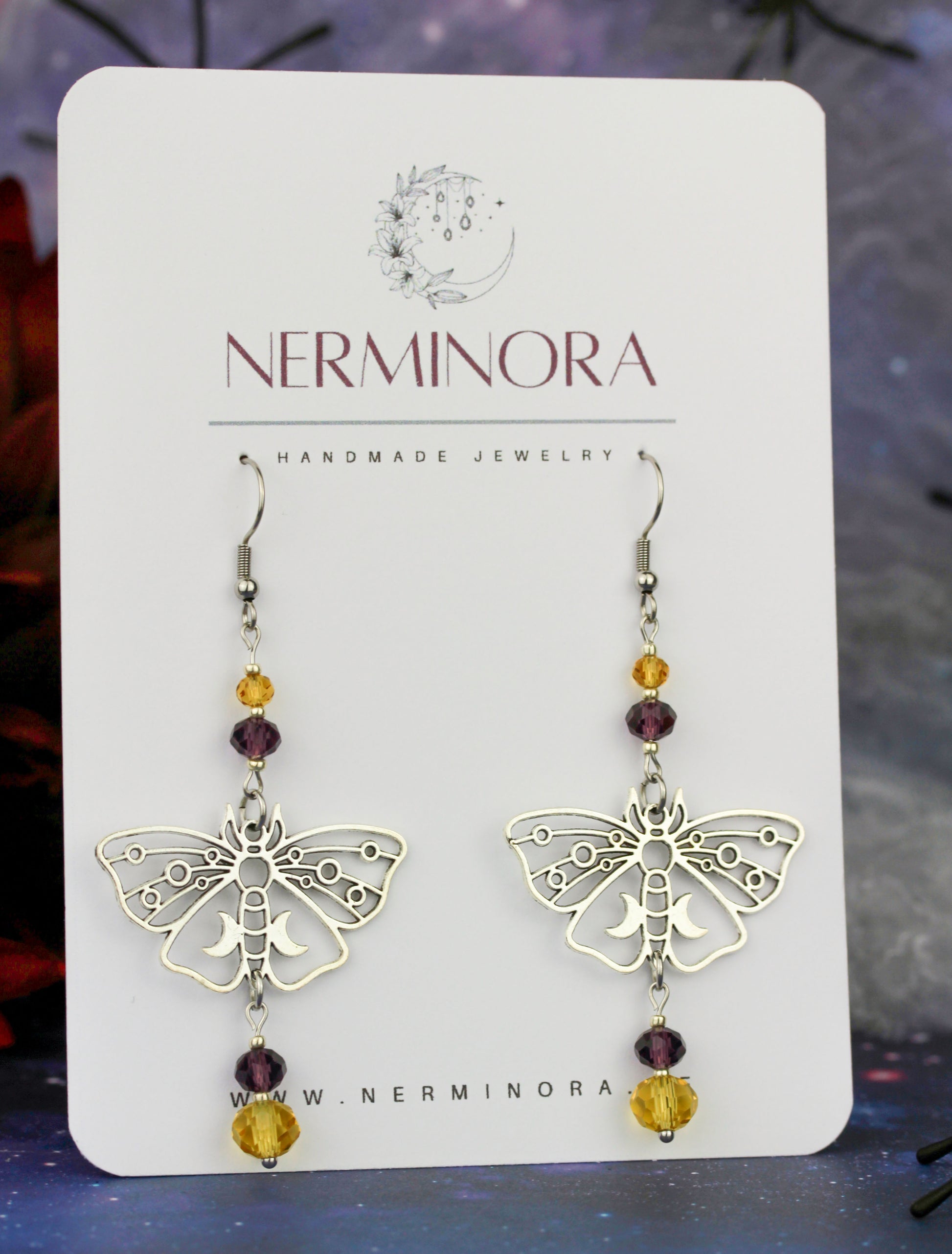 Silver Butterfly Ohrringe mit lila-gelben Kristallperlen – Amberwing Kollektion
