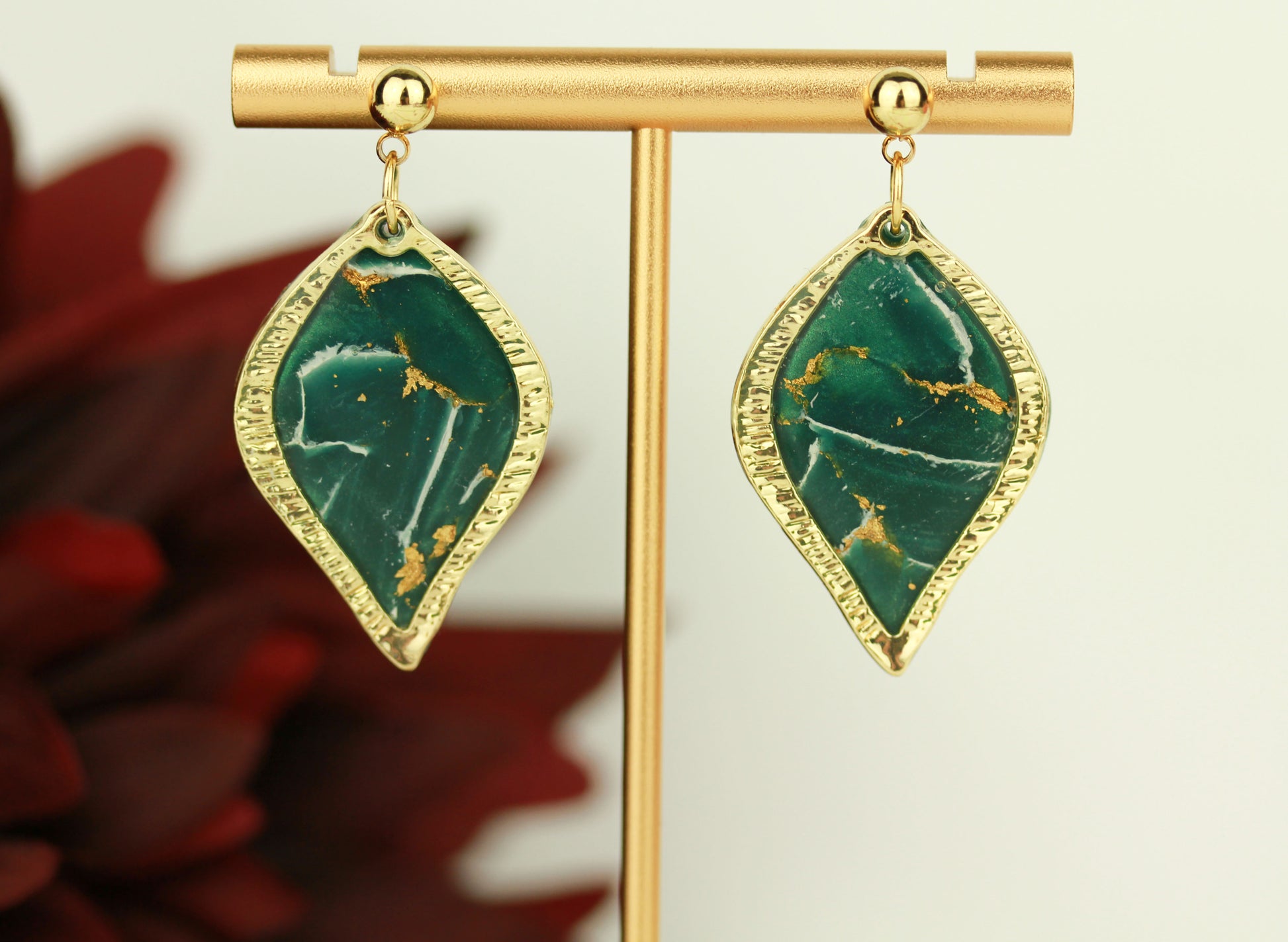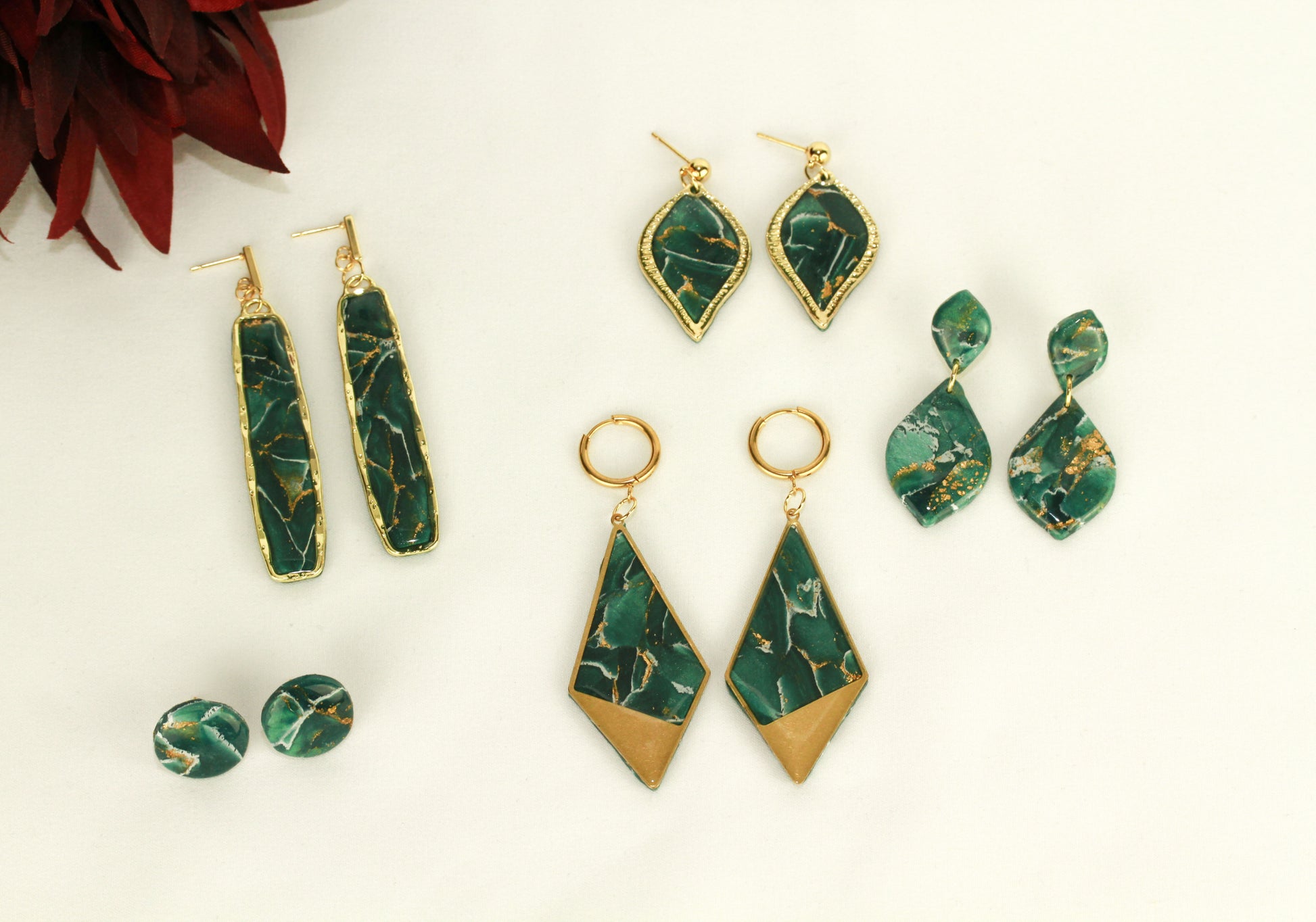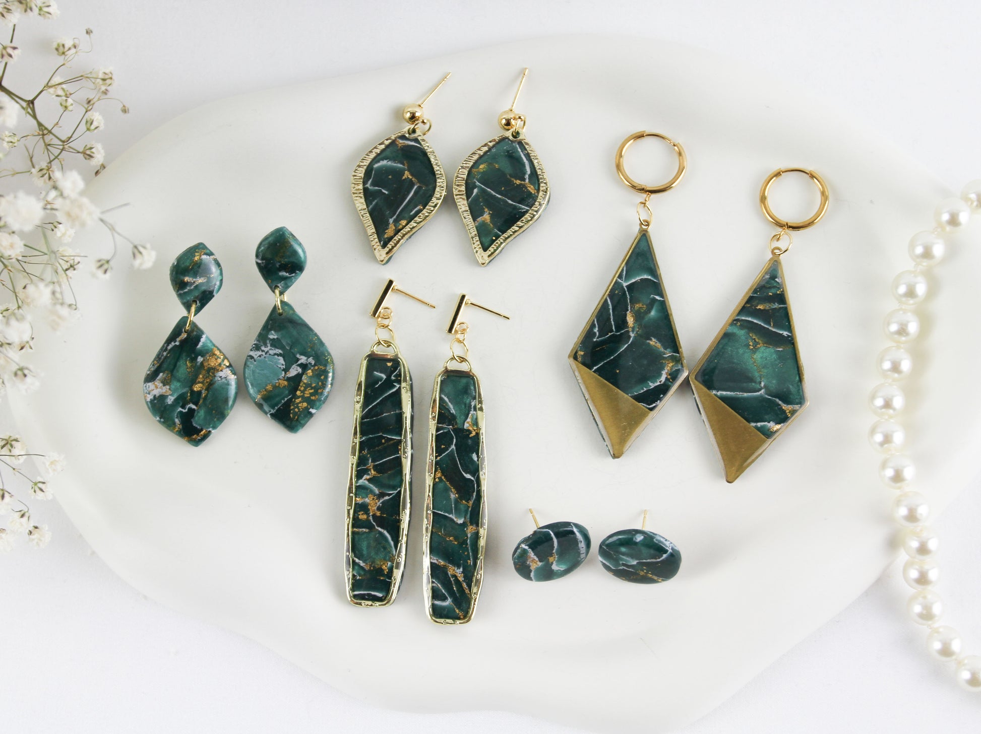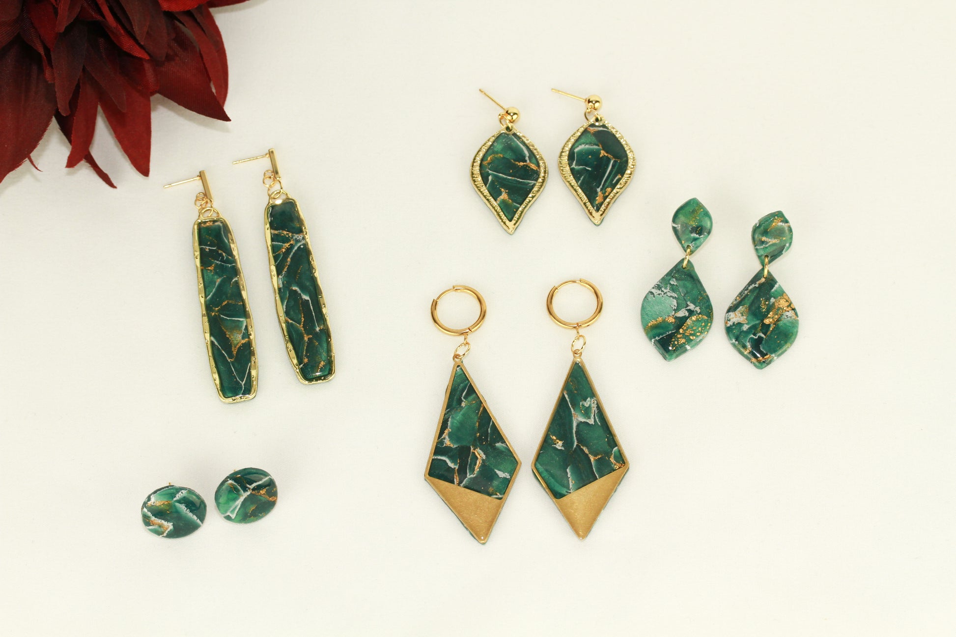Entdecken Sie eine elegante Kollektion inspirierter Ohrringe mit natürlichem Stein-Design. Jedes Paar zeigt eine einzigartige grün-goldene Marmorierung aus hochwertigem Polymer Clay, die zeitlose Schönheit und Stil vereint.