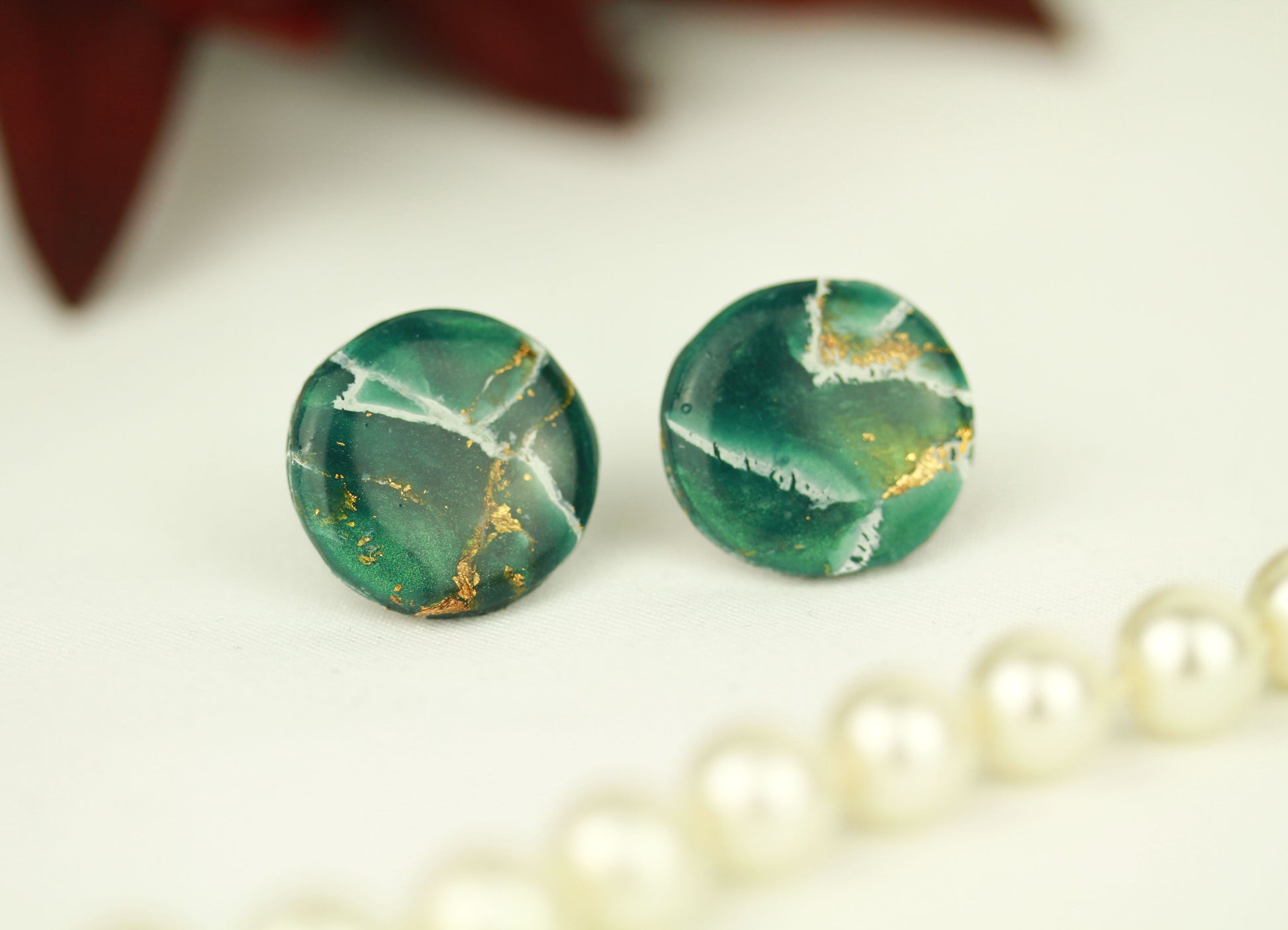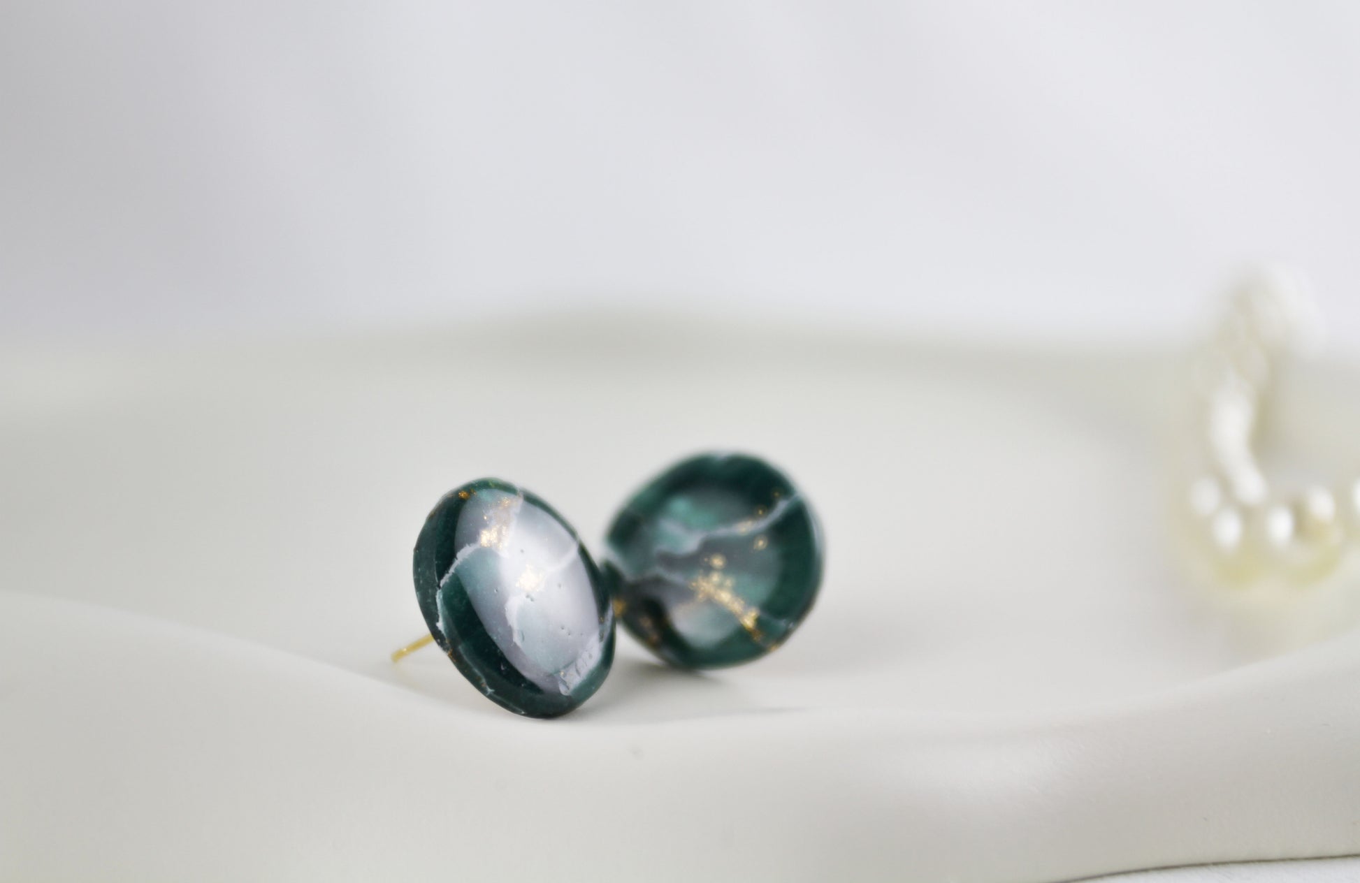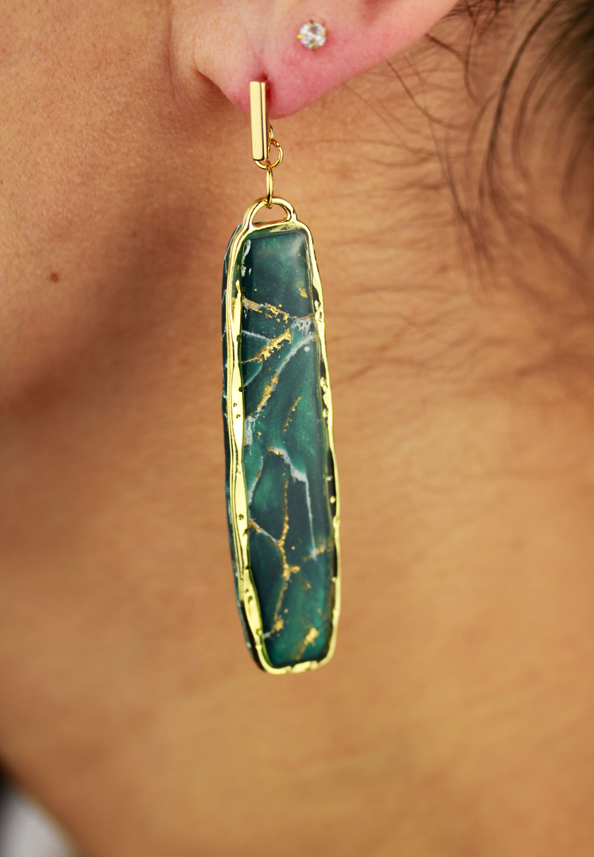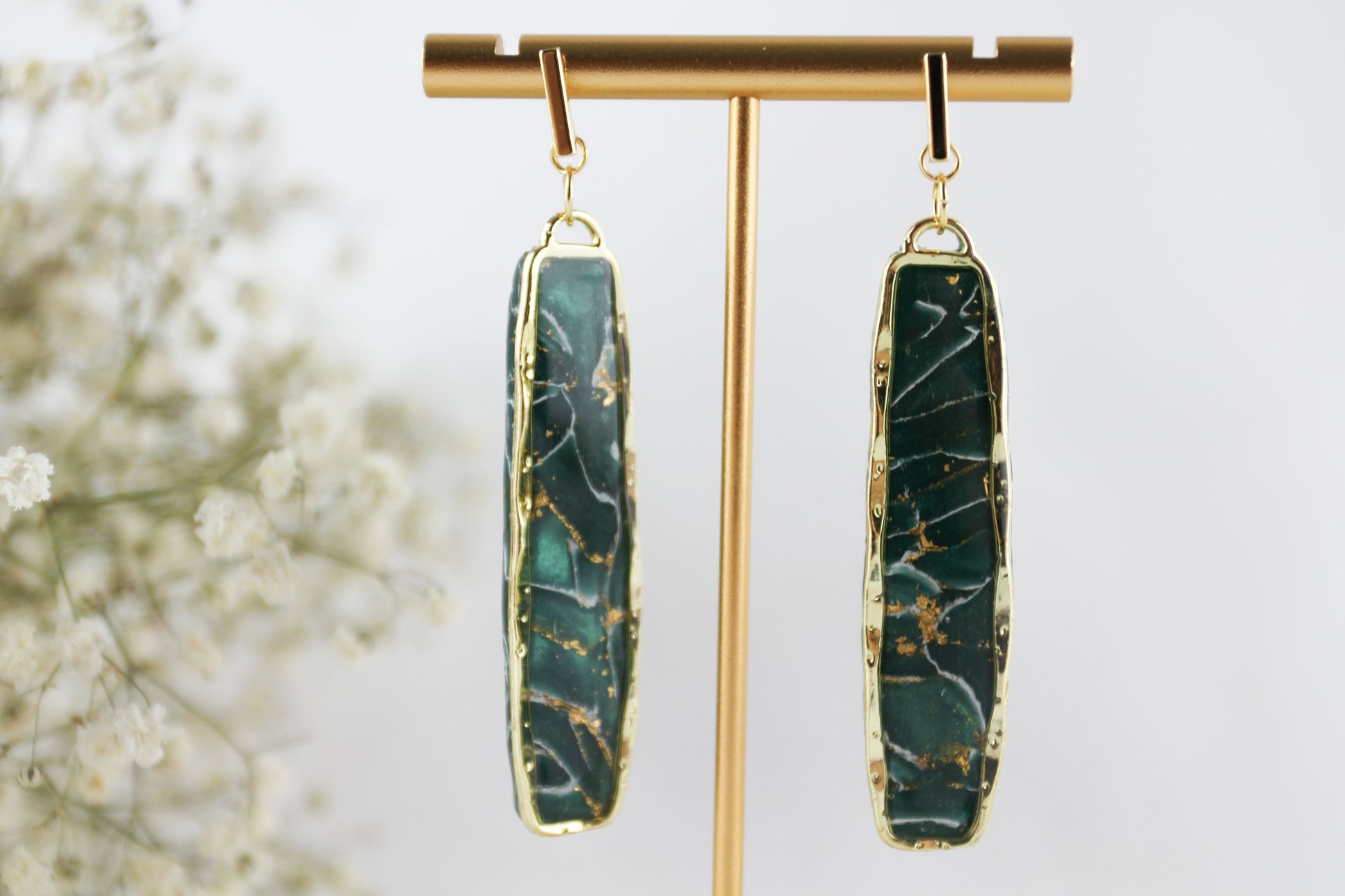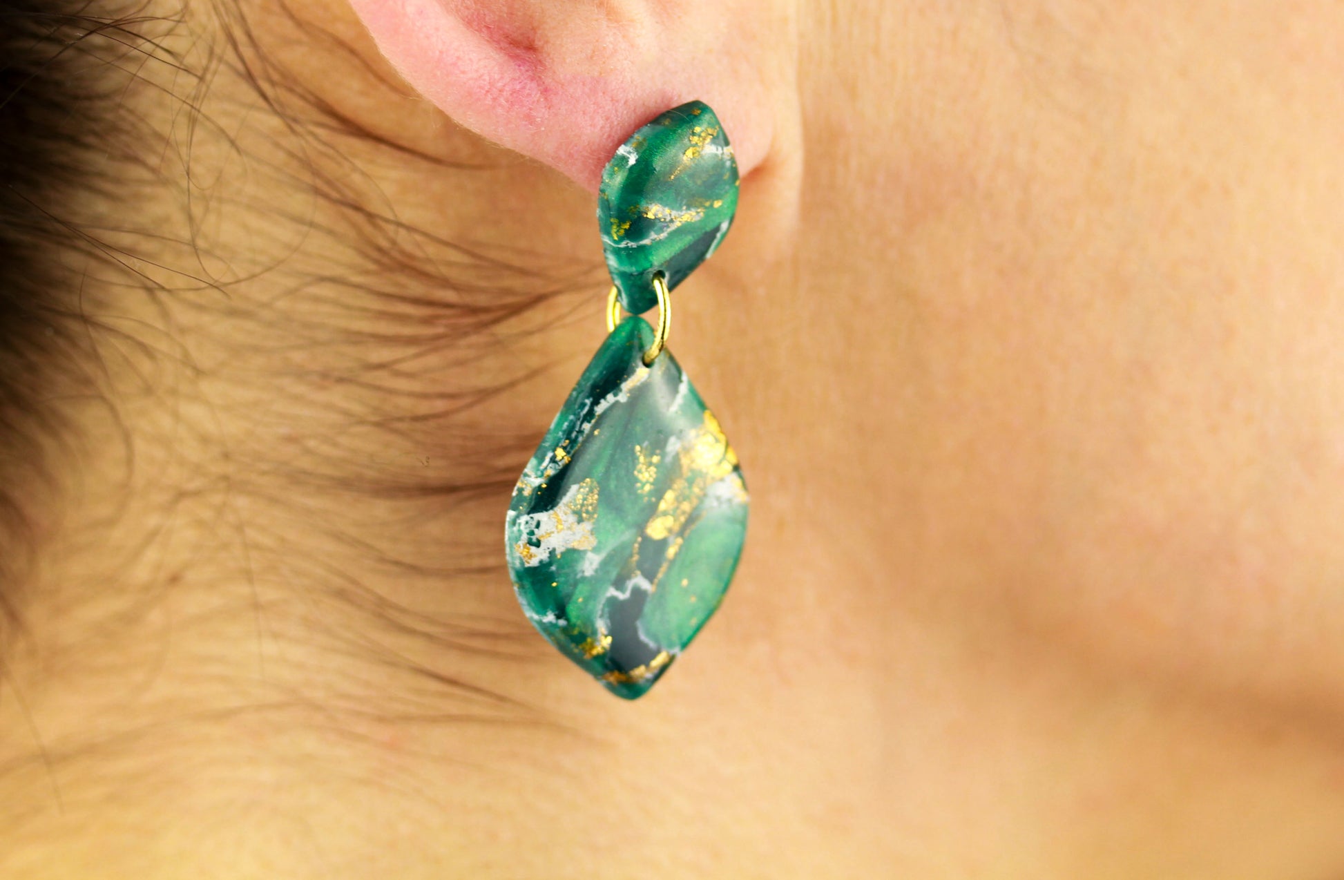 Entdecken Sie eine elegante Kollektion inspirierter Ohrringe mit natürlichem Stein-Design. Jedes Paar zeigt eine einzigartige grün-goldene Marmorierung aus hochwertigem Polymer Clay, die zeitlose Schönheit und Stil vereint.