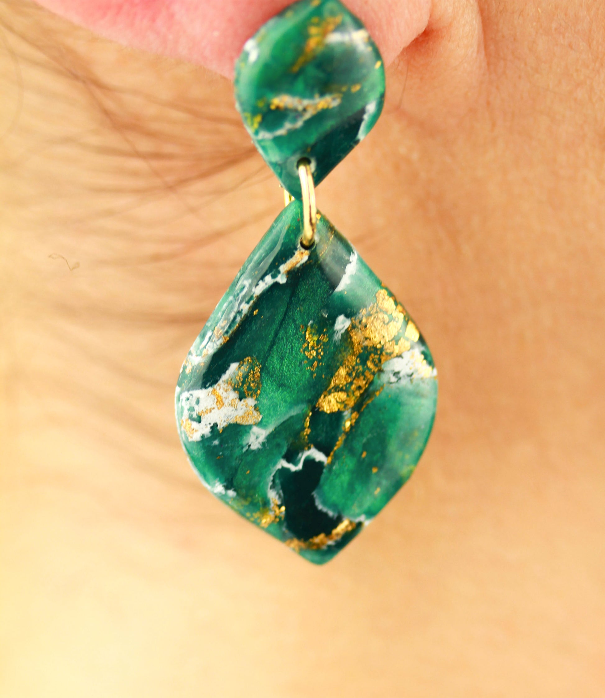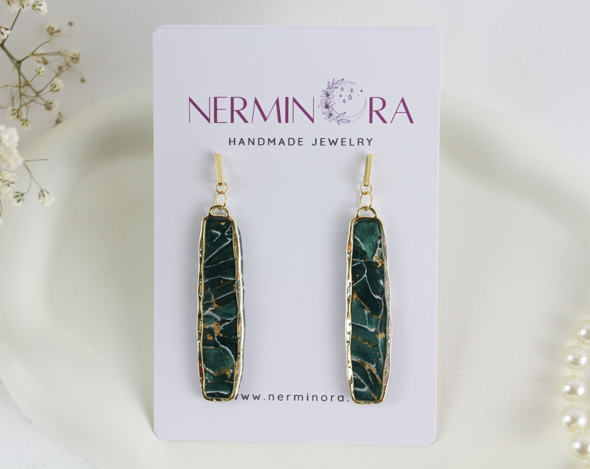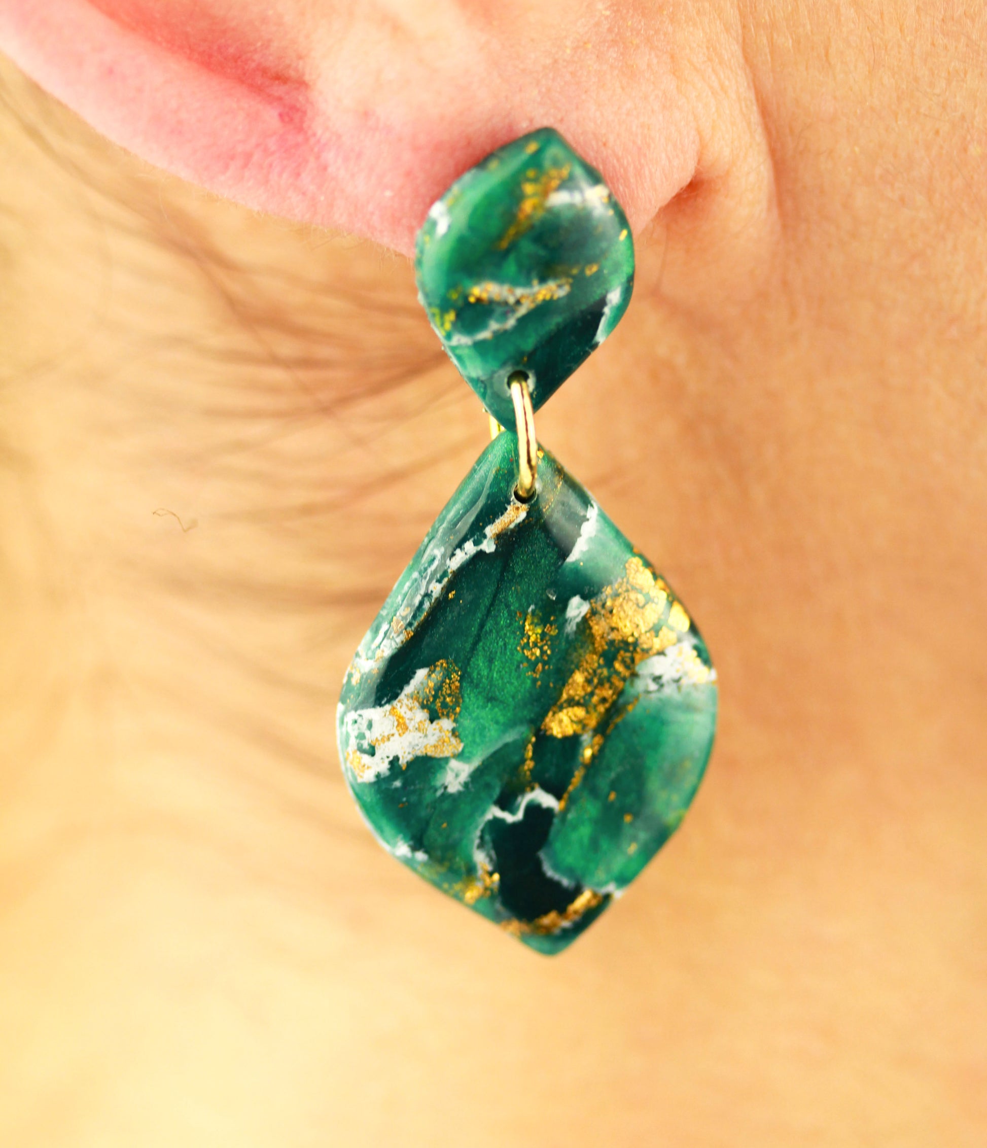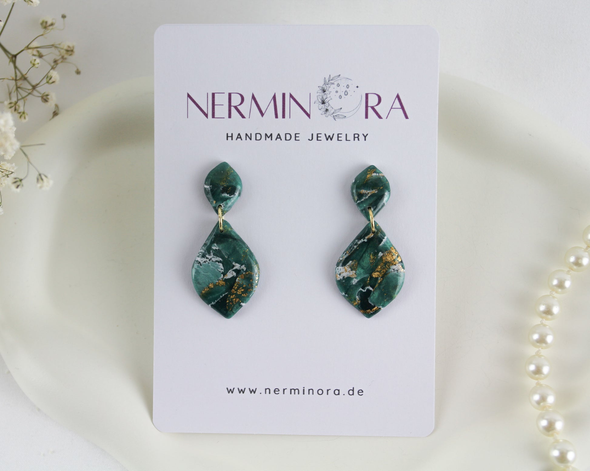 Entdecken Sie eine elegante Kollektion inspirierter Ohrringe mit natürlichem Stein-Design. Jedes Paar zeigt eine einzigartige grün-goldene Marmorierung aus hochwertigem Polymer Clay, die zeitlose Schönheit und Stil vereint.