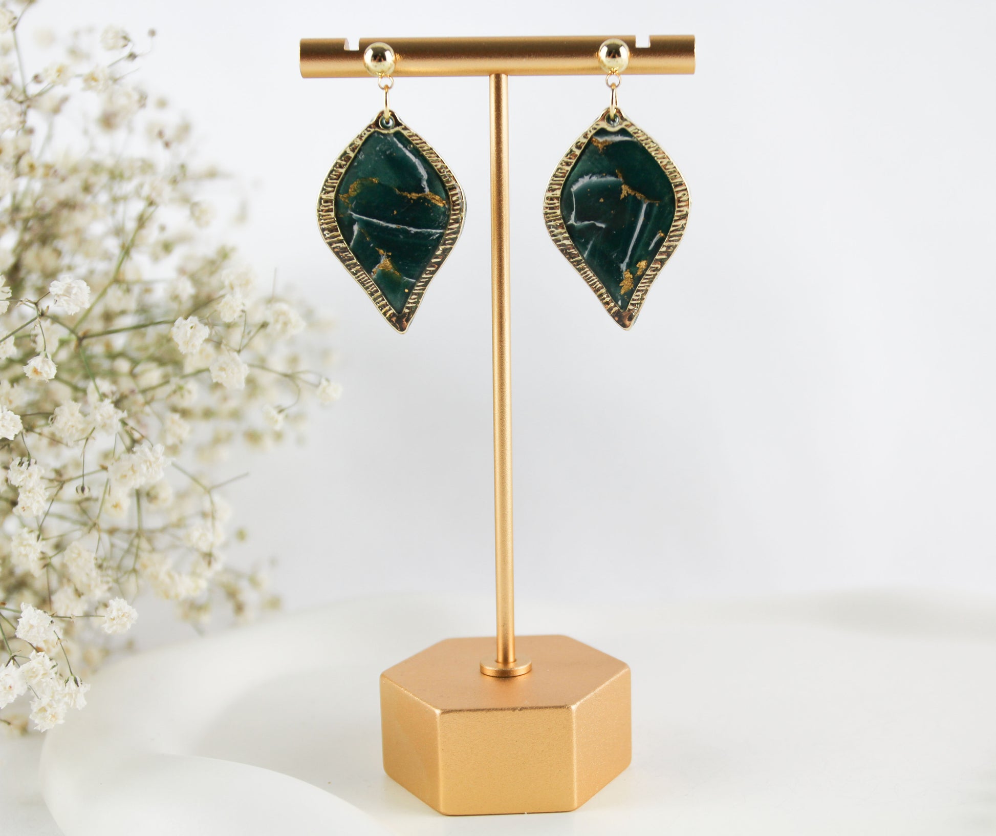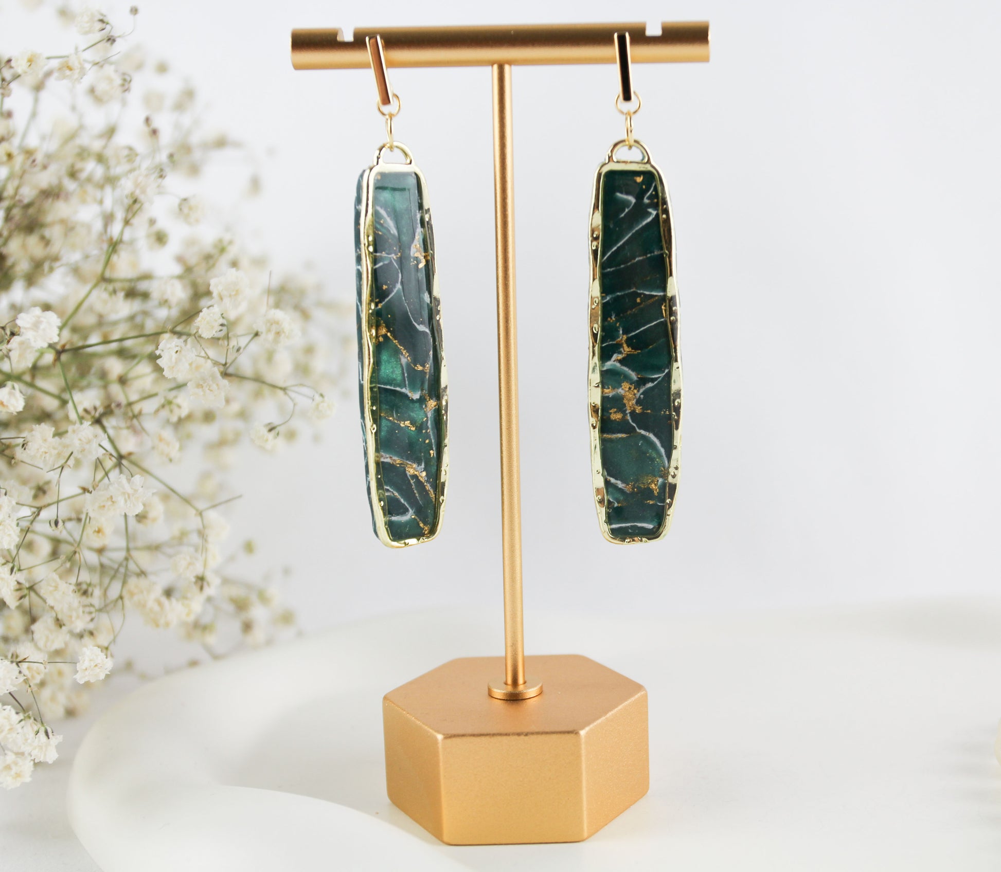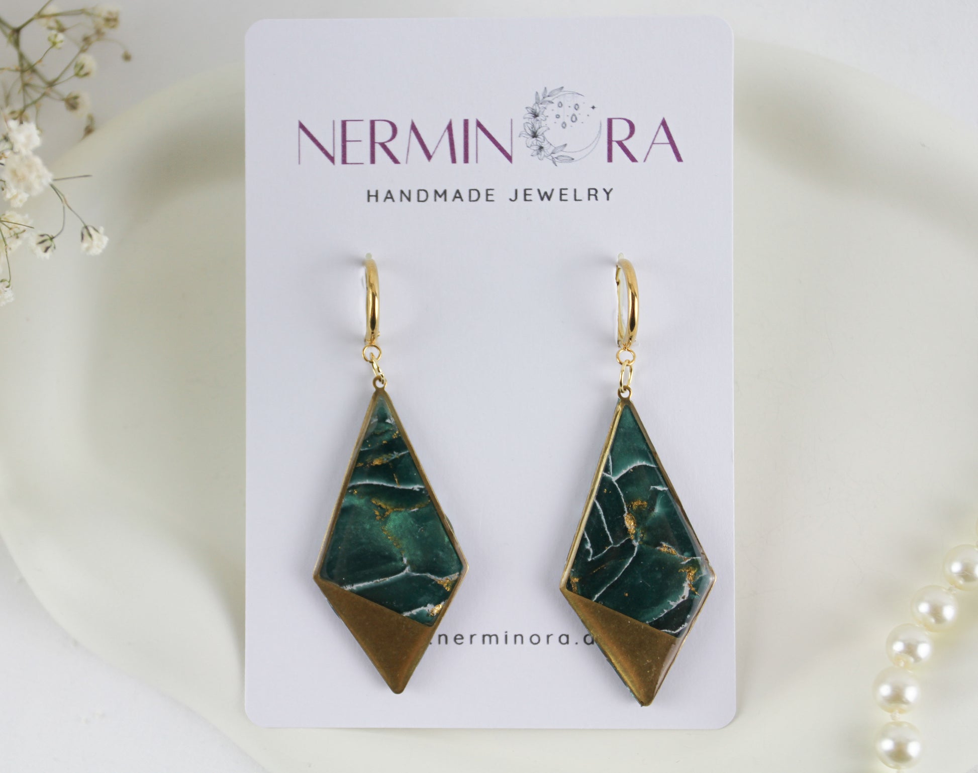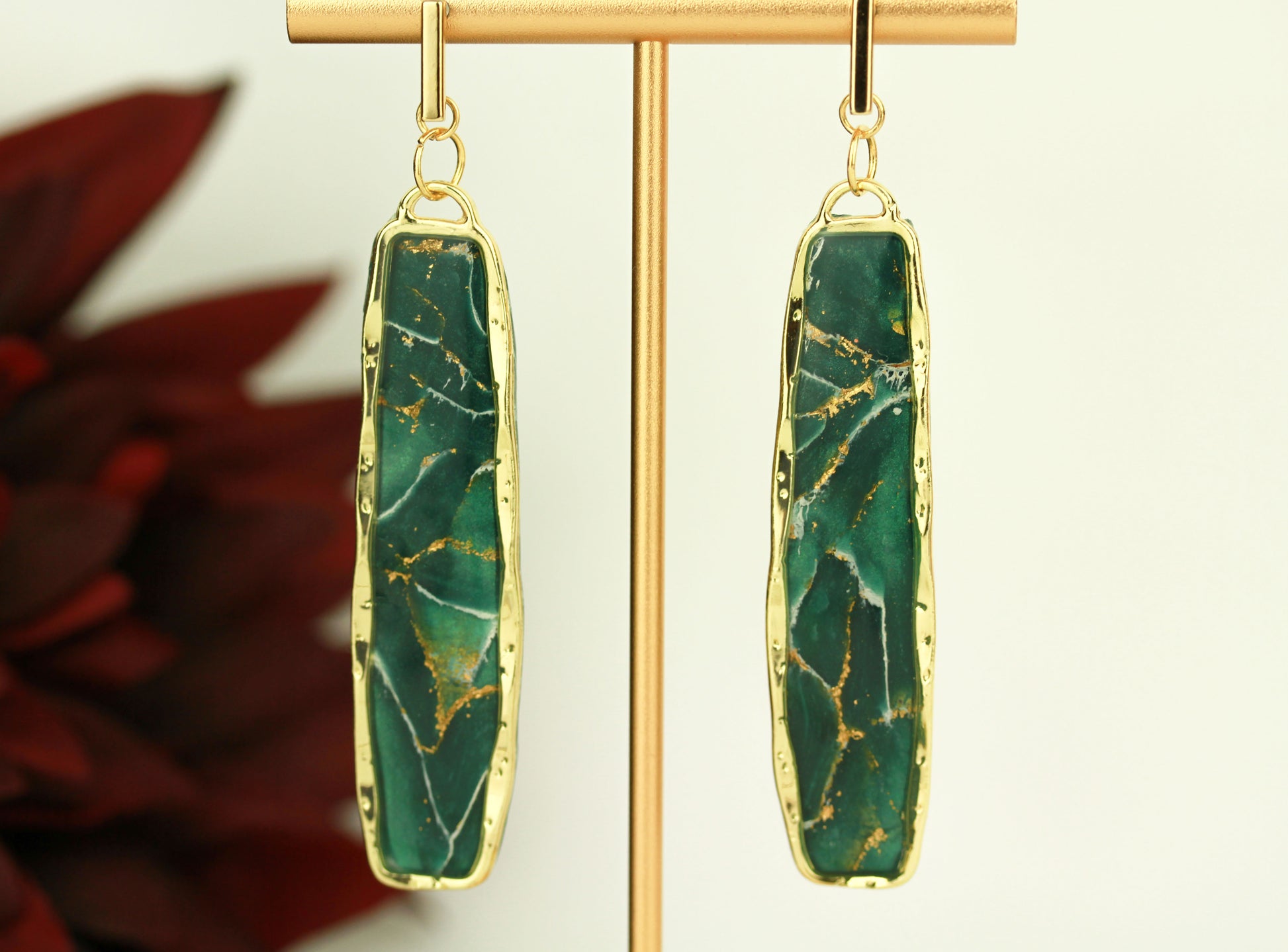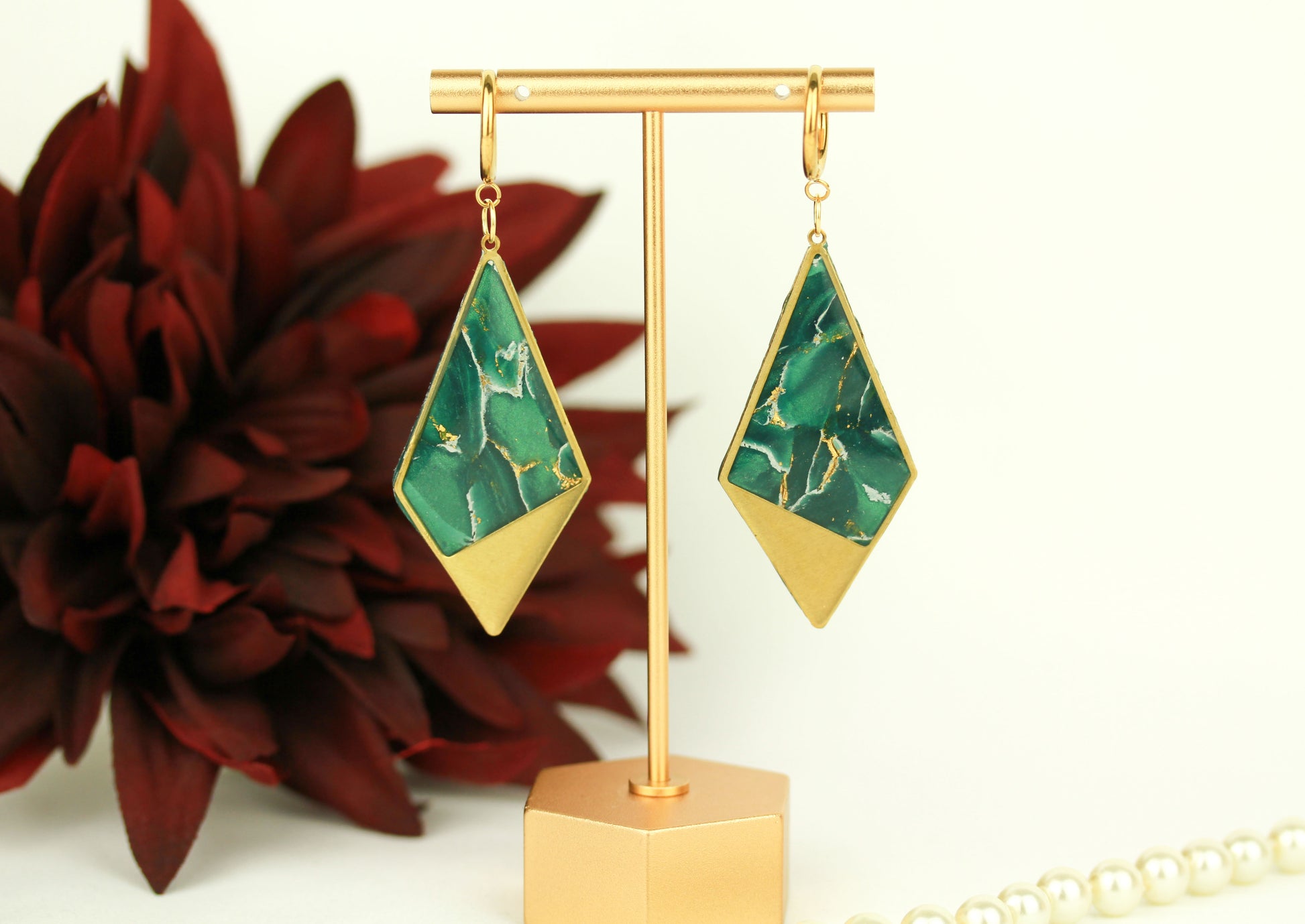 Entdecken Sie eine elegante Kollektion inspirierter Ohrringe mit natürlichem Stein-Design. Jedes Paar zeigt eine einzigartige grün-goldene Marmorierung aus hochwertigem Polymer Clay, die zeitlose Schönheit und Stil vereint.