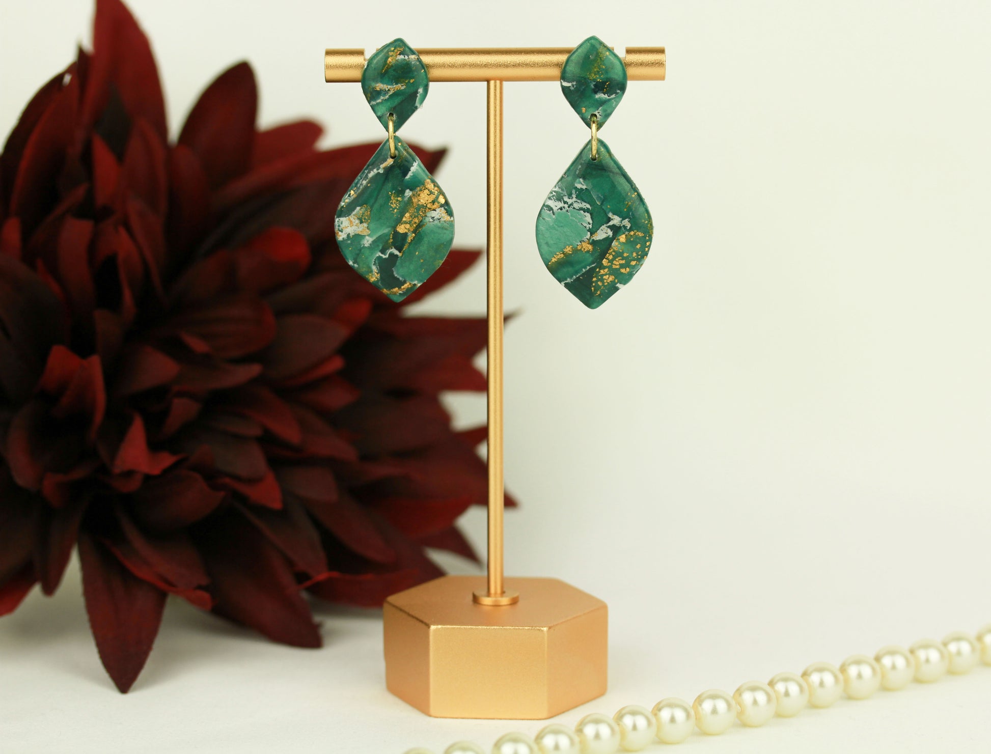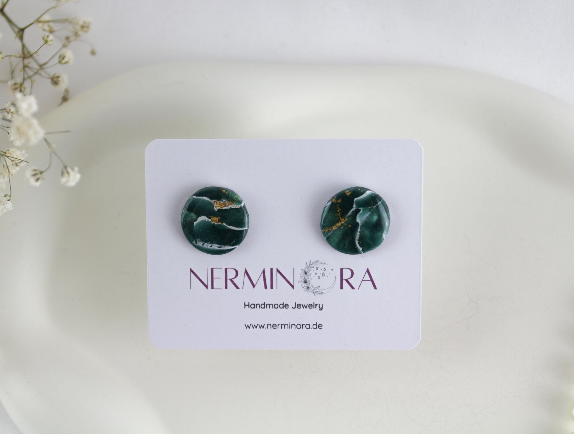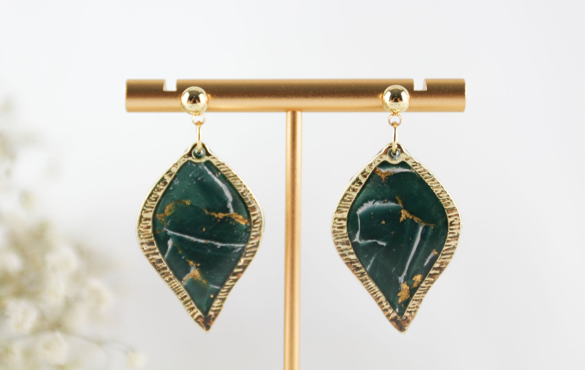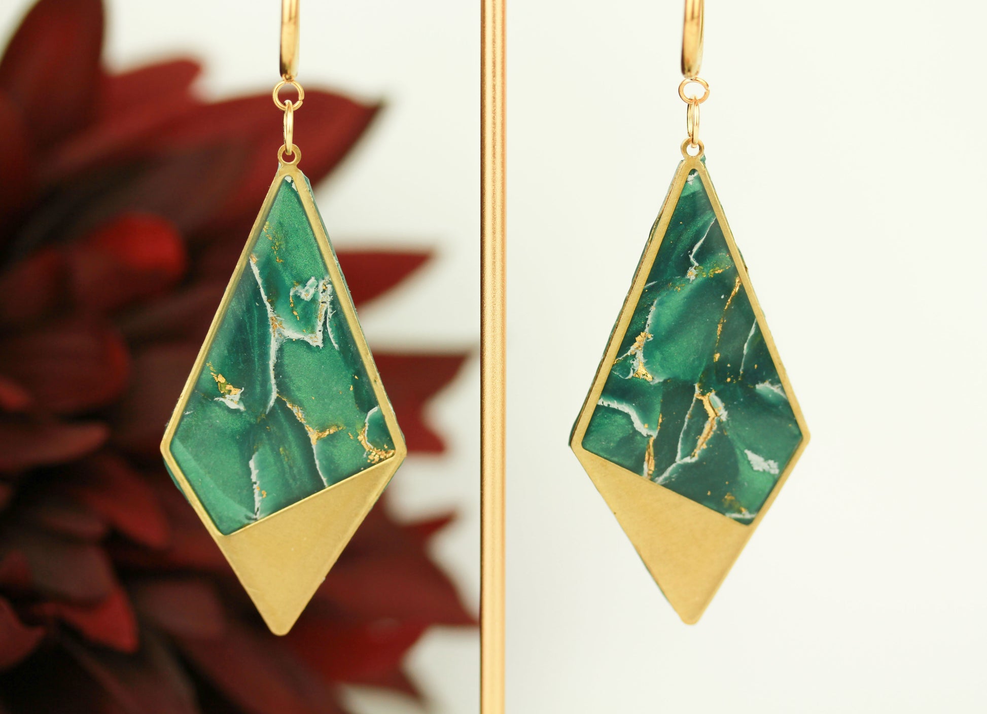 Entdecken Sie eine elegante Kollektion inspirierter Ohrringe mit natürlichem Stein-Design. Jedes Paar zeigt eine einzigartige grün-goldene Marmorierung aus hochwertigem Polymer Clay, die zeitlose Schönheit und Stil vereint.