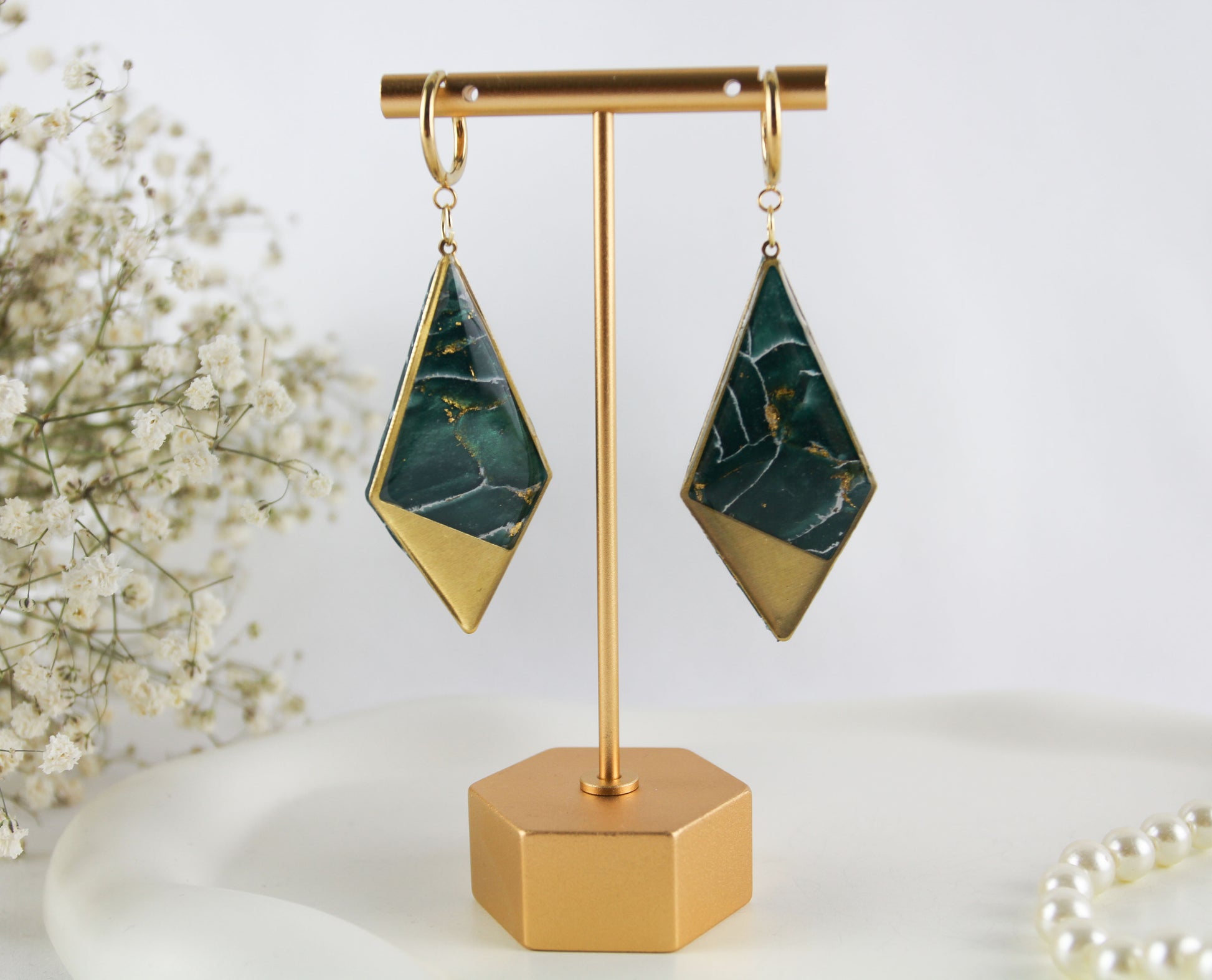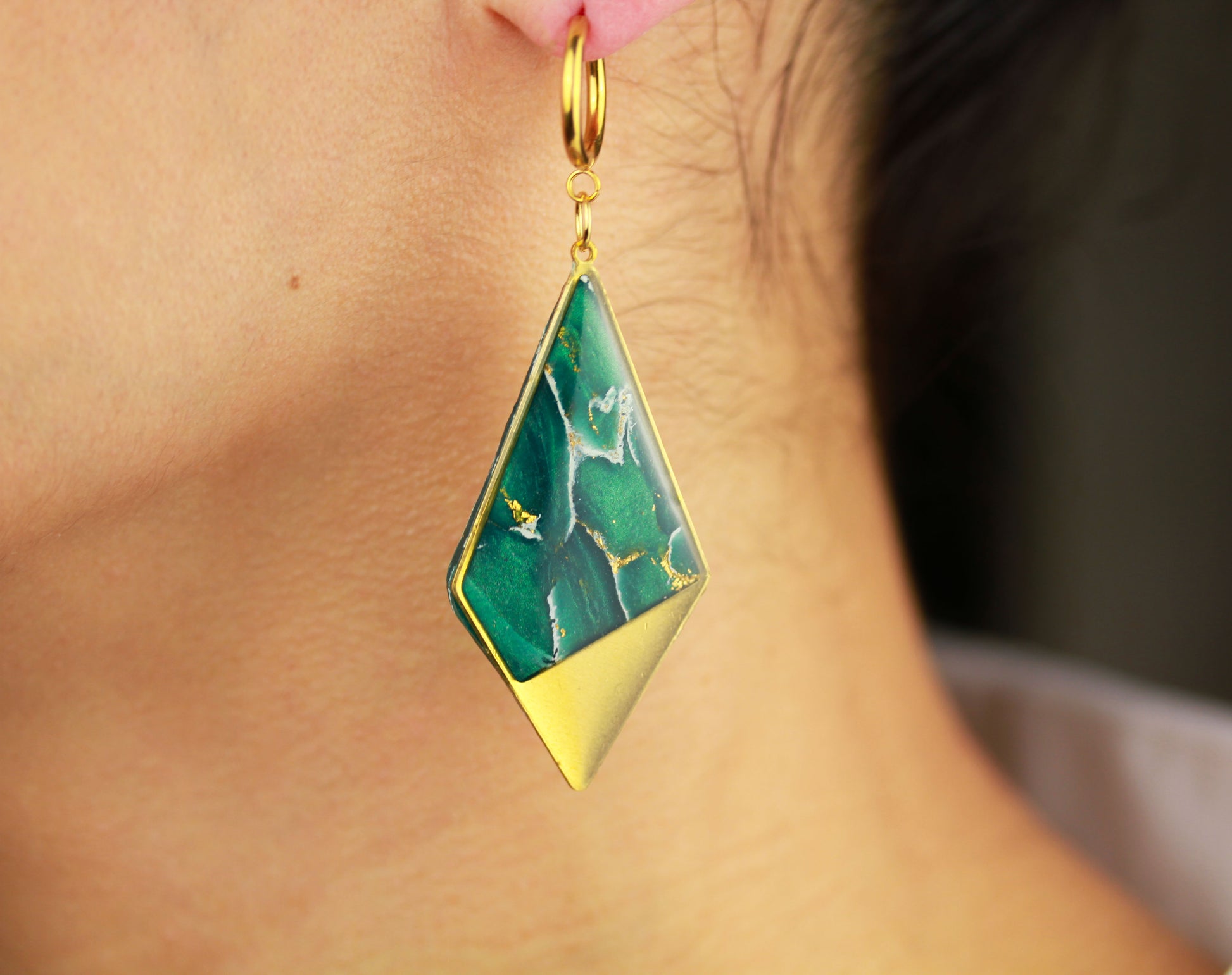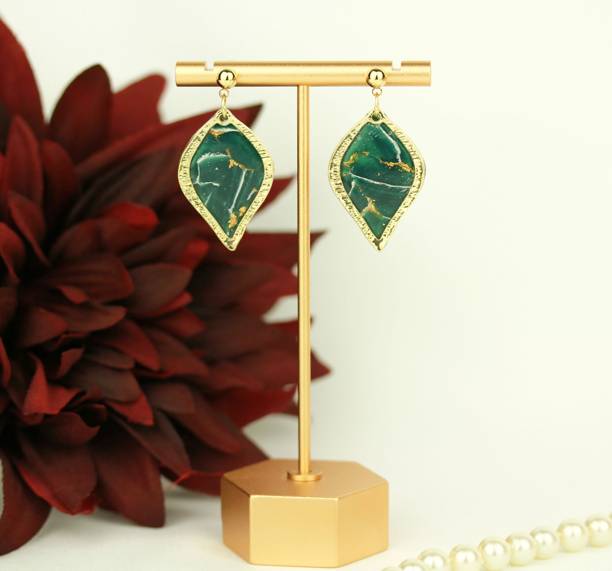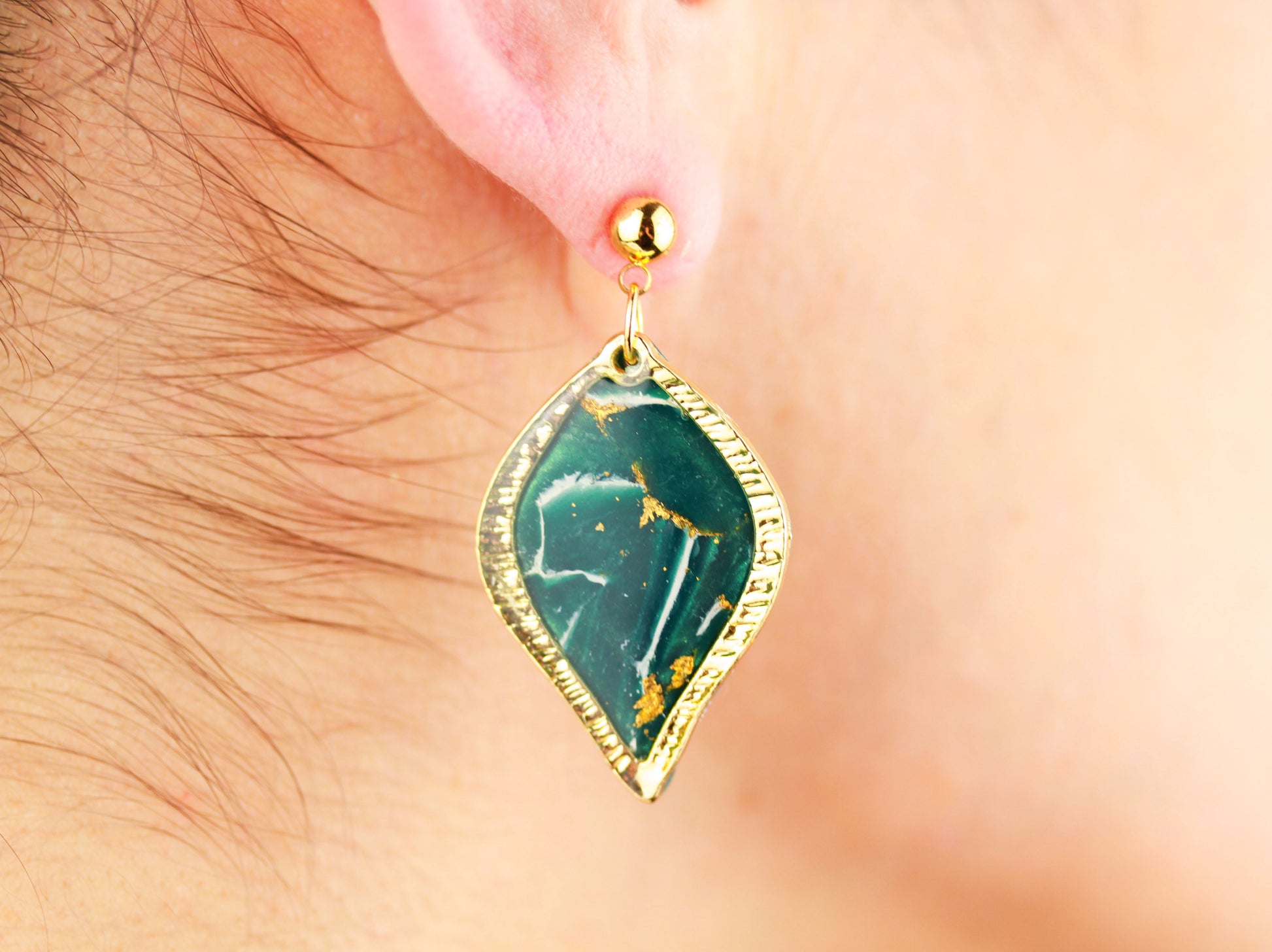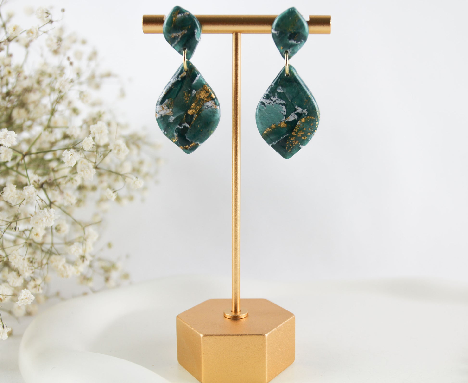 Entdecken Sie eine elegante Kollektion inspirierter Ohrringe mit natürlichem Stein-Design. Jedes Paar zeigt eine einzigartige grün-goldene Marmorierung aus hochwertigem Polymer Clay, die zeitlose Schönheit und Stil vereint.