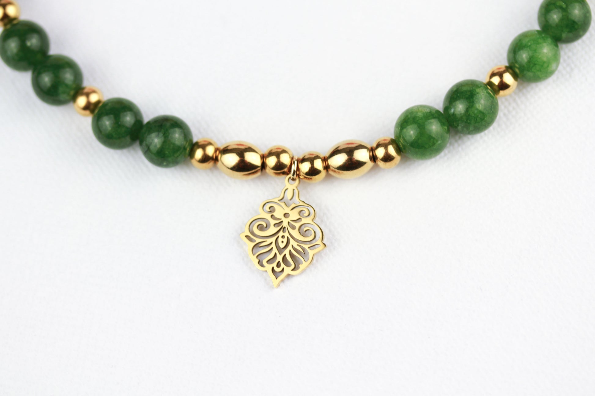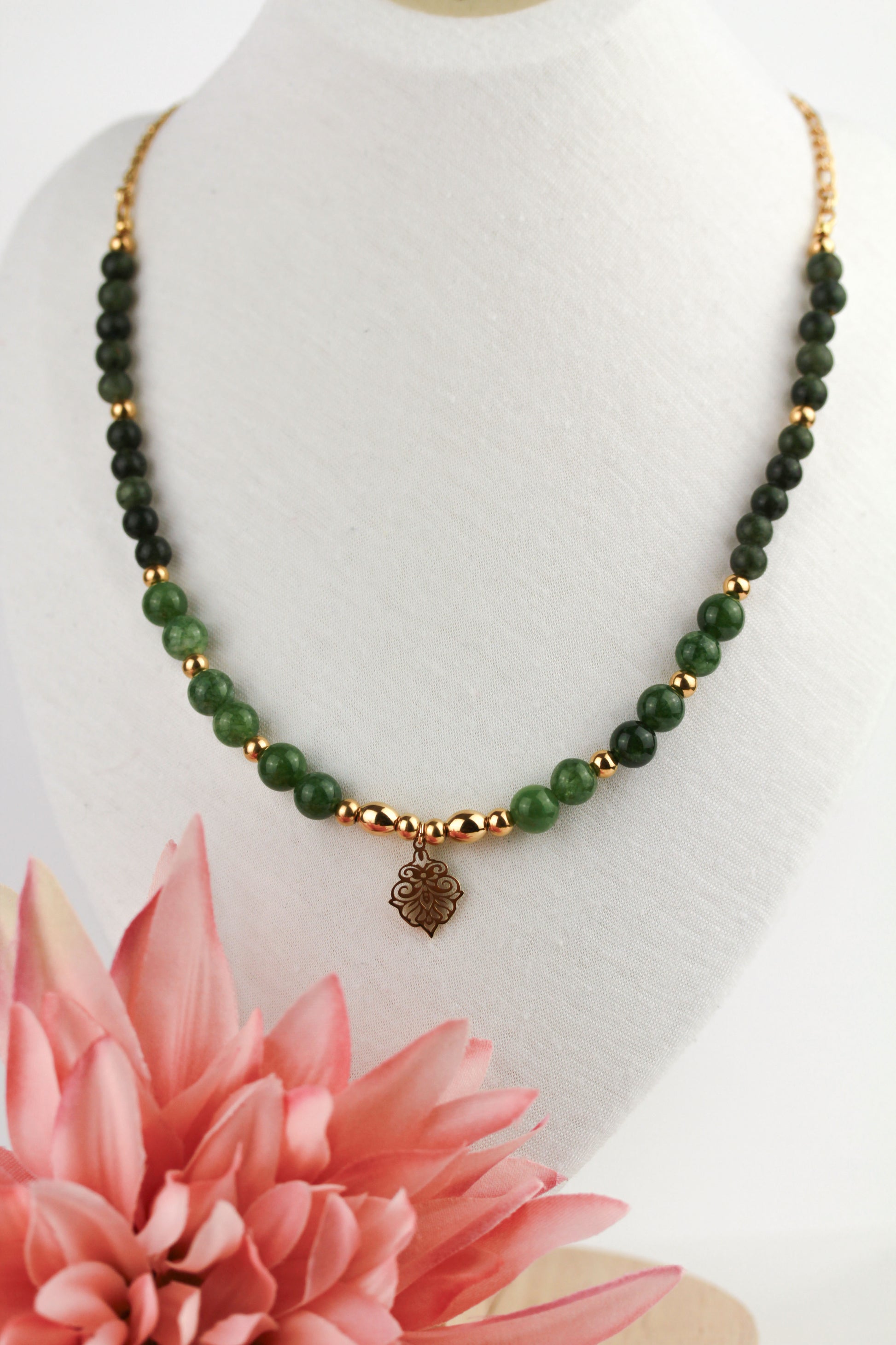 Grüne Serpentin Perlenkette mit Ornament-Anhänger – Handgefertigte Natursteinkette