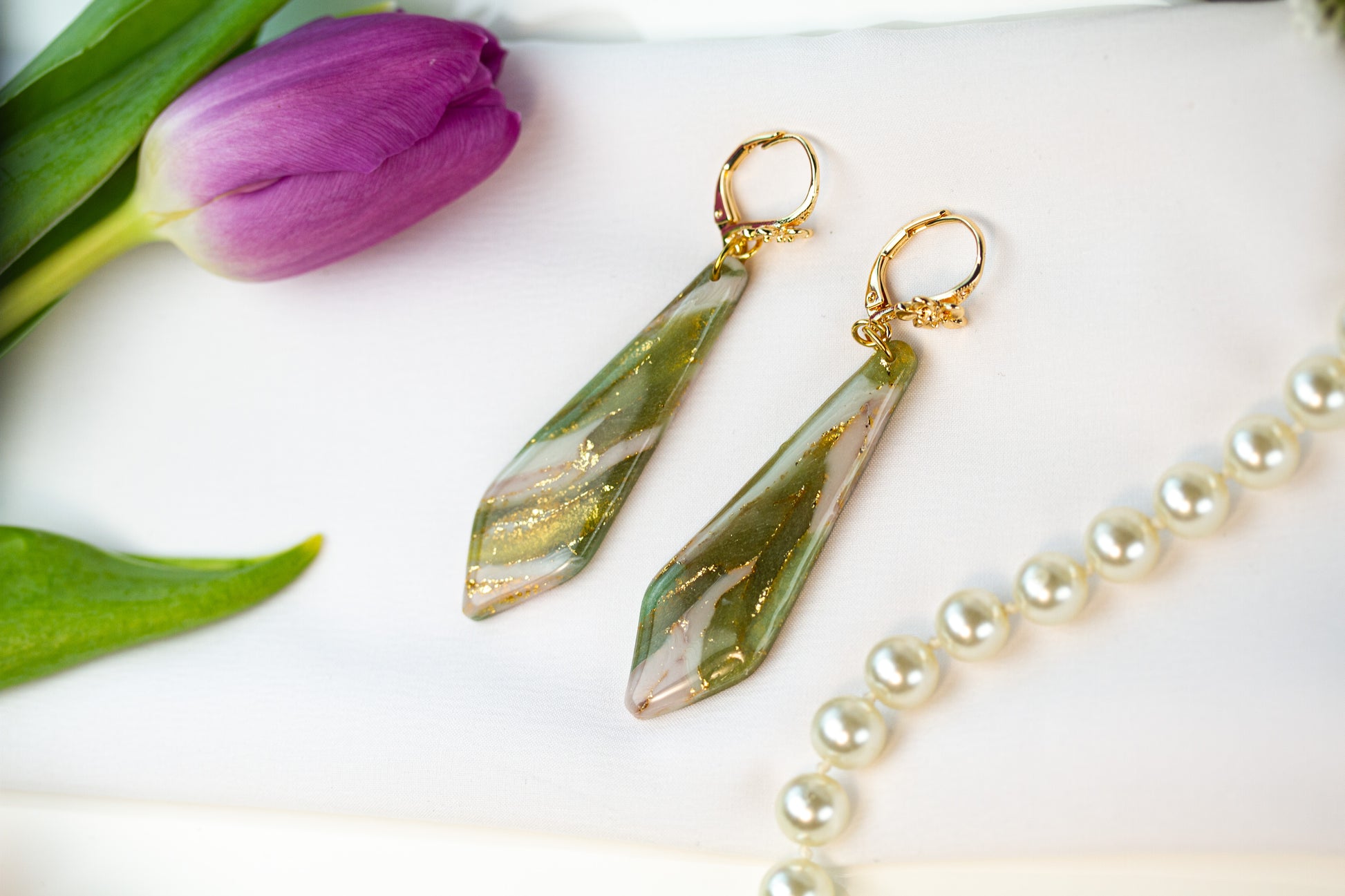Facettierte Ohrringe in Grün mit Goldschimmer – schlank, modern und mit feinem Lichtspiel.