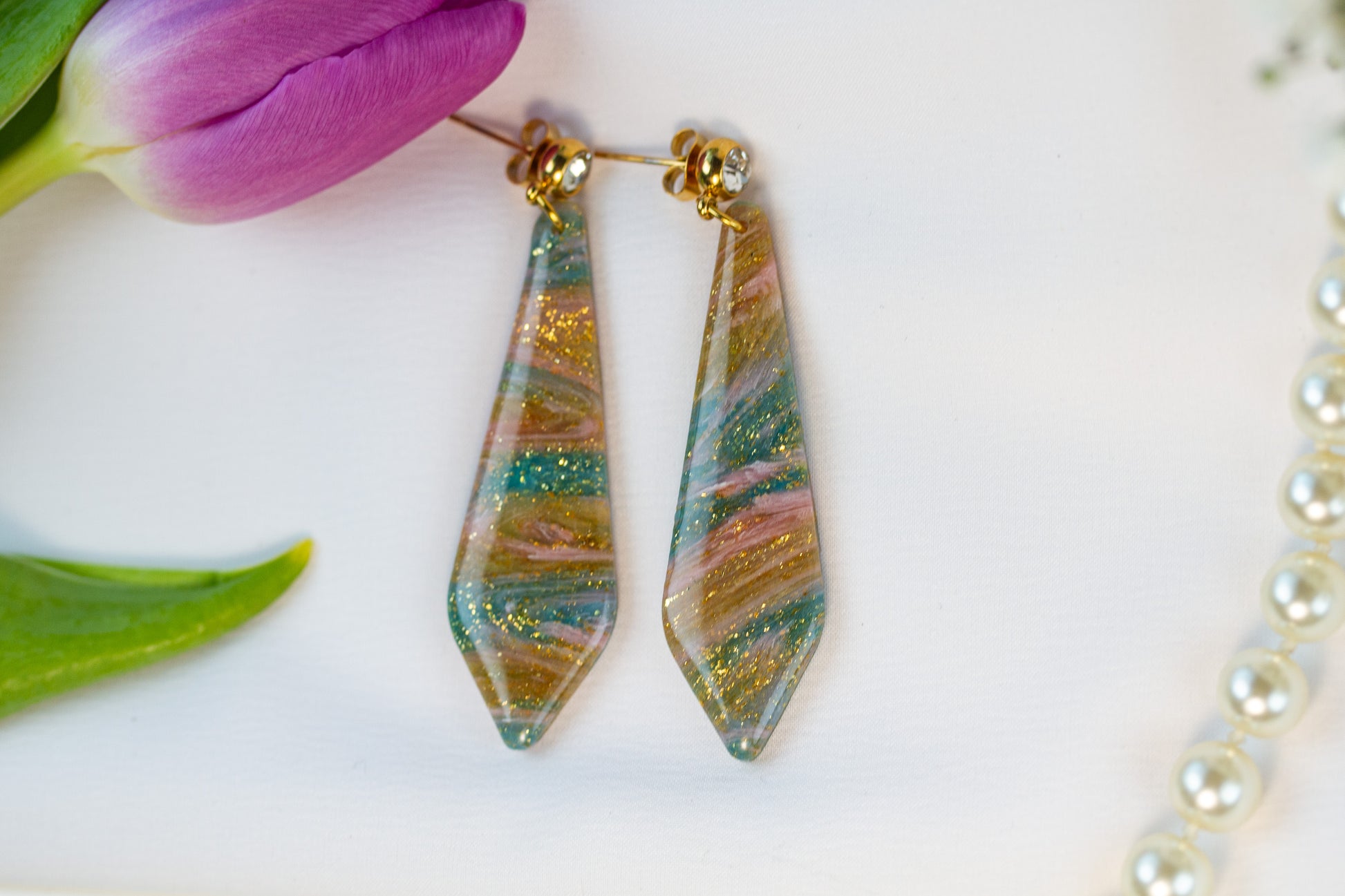 Lange Multicolor-Ohrringe mit Türkis, Grün und Gold – kunstvoll, leuchtend und dabei angenehm leicht.