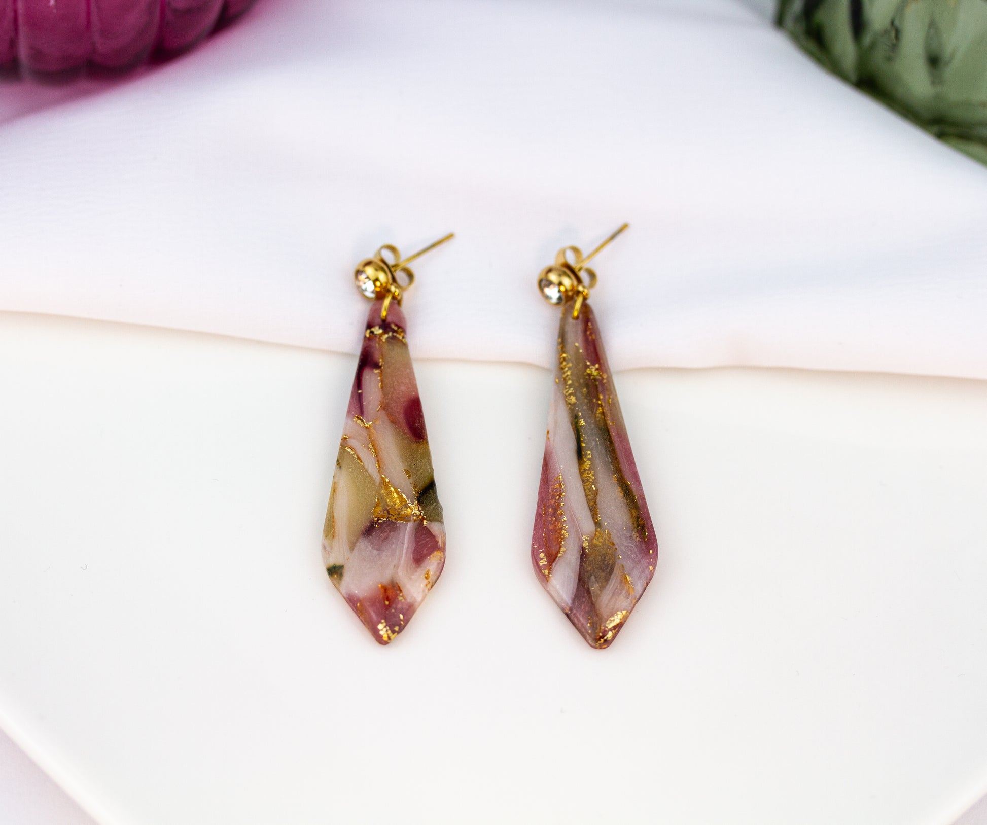 Lange Ohrringe in Nude-Rosé-Marmoroptik mit Goldakzent – schlank, modern und mit ruhiger Farbwirkung.