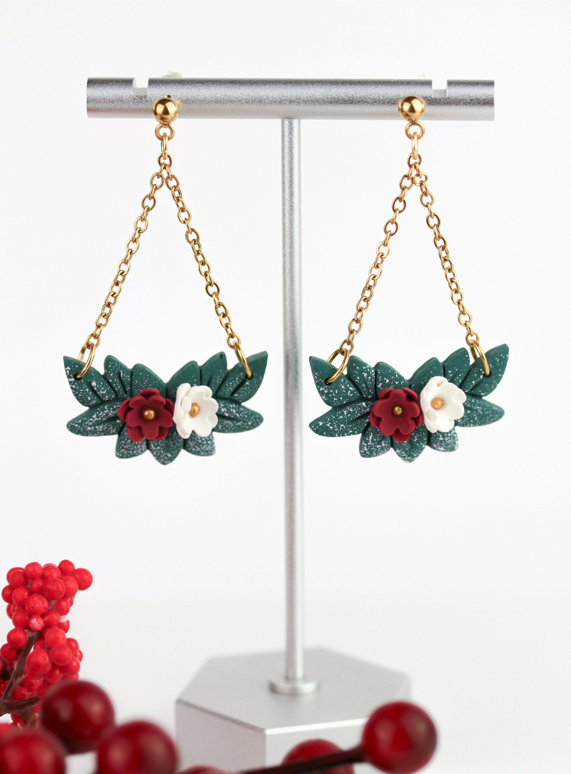 Elegante Hängeohrringe mit handgefertigtem Mistelzweig-Motiv aus Polymer Clay. Das Design vereint rote und weiße Blüten in weihnachtlicher Ästhetik und hängt anmutig an feinen Kettengliedern. Jedes Paar ist ein Unikat, das zeitlose Festlichkeit mit modernem Statement-Style verbindet.