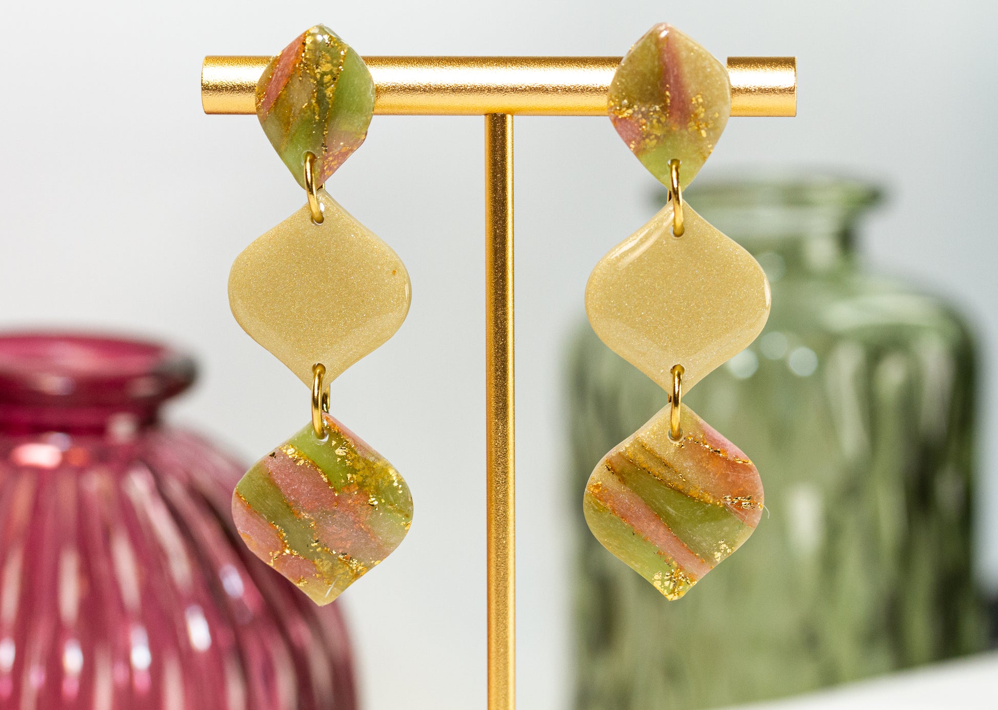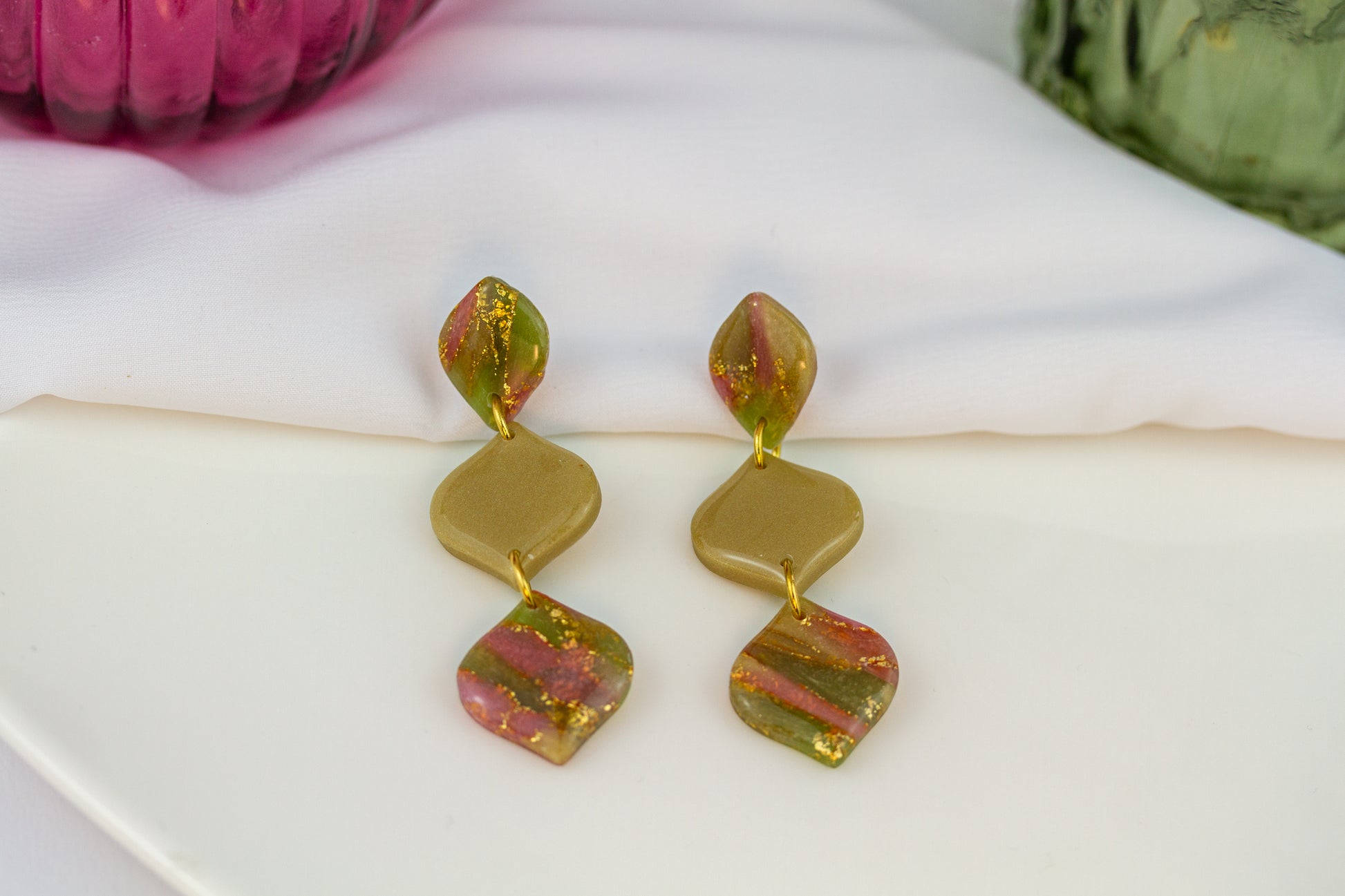 Dreiteilige Statement-Ohrringe in Olive mit klarer Geometrie – markant und harmonisch aufgebaut.