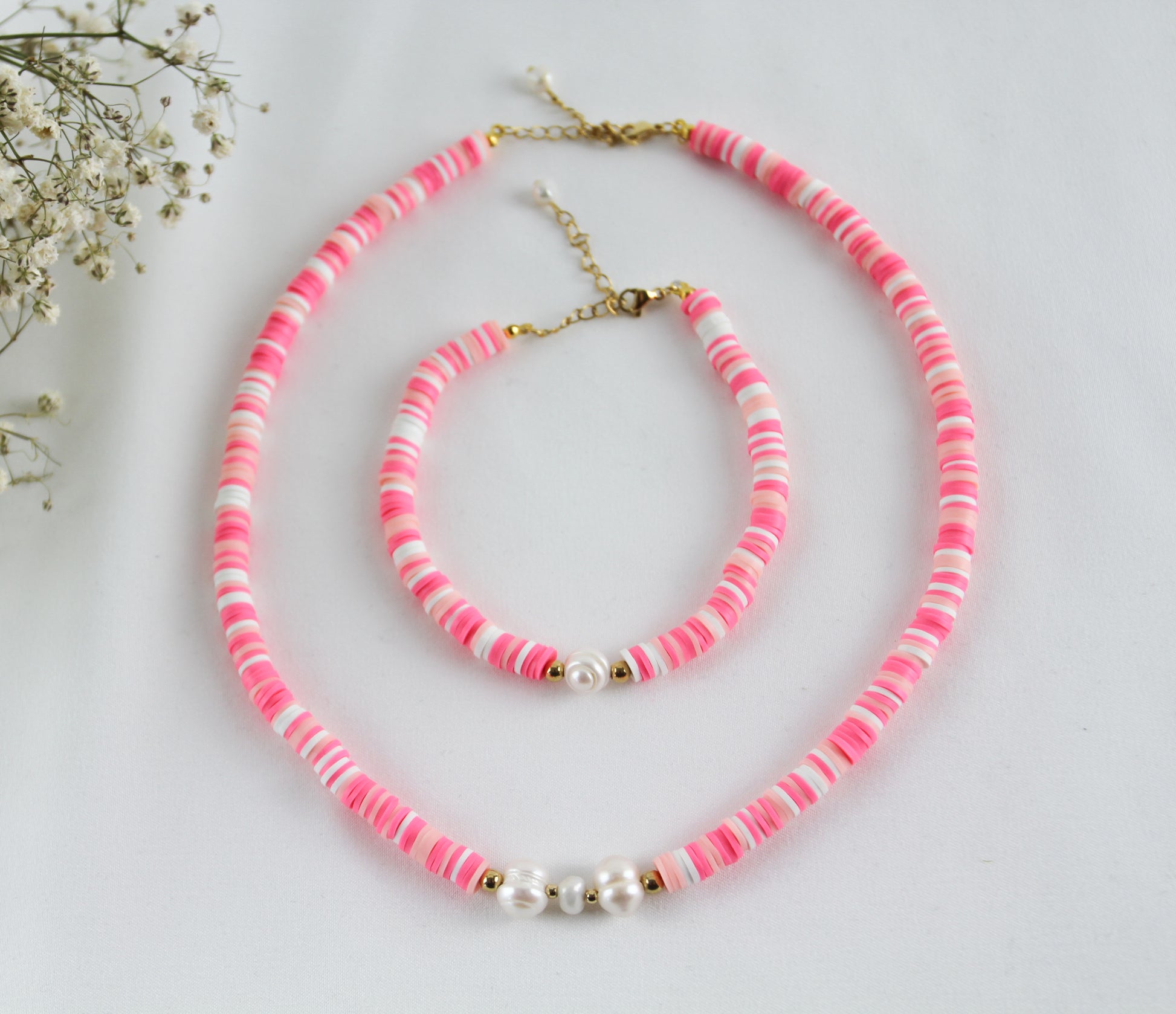 Rosa-Weiß Katsuki Schmuckset mit Süßwasserperle – Handgefertigte Halskette & Armband
