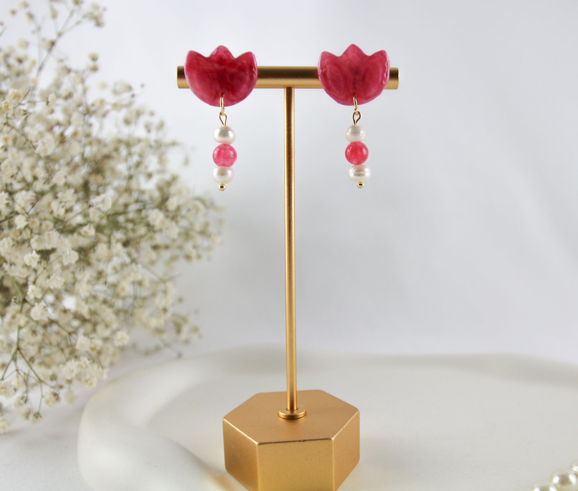 Rosenrote Naturstein-inspirierte Polymer Clay Ohrringe mit Süßwasserperlen – Handgemacht