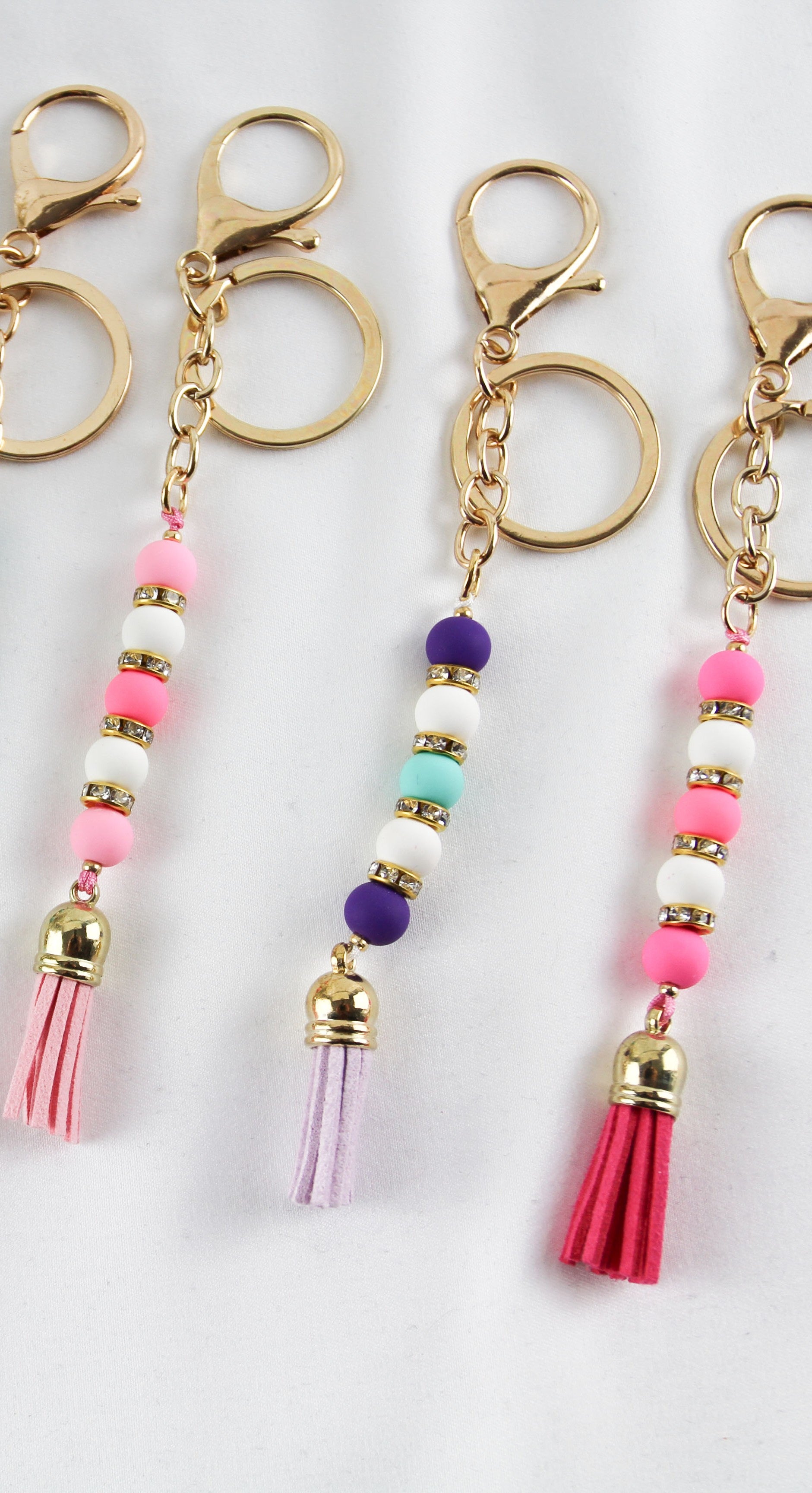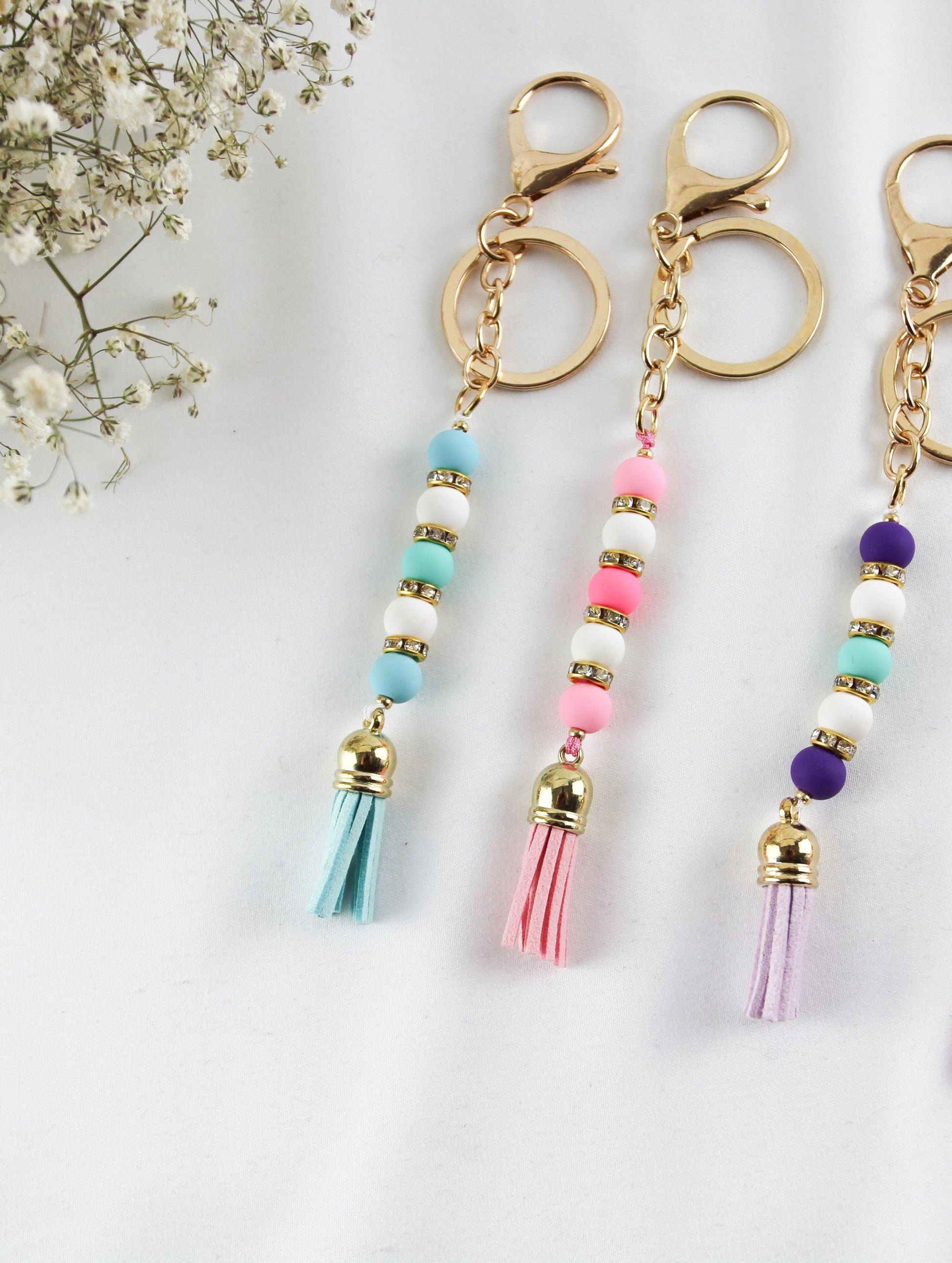 Dieser Schlüsselanhänger aus Silikonperlen und Quasten ist ein niedliches und vielseitiges Accessoire. Diese Schlüsselanhänger bestehen oft aus bunten Silikonperlen und einer Quaste am Ende, die zusätzlichen Charme verleiht.