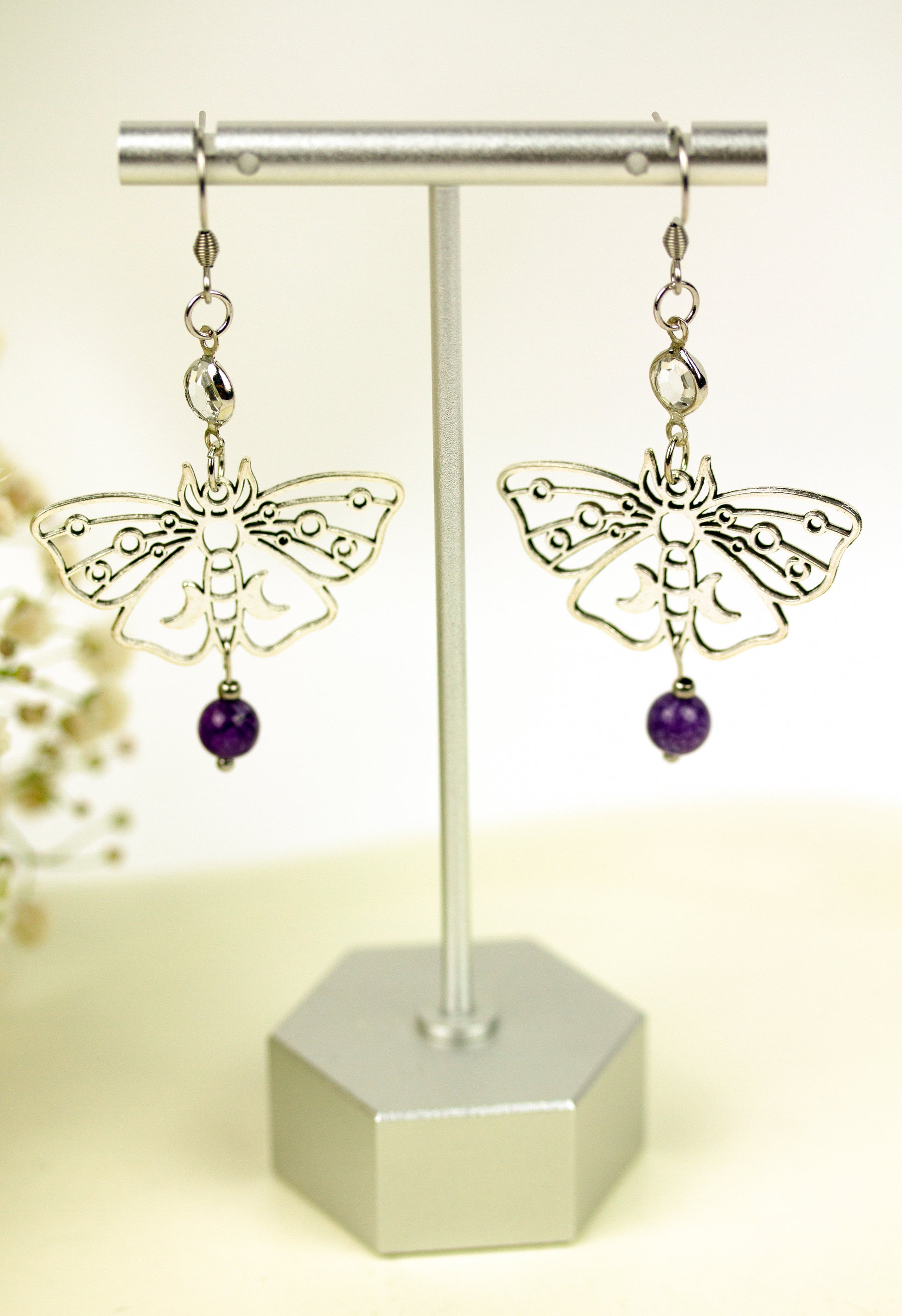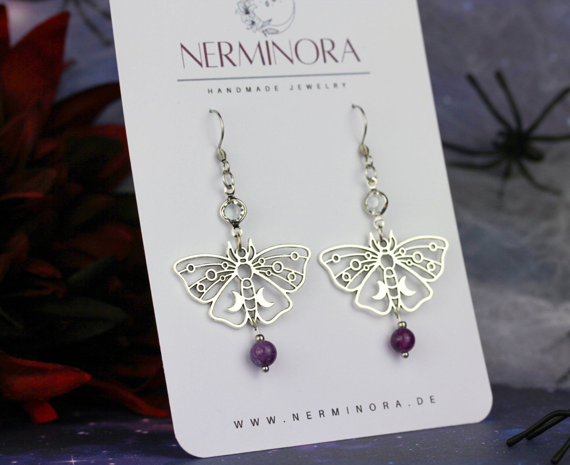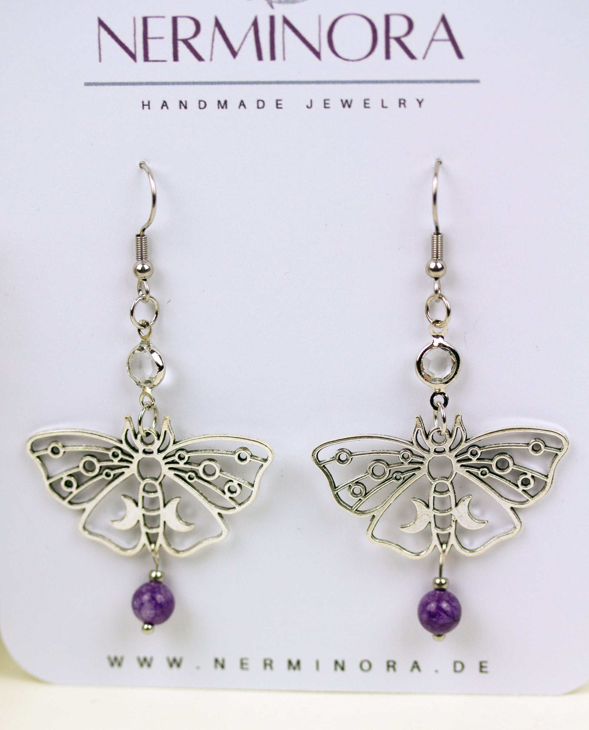Silberne Schmetterling Ohrringe mit lila Natursteinperlen – Amberwing Kollektion