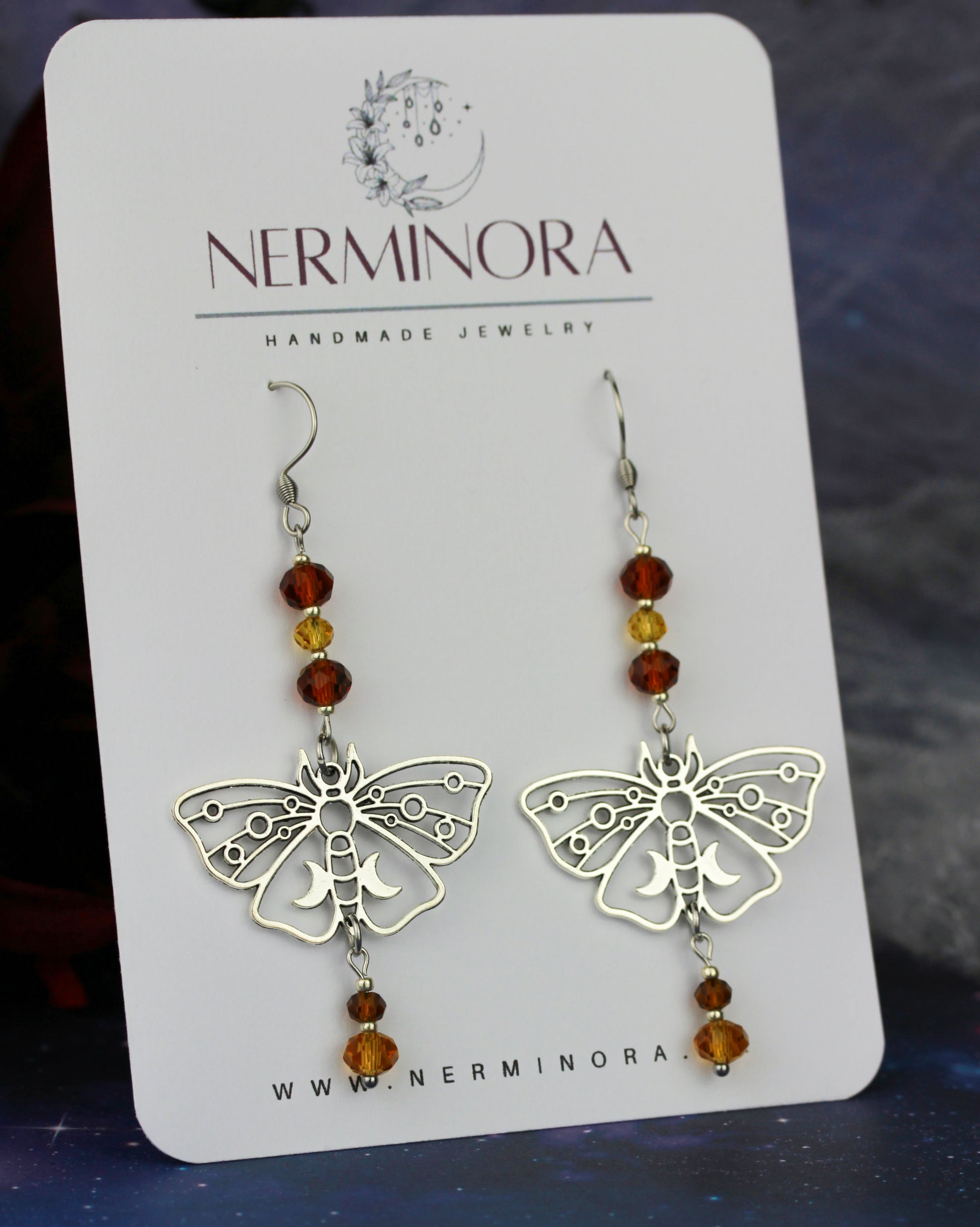 Silver Butterfly Ohrringe mit gelb-braunen Kristallperlen – Amberwing Kollektion