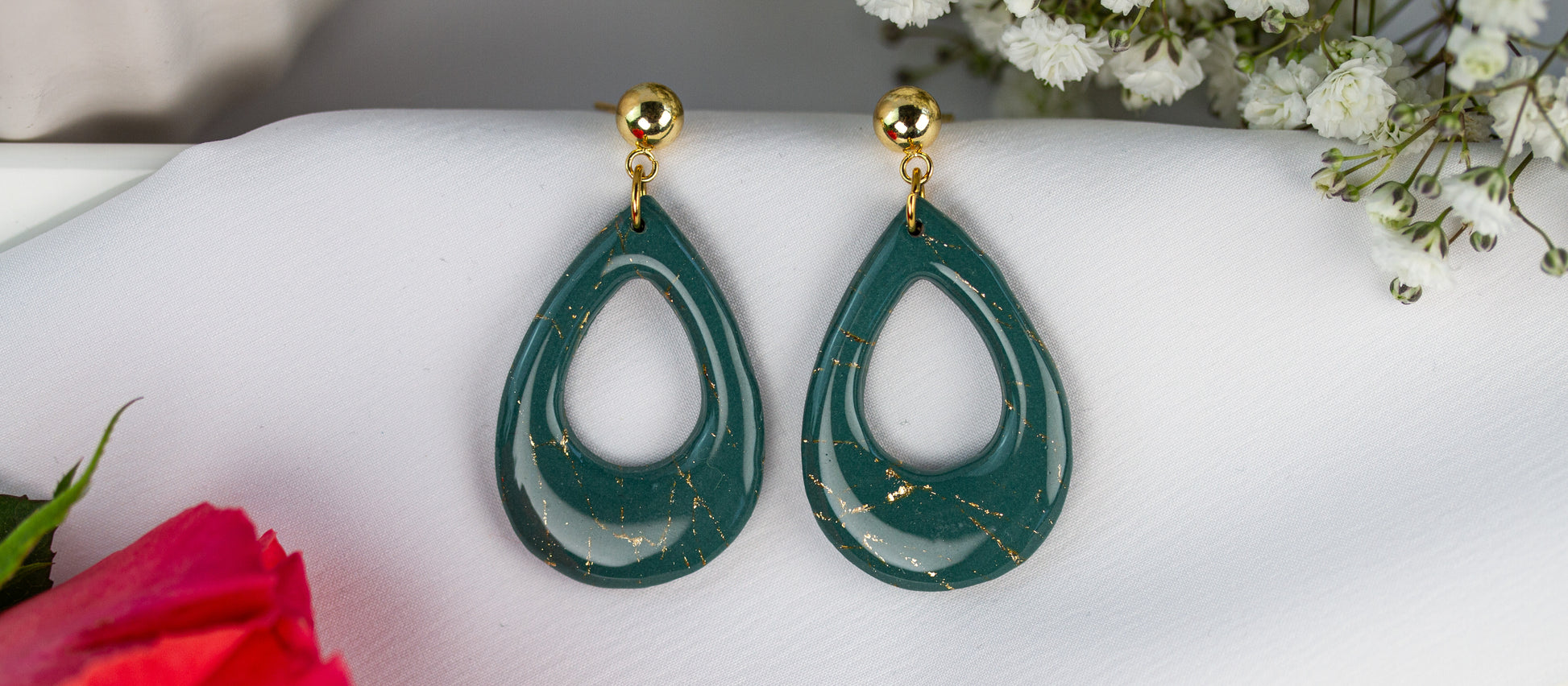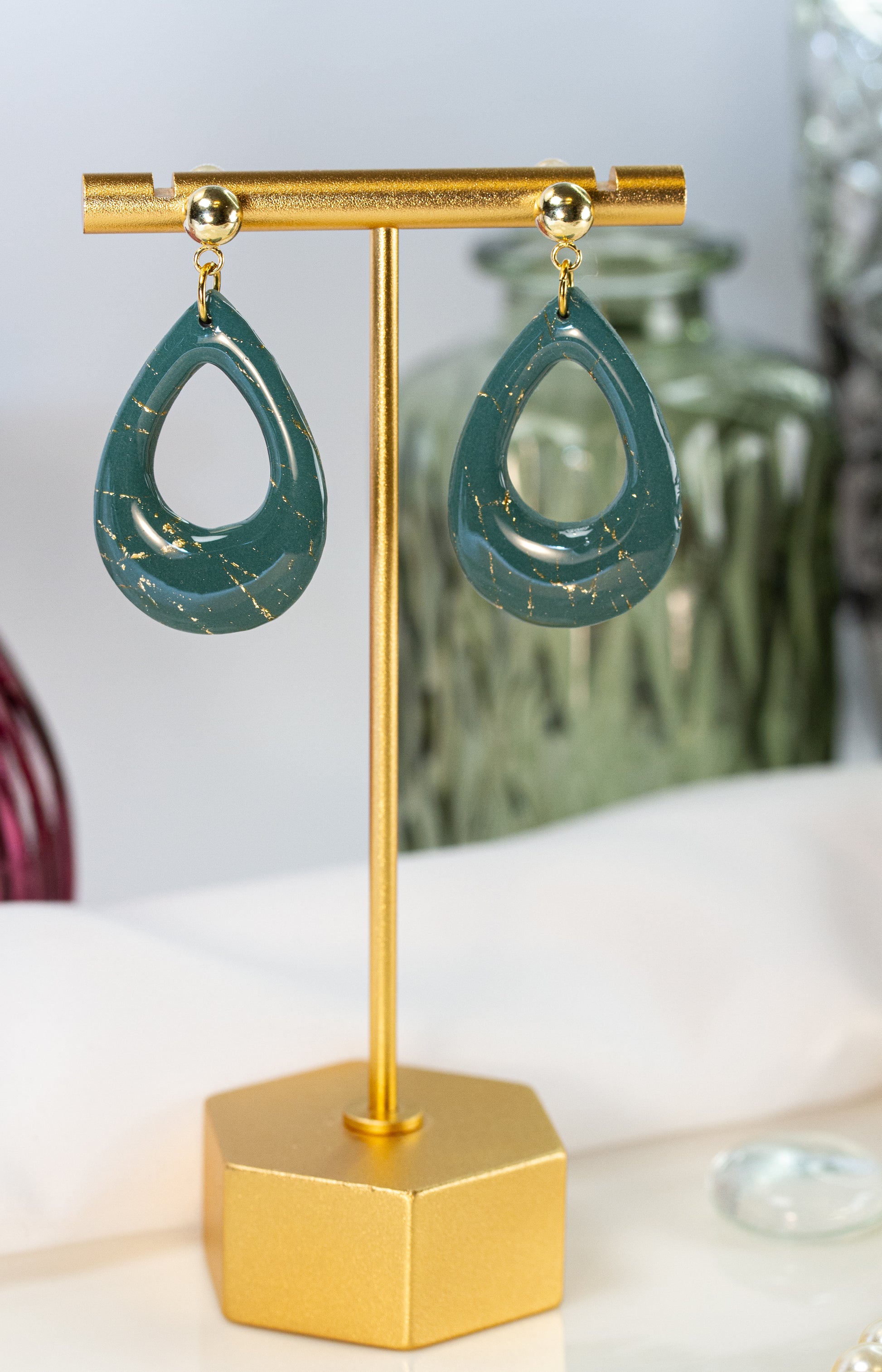 Die offene Tropfenform wirkt klar und leicht. Das Petrolgrün bringt eine ruhige, elegante Wirkung, während die Goldsprenkel das Licht subtil aufnehmen – ideal für Alltagslooks mit Anspruch oder als sauberer Akzent zu Abend-Outfits.