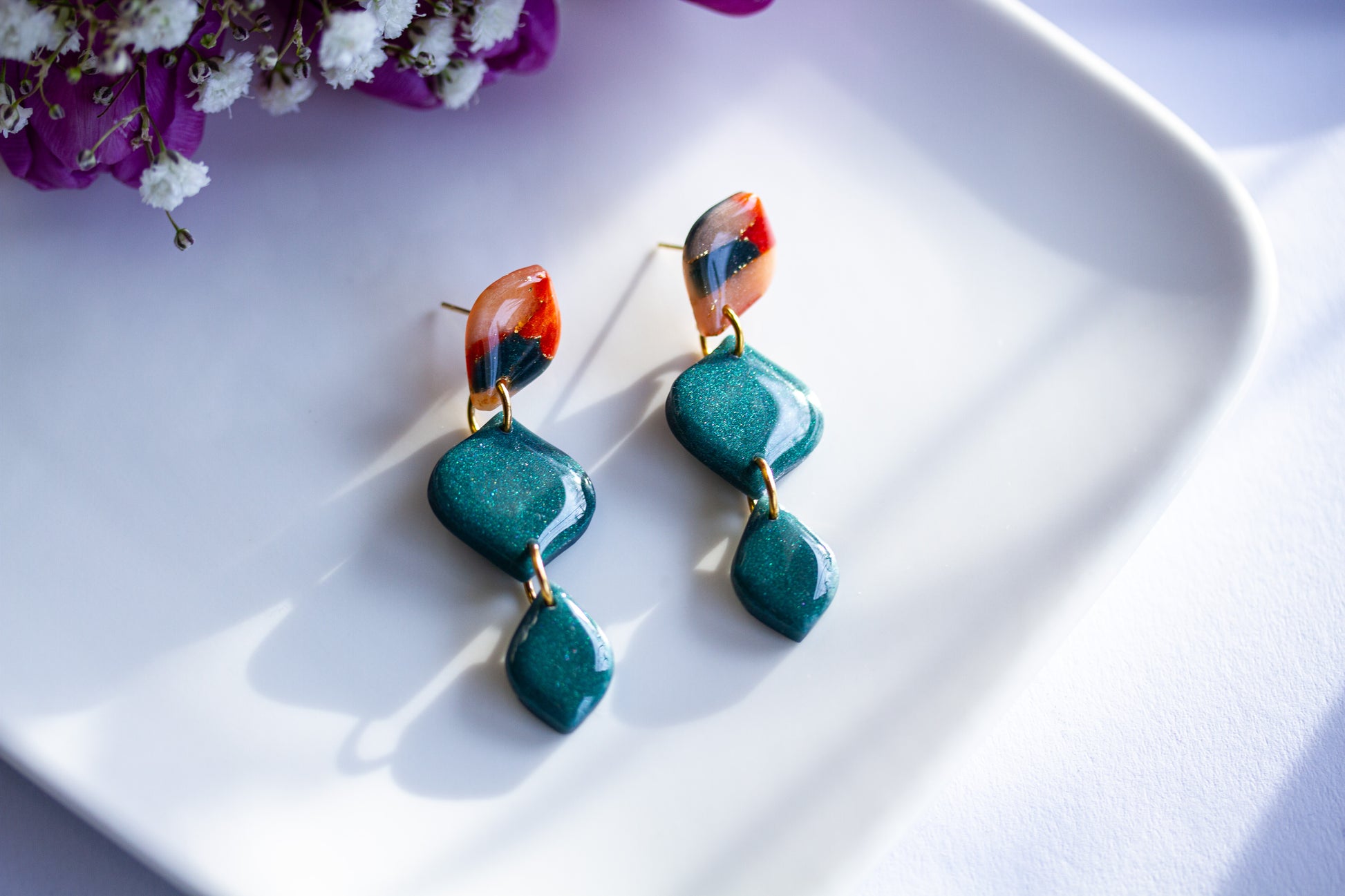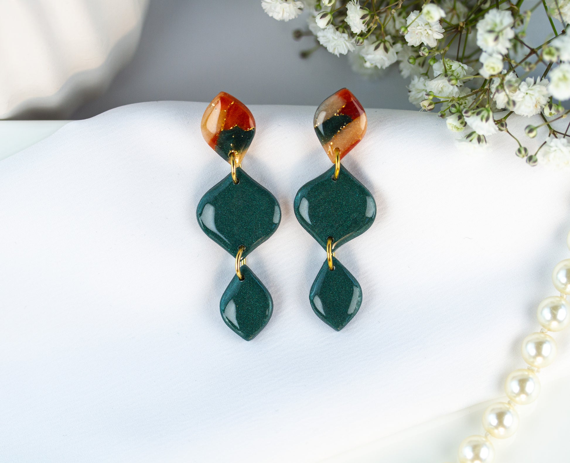 Dreiteilige Dangle-Ohrringe in Dunkelgrün – modern aufgebaut und mit ruhiger, markanter Farbwirkung.