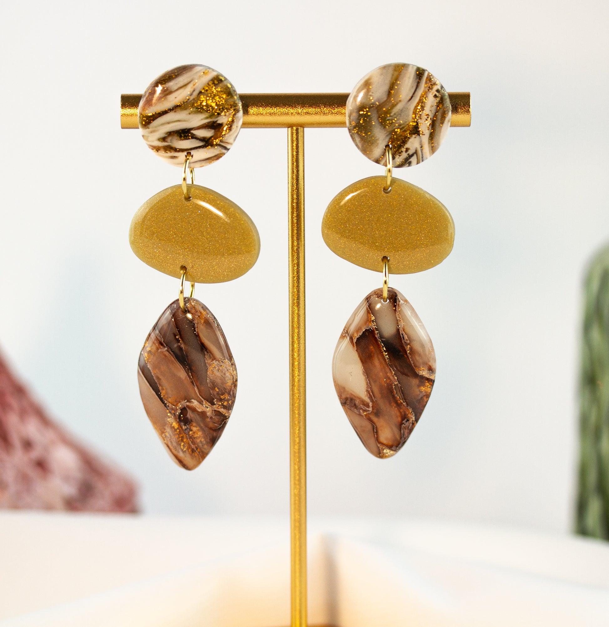 Statement-Ohrringe in Blattform mit Olivton und Marmorstruktur – ausdrucksstark und naturinspiriert.