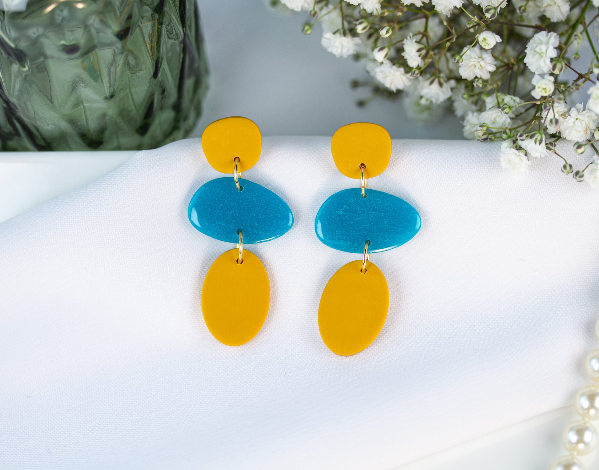 Farbstarke geometrische Statement-Ohrringe in Türkis und Senfgelb – modern, lebendig und dabei angenehm leicht zu tragen.