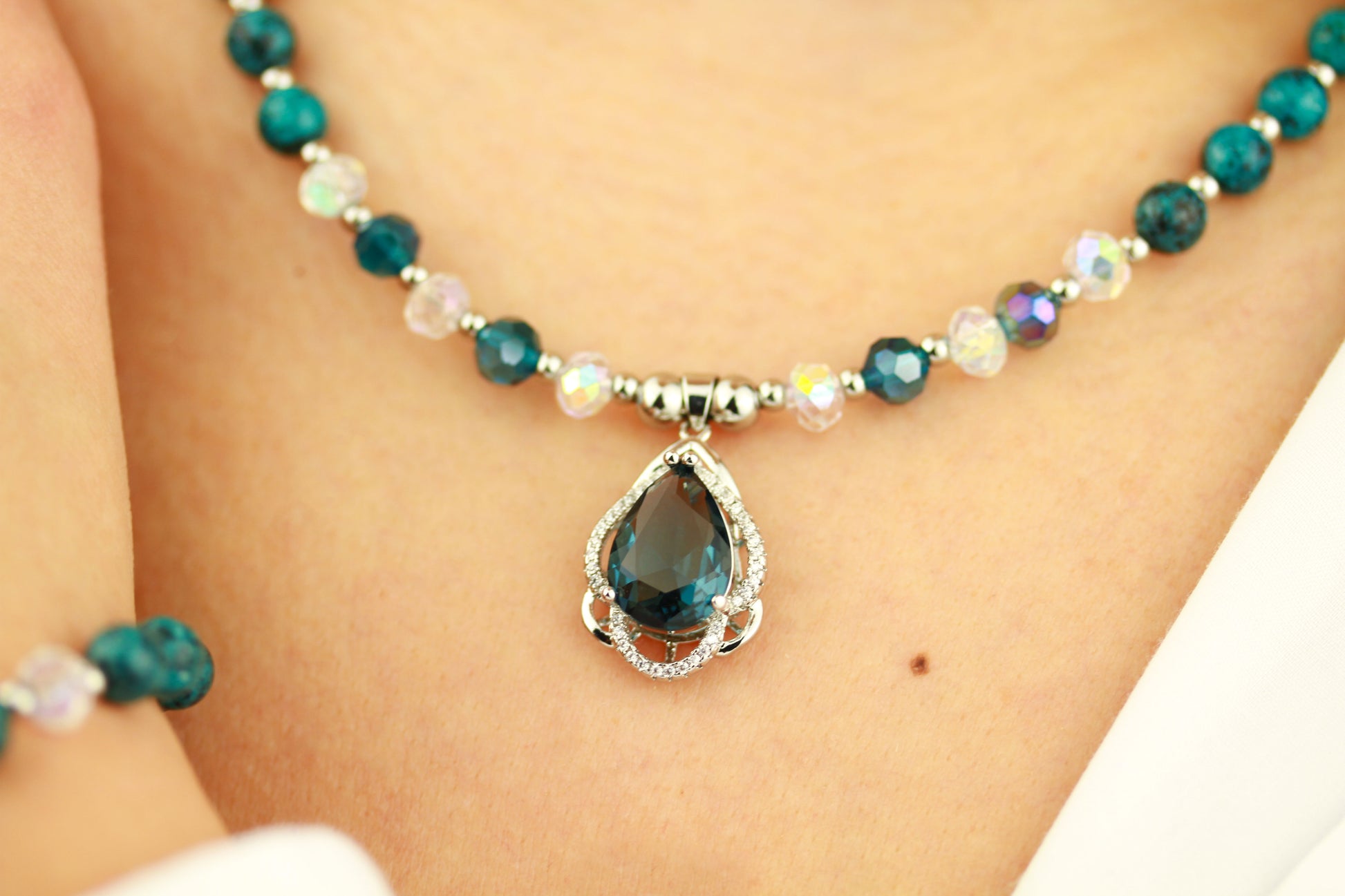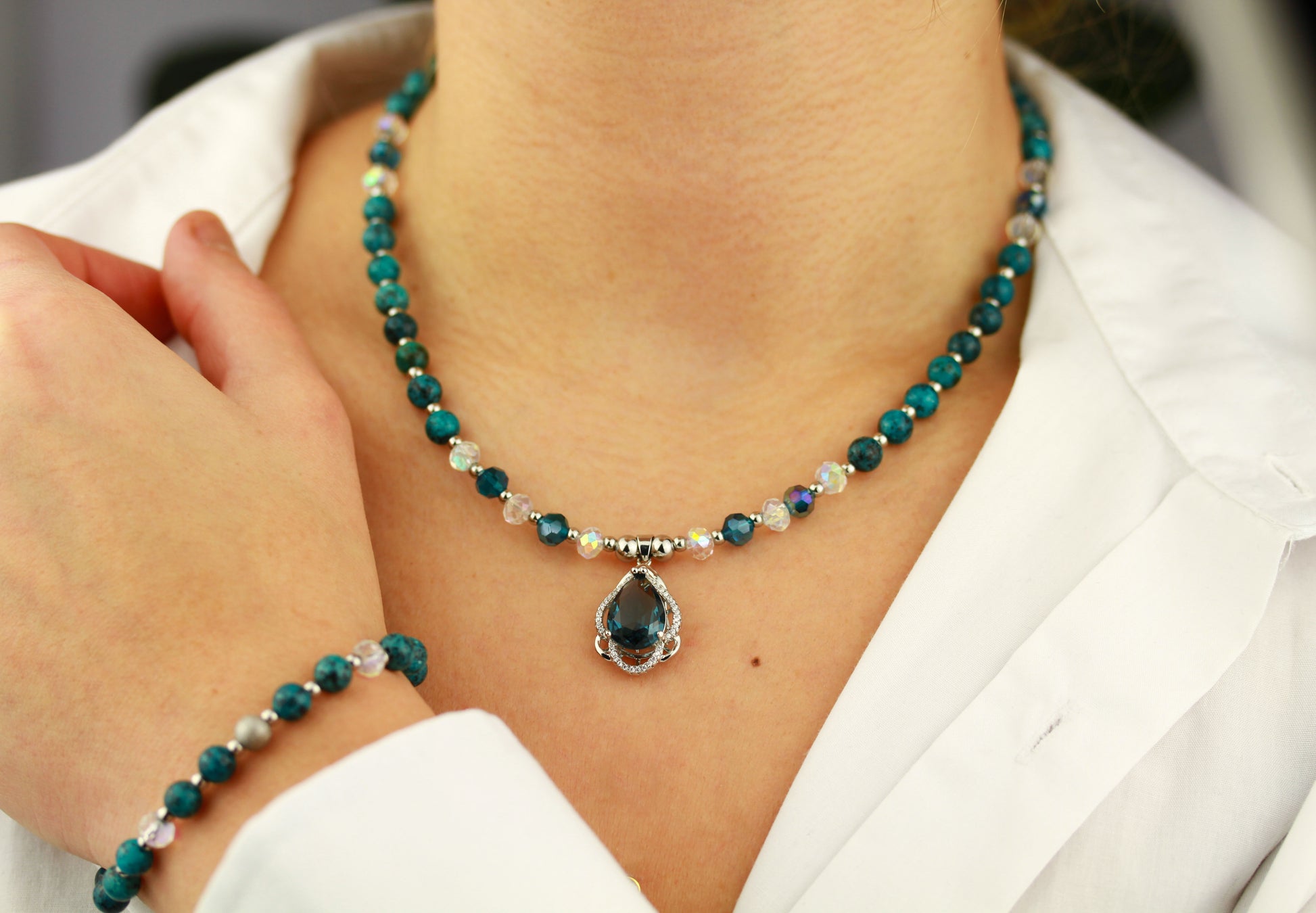 Dieses raffinierte Schmuckset präsentiert eine elegante Kombination aus türkis-blauen Perlen mit einem kunstvoll gestalteten Anhänger. Der Anhänger besticht durch eine sorgfältige Komposition funkelnder Kristalle, die um einen zentralen blauen Kristall angeordnet sind – ein Design, das Tiefe und Brillanz ausstrahlt. Die harmonische Farbpalette in Türkis und Blau erzeugt eine beruhigende, zeitlose Ästhetik. Halskette und Armband sind aufeinander abgestimmt und bilden ein kohärentes Gesamtwerk. Jedes handgefertigte Stück besticht durch hochwertige Materialien, präzise Verarbeitung und durchdachte Details. Ein exquisites Geschenkset für Kenner, die Eleganz mit handwerklicher Meisterschaft schätzen.