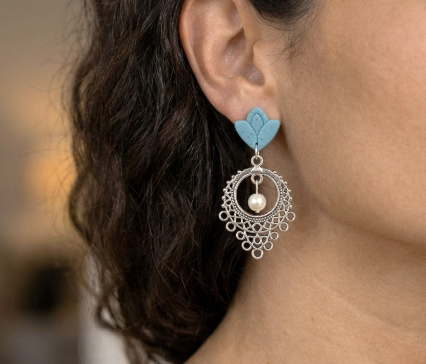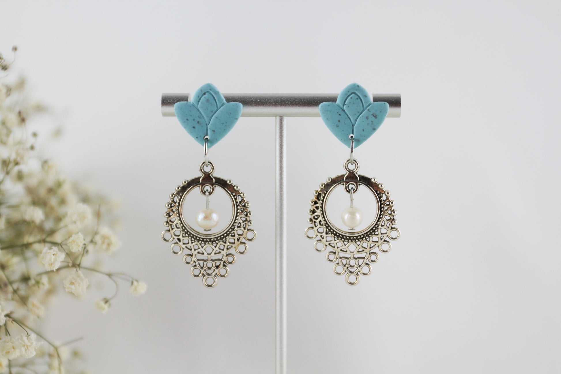 Erlebe den exklusiven Orient - Boho Style mit diesen türkisen Polymer Clay Ohrringen, verziert mit silberfarbigem Element, welches mittig mit einer Süßwasserperle abgerundet wird. Diese Ohrringe verleihen deinem Look einen Hauch von Luxus..