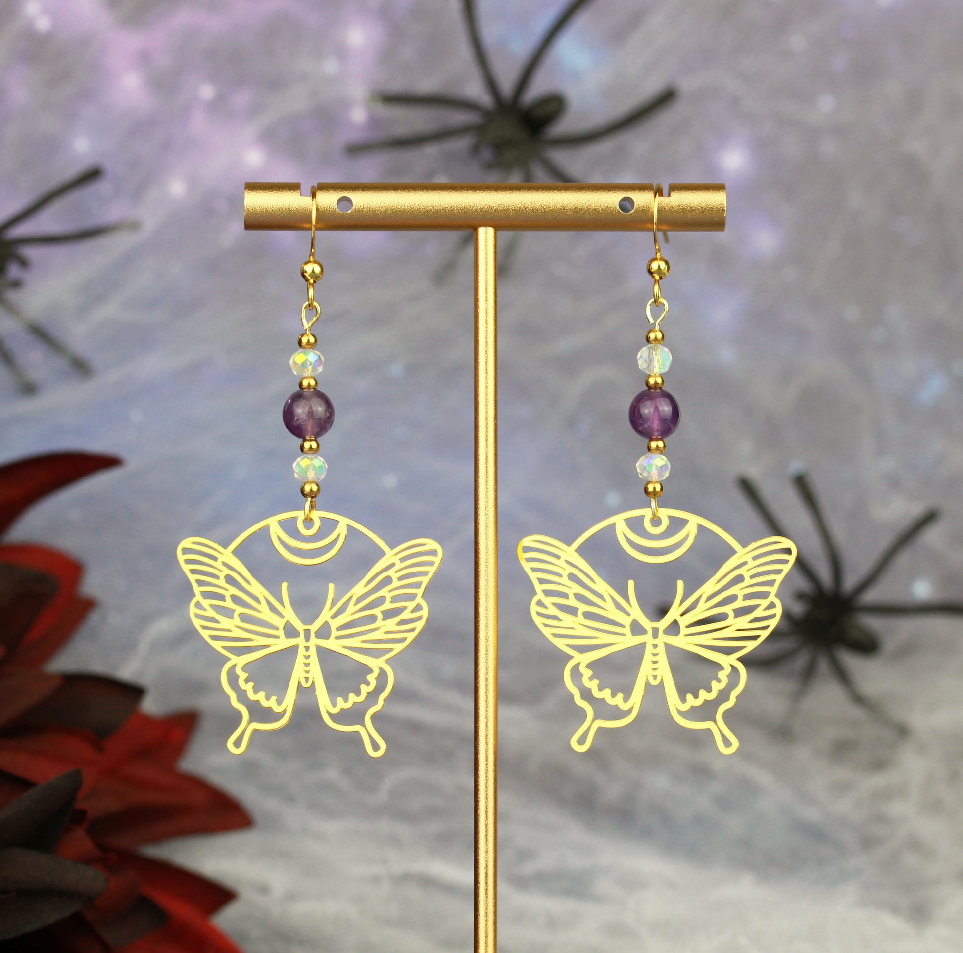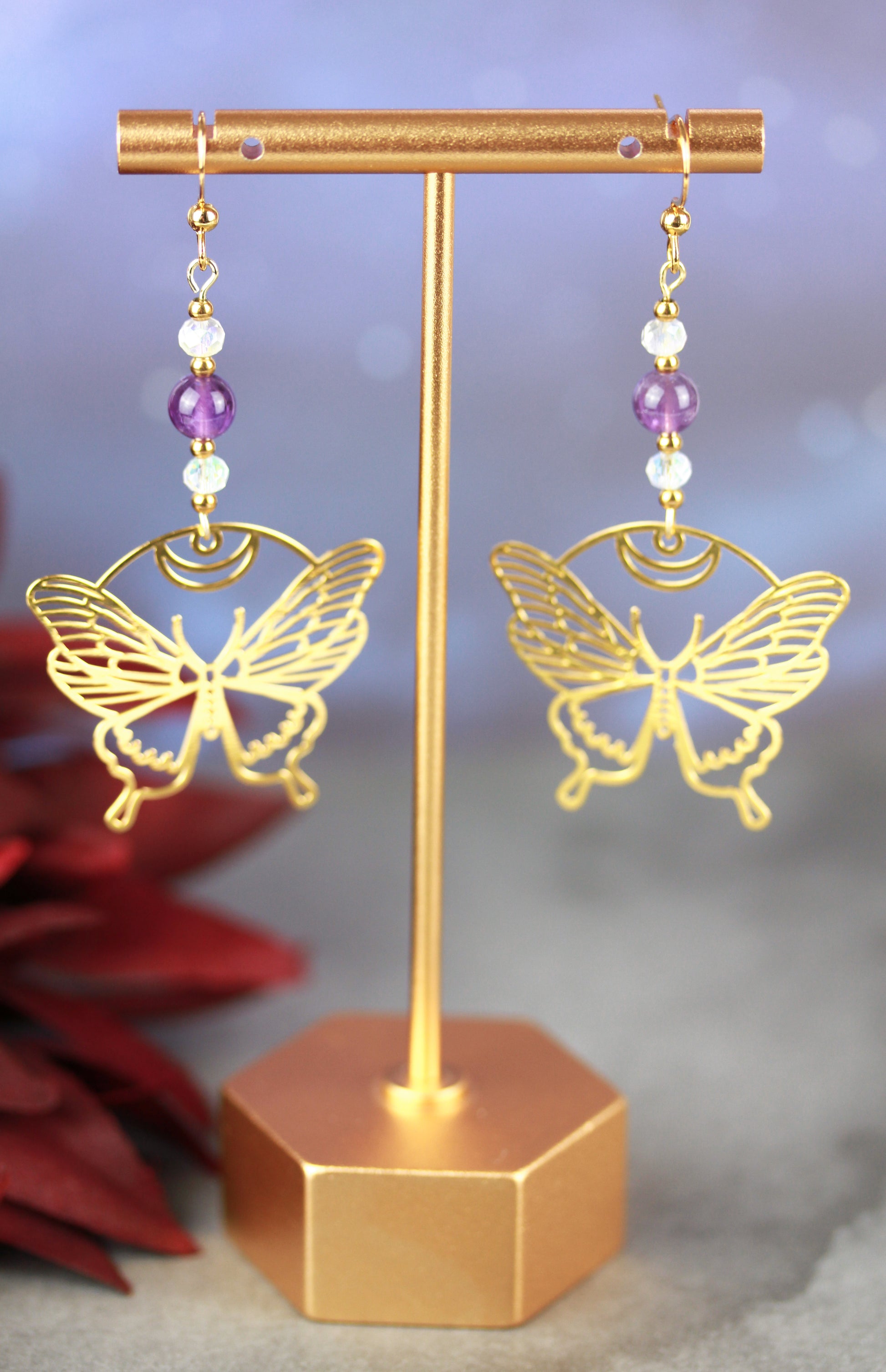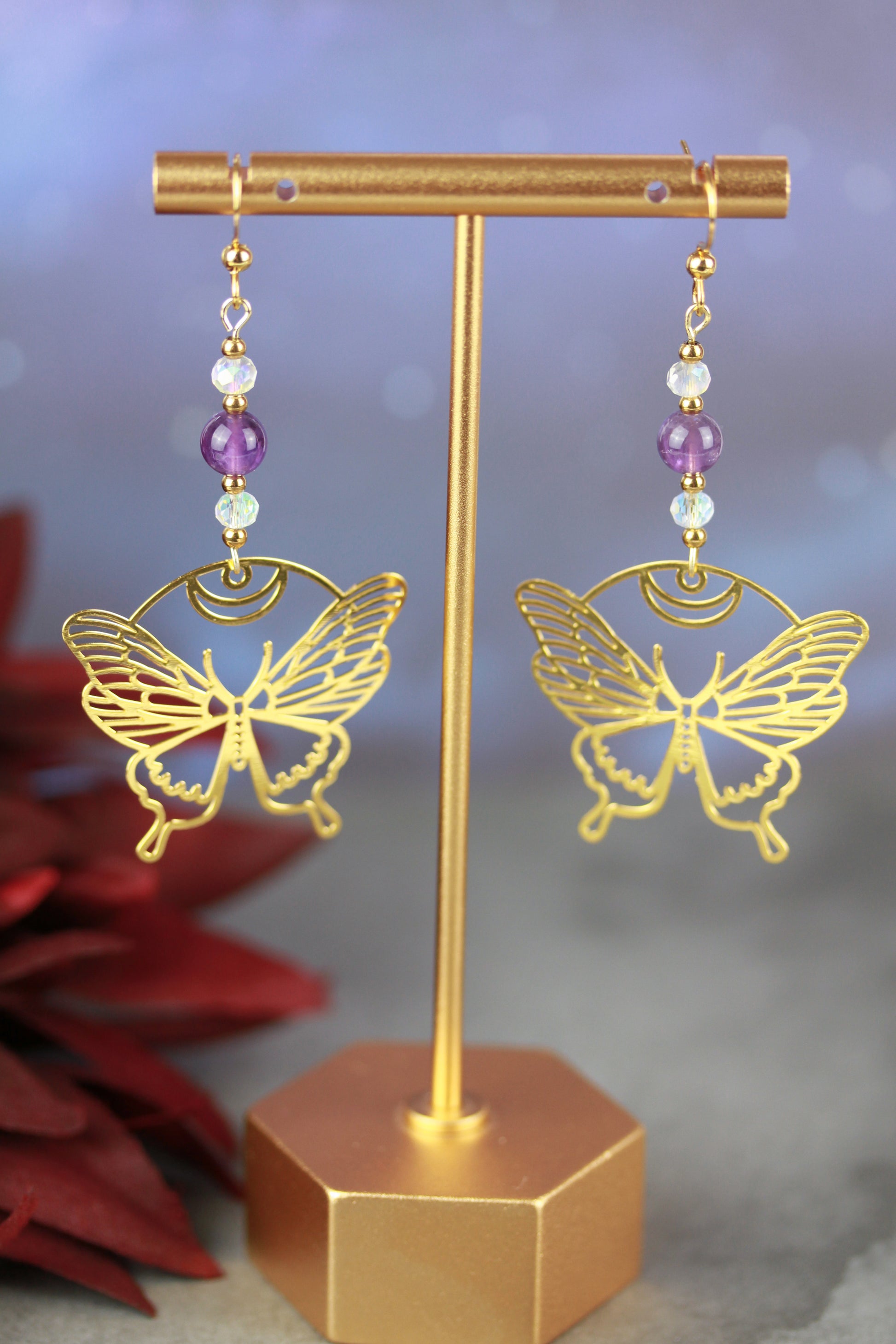 Golden Butterfly Ohrringe mit Amethyst Natursteinperlen – Mystora Kollektion