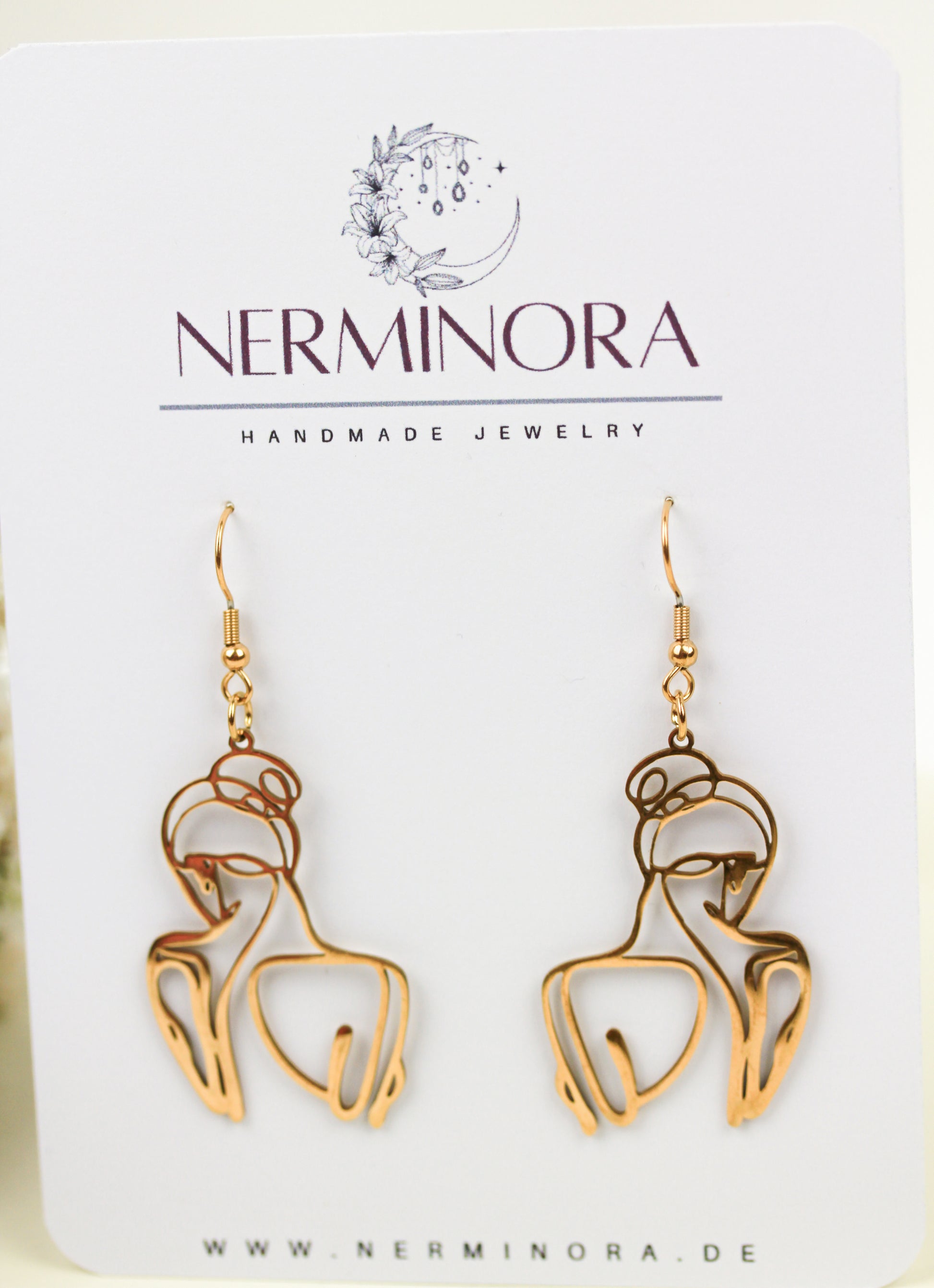 Gefertigt aus hochwertigem, goldfarbenem Edelstahl, zeigen sie die stilisierte Silhouette eines weiblichen Körpers – elegant reduziert, kraftvoll und zugleich anmutig.