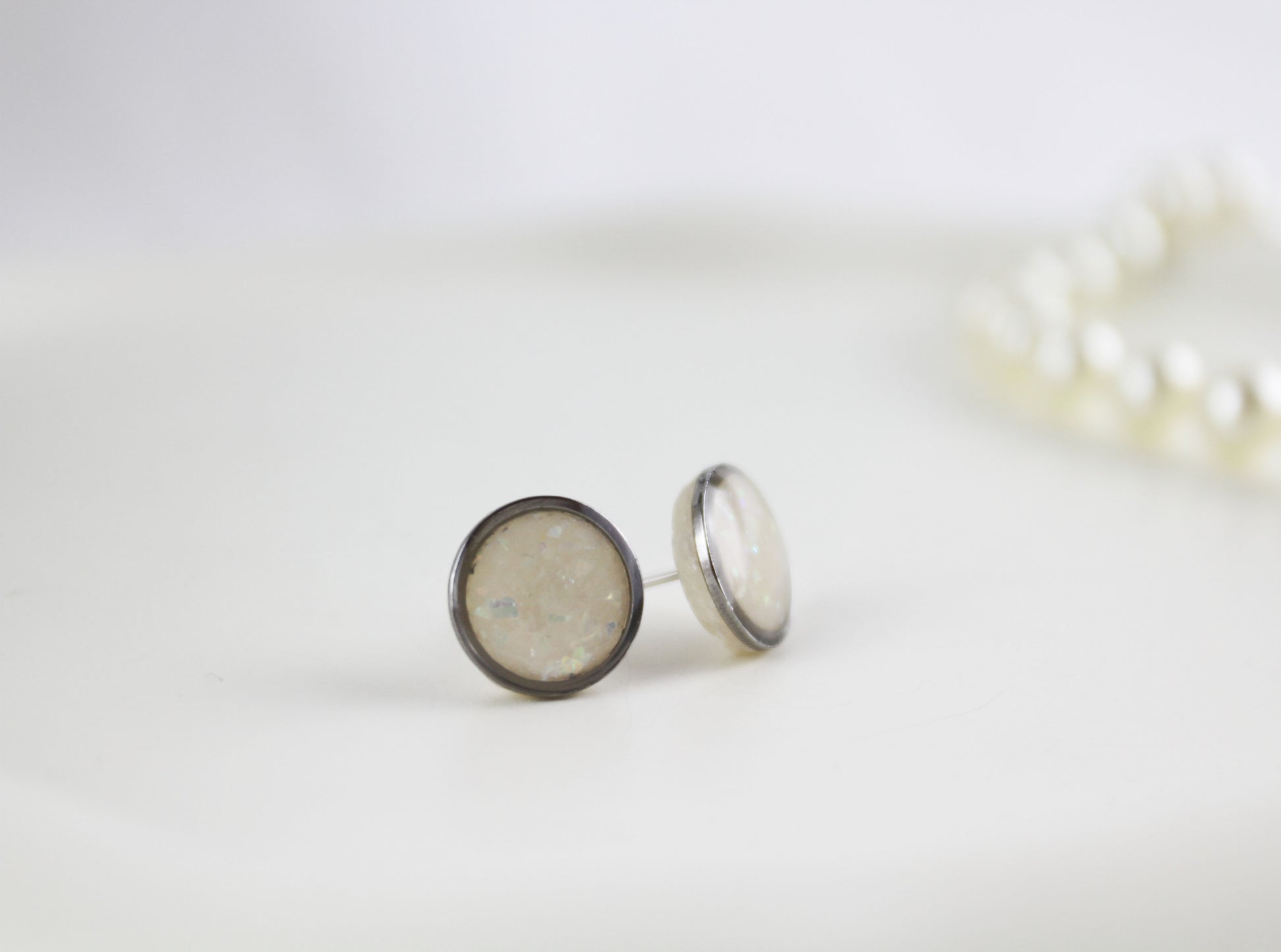 Weiß-Beige Opal Ohrstecker – Glitzernde Brautohrringe aus Polymer Clay